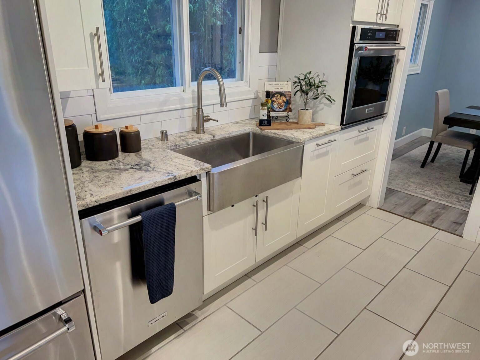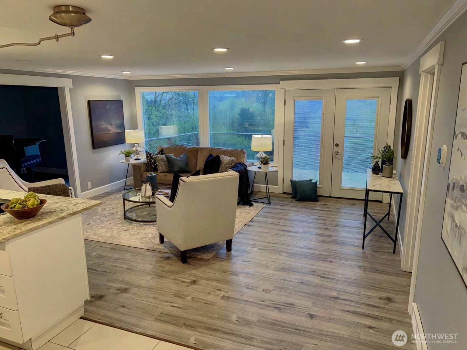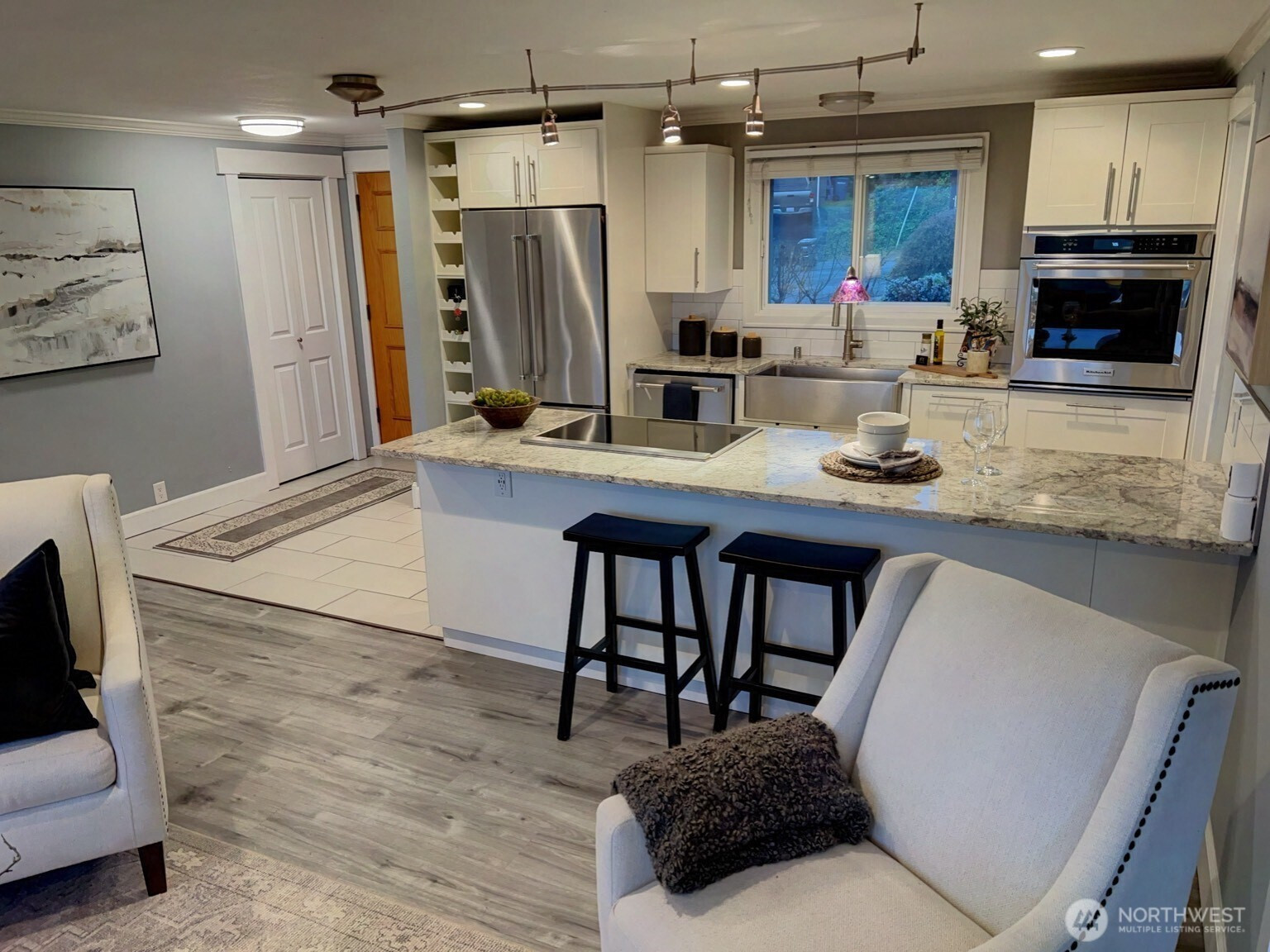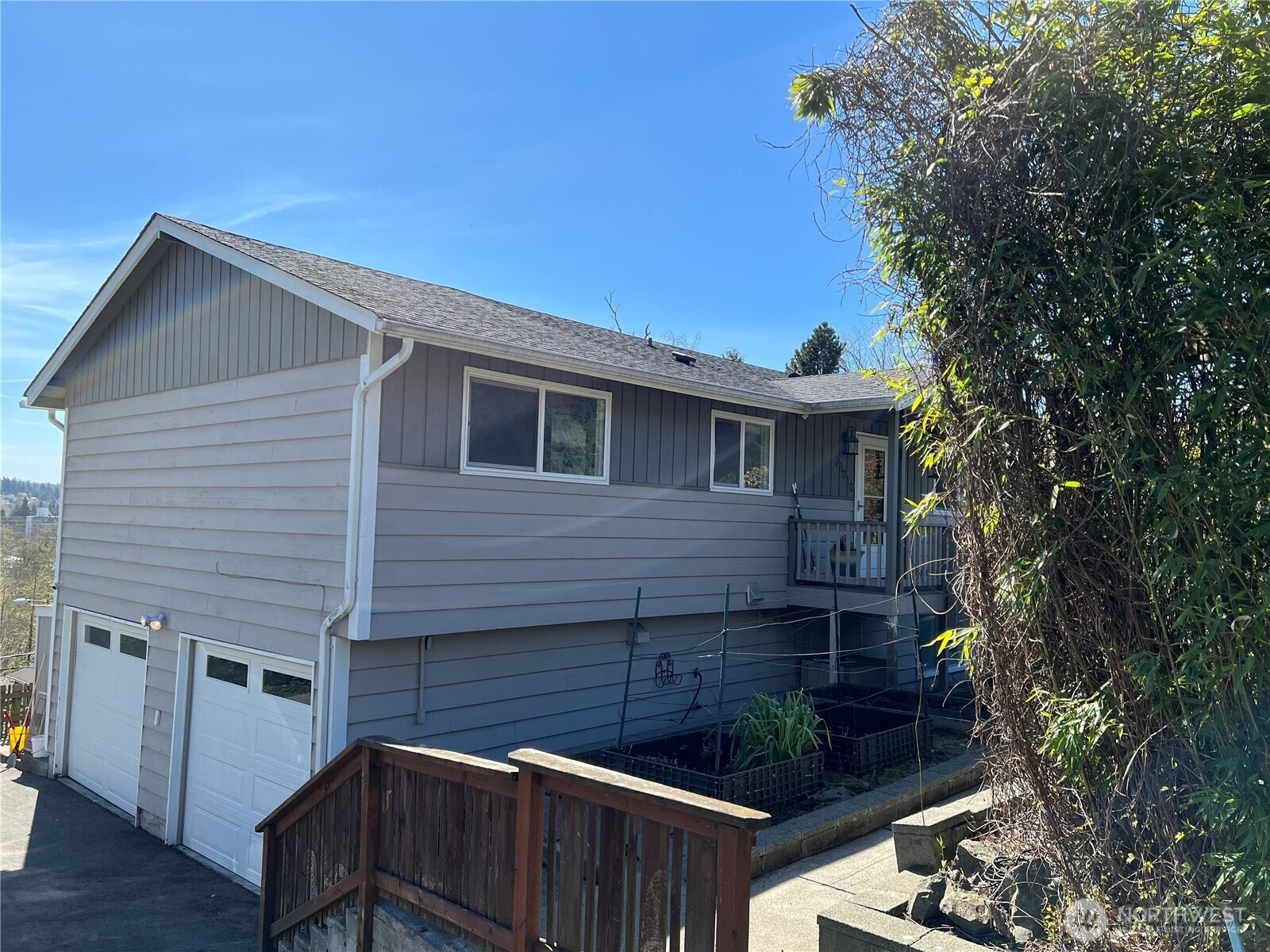 Charming, one-story VIEW home with daylight basement on sought-after North Hill in Des Moines! Main floor features 3 bedrooms, 1 updated bath, an open-concept kitchen and living area with breathtaking Mount Rainier views plus a partial Puget Sound vista and a spacious dining room. The kitchen features quartz countertops, newer stainless steel appliances and a stylish sink. Main level flooring is engineered hardwood. Lower level offers a 2-car garage, 1 additional bedroom, 1 updated bath with large walk-in shower, a relaxing sauna (with a view of Mount Rainier!), office space and a comfortable living space. There is room and plumbing downstairs for a second kitchen - perfect for ADU or MIL setup if desired. Interior has been almost entirely updated over the past 5 years. Updates include newer decks, trim, modernized bathrooms, kitchen and flooring. Just a short drive to the marina, airport and light rail - perfect location, privacy and views!