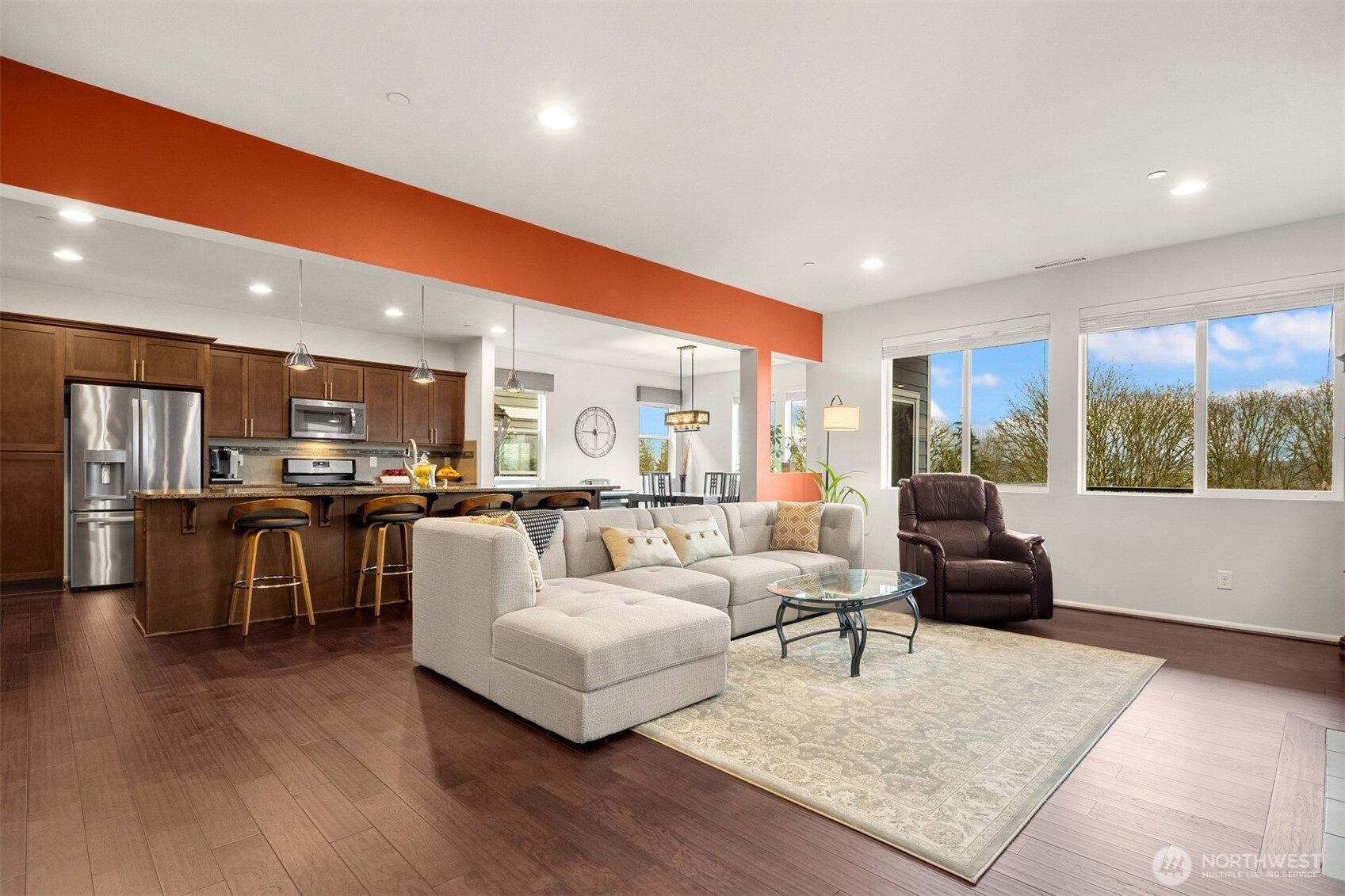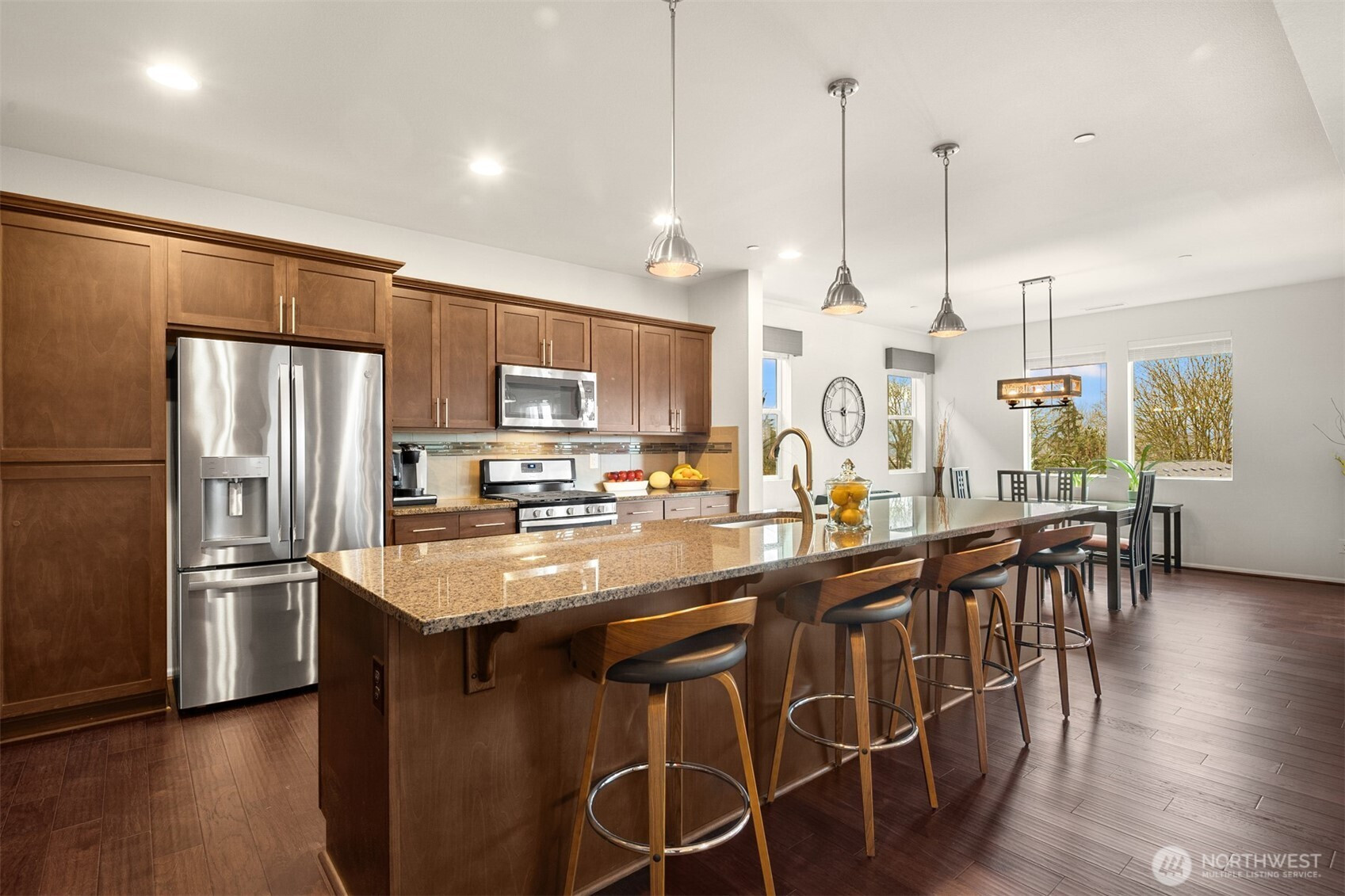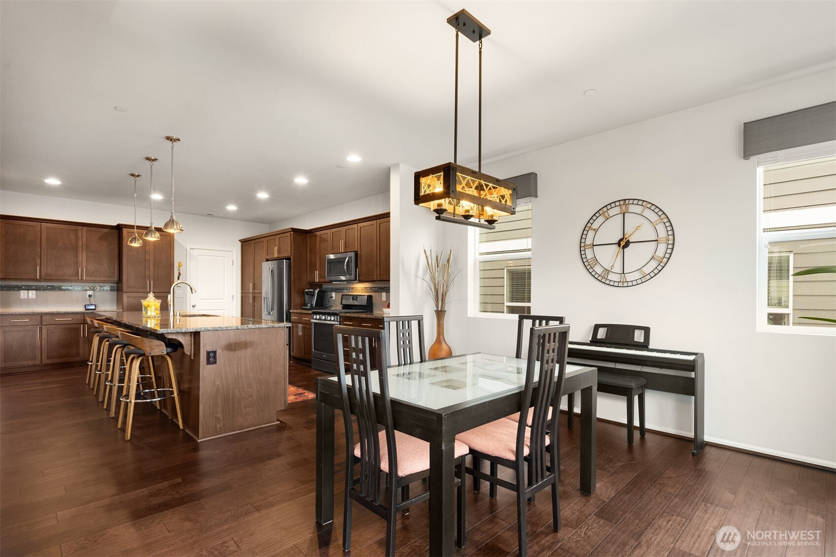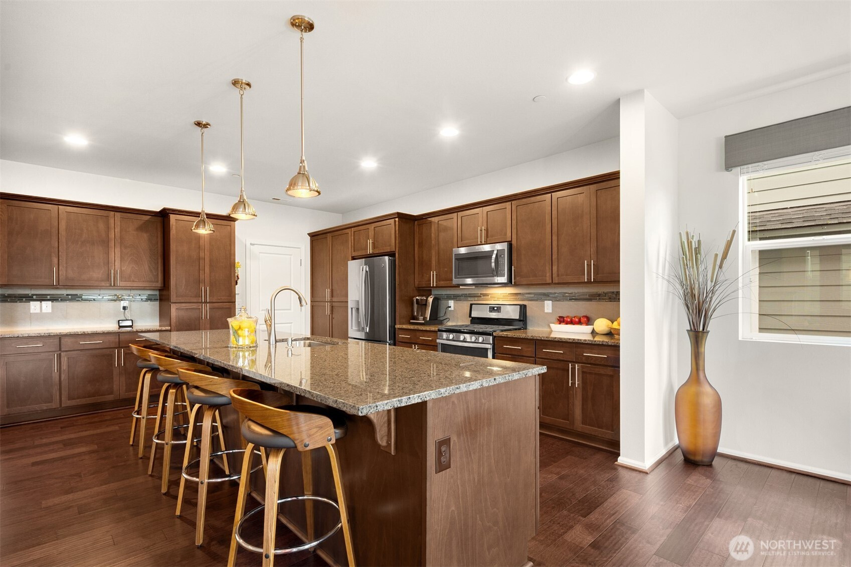 This beautifully charismatic stand-alone Craftsman with dramatic Mt. Rainier and valley views is an excellent example of one-owner pride of ownership and practical improvements to boot—making this a better-than-new, turnkey offering and exceptional value. Grand entry with impressive 2-story foyer. 5-bed/3.5-bath home (one of the most desirable floor plans and locations in Mountain View) with high-end finishes, immaculate wood floors, and a huge window count! Main floor features open-concept living with wall-to-wall hardwoods throughout, cozy gas fireplace in the living room, gourmet kitchen with an oversized island and gas cooking, dining room, powder room, and rare spacious covered balcony. Upper level with an expansive flex area, owner’s suite with walk-in closet and spa-like 5-pc bath. 3 spacious bedrooms, double-vanity full bath, and dedicated laundry room. Lower level with massive living space, 1-bed/1-bath, 9' ceilings, bonus finished room, and separate walk-out access to the fully fenced backyard with paver patio, low-maintenance turf, and hard-to-find views from the lower level—great flexibility to accommodate multi-generational living. A/C and wired for EV charging. Close to the community park. Minutes to I-5, the airport, and shopping.