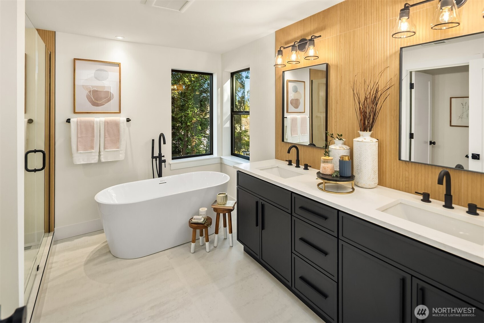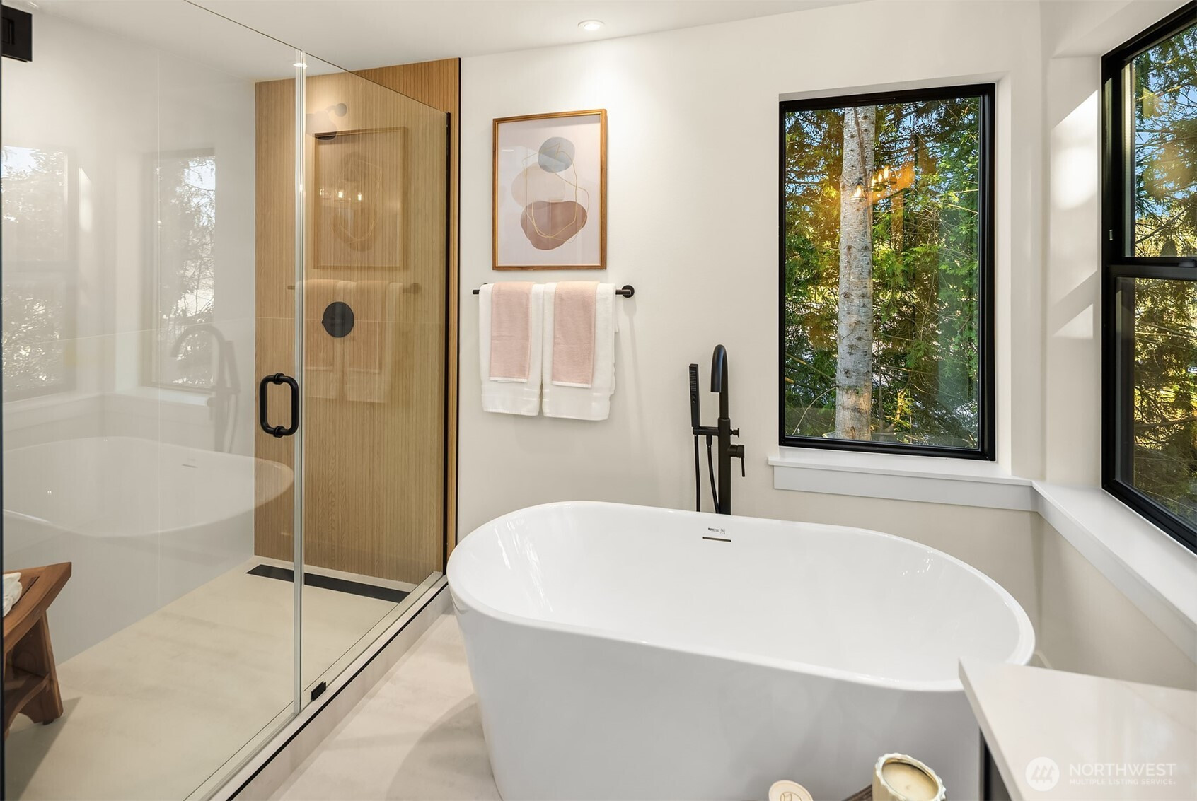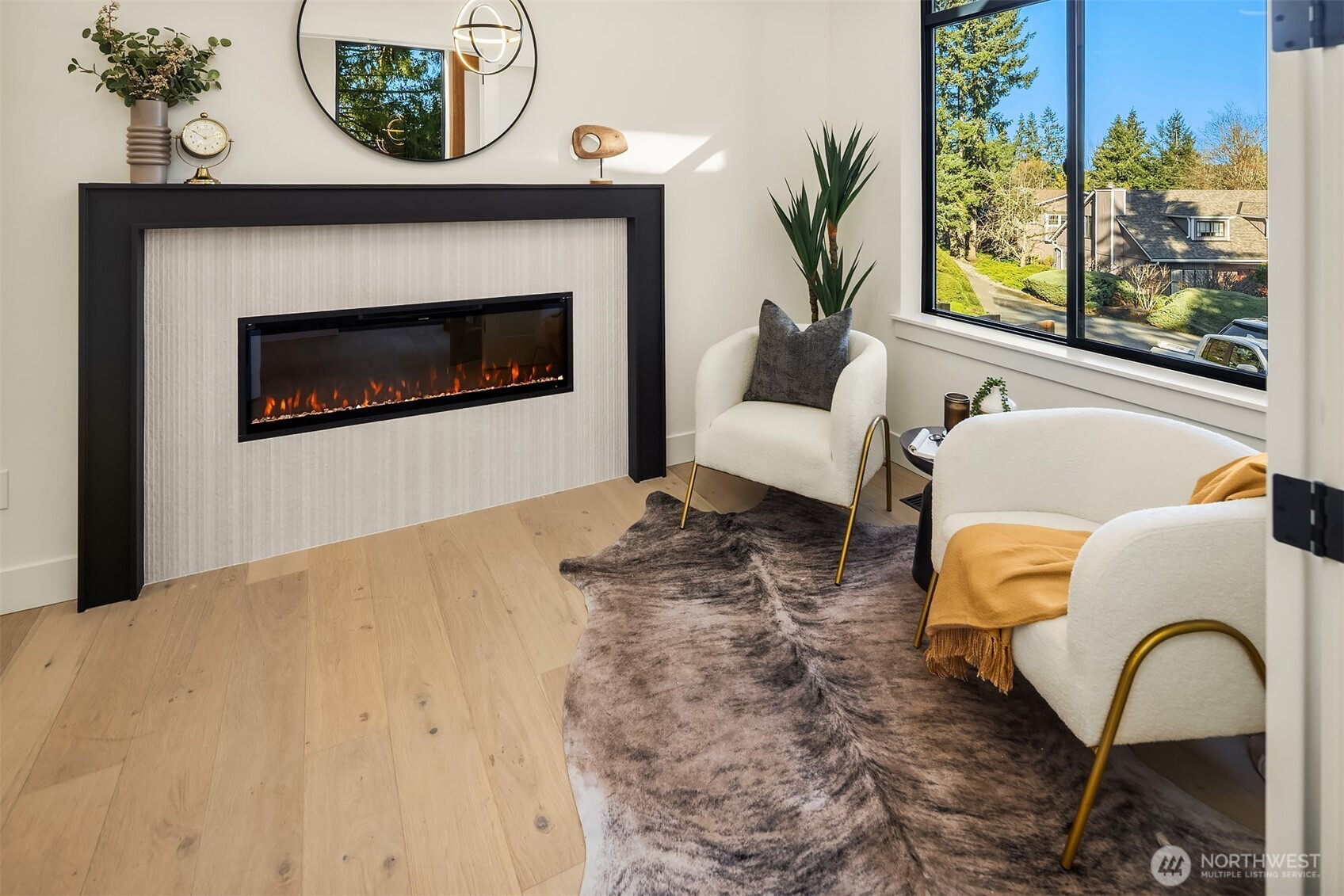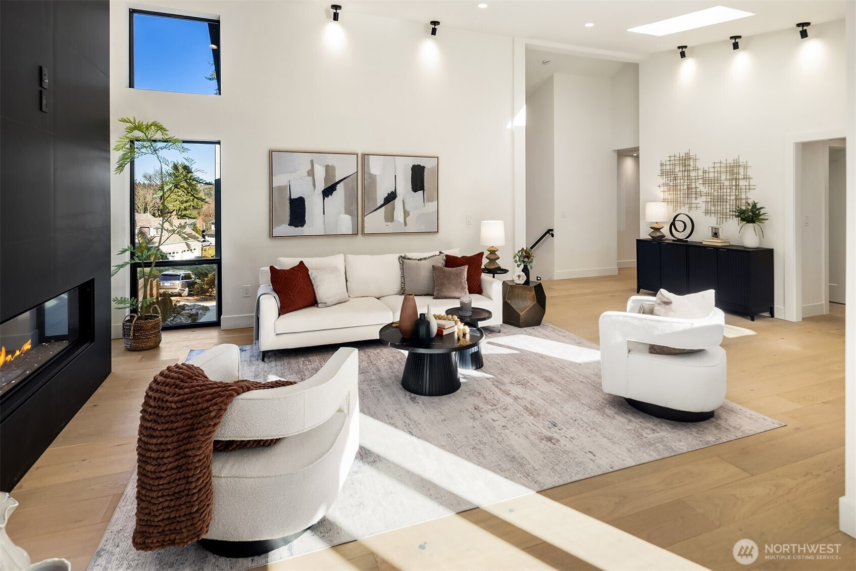 This beautiful high-end custom home is tucked away in a Bellevue cul-de-sac. Its high ceilings, large windows and strategically placed skylights allow plenty of sunlight to pour in. The open and spacious layout of the interior has 4 bedrooms, 4 1/2 bathrooms with heated flooring in the master bathroom, a spacious dining room area integrated with a modern kitchen, 4 state-of-the-art fireplaces, and a separate den that can be used as an office. The basement has its own bedroom, bathroom which could be a multi-generation living. Central A/C. Two-car garage with extra space for storage or workshop. Luxurious interior and exterior finishes throughout. Surrounded by beautiful greenery with a patio that provides privacy. Living here, you'll be minutes away from I-405, I-90 and downtown Bellevue