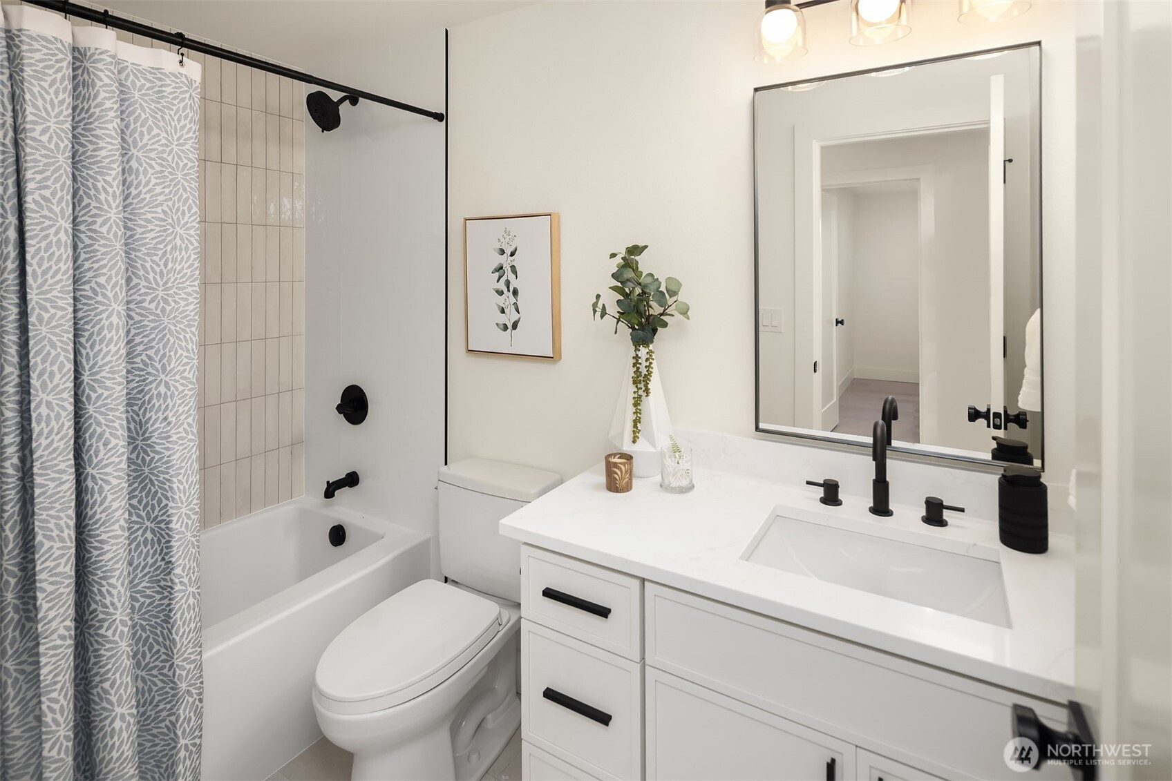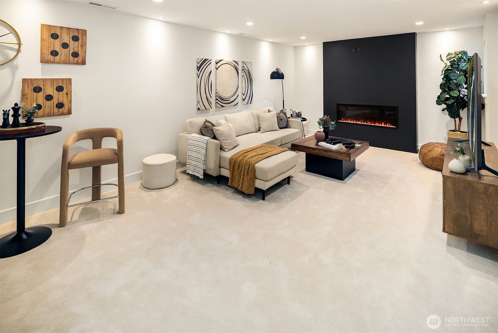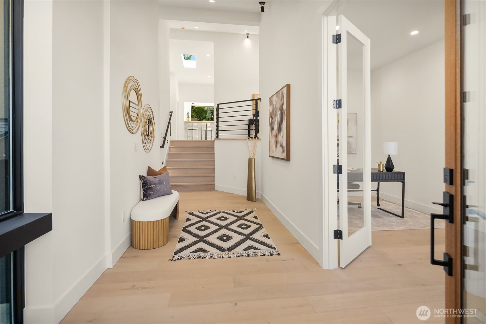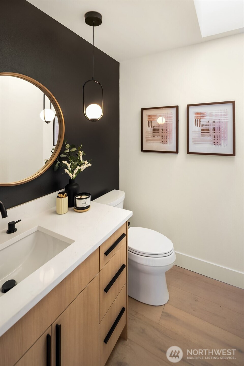 This beautiful high-end custom home is tucked away in a Bellevue cul-de-sac. Its high ceilings, large windows and strategically placed skylights allow plenty of sunlight to pour in. The open and spacious layout of the interior has 4 bedrooms, 4 1/2 bathrooms with heated flooring in the master bathroom, a spacious dining room area integrated with a modern kitchen, 4 state-of-the-art fireplaces, and a separate den that can be used as an office. The basement has its own bedroom, bathroom which could be a multi-generation living. Central A/C. Two-car garage with extra space for storage or workshop. Luxurious interior and exterior finishes throughout. Surrounded by beautiful greenery with a patio that provides privacy. Living here, you'll be minutes away from I-405, I-90 and downtown Bellevue