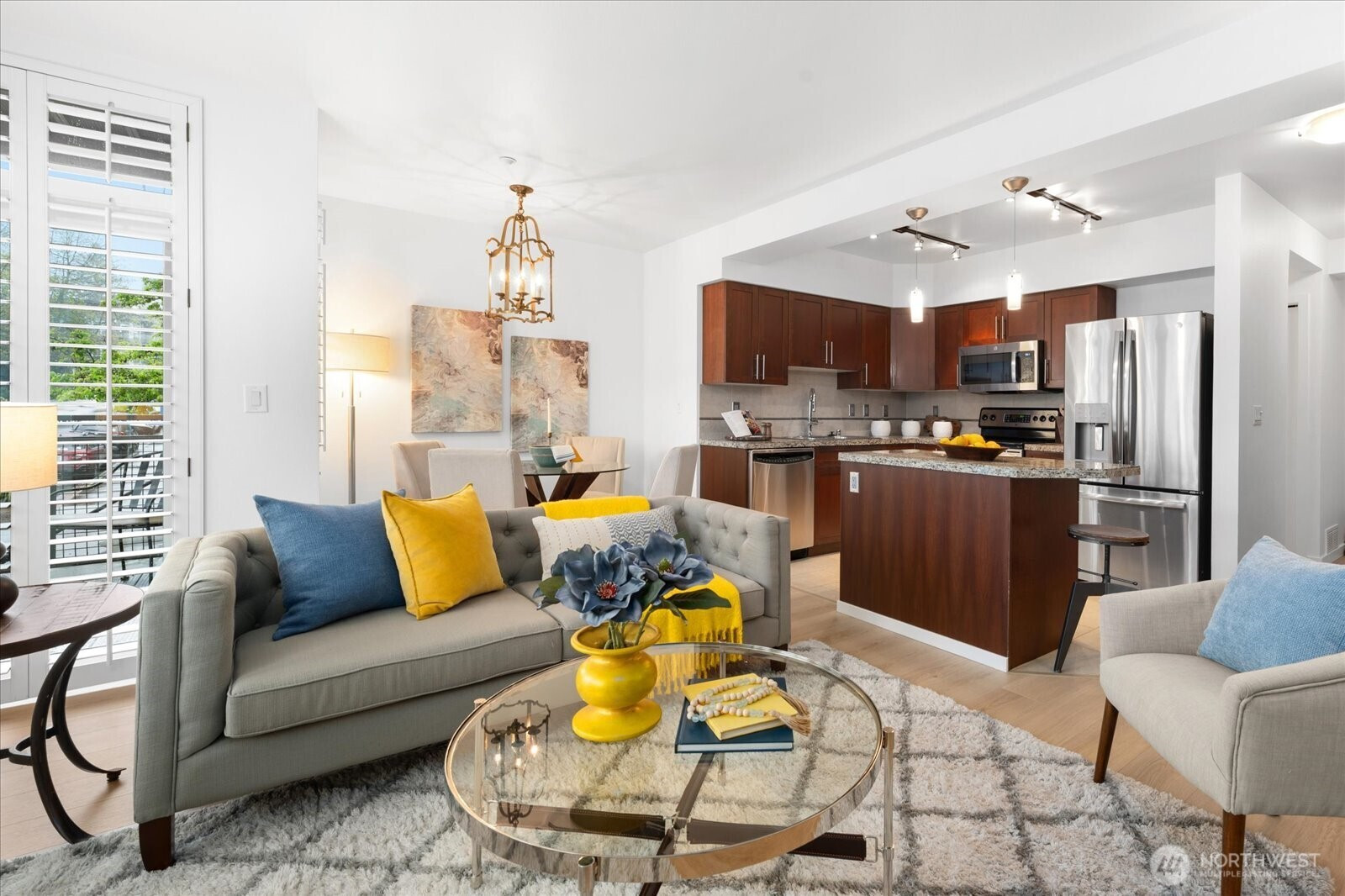 Located in the sought-after Kirkland Central community, this beautifully updated 2-bedroom, 2-bath corner residence offers exceptional privacy and one of the most desirable layouts in the building. Bathed in morning sun, the home is light-filled and inviting, with a seamless flow between living, dining, and kitchen spaces—ideal for both everyday living and entertaining. A gas fireplace anchors the living area, while a great patio just off the living room provides the perfect extension for indoor-outdoor living. Recent updates include new hard surface flooring, fresh interior paint, and timeless plantation shutters, creating a clean, polished aesthetic throughout. The generous primary suite features a large walk-in closet, while thoughtfully designed living spaces offer both comfort and functionality. Includes one dedicated parking space and private storage unit Enjoy a secure, well-maintained building with on-site management, a fitness room, and desirable community amenities. Ideally located in the heart of downtown Kirkland, just steps to the waterfront, marinas, parks, and the Cross Kirkland Corridor. Walk to grocery shopping, boutiques, and top-rated dining, making everyday living effortless. A rare opportunity to own a private corner unit in one of Kirkland’s most coveted communities, offering refined living in an unbeatable, walkable location.