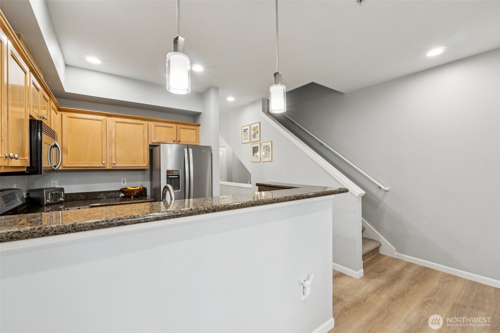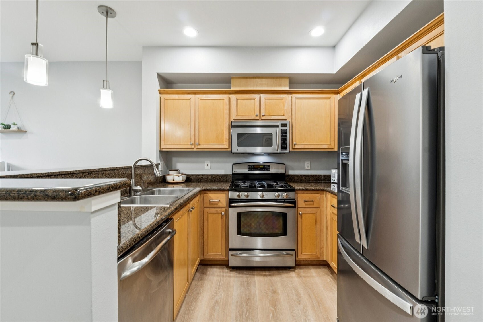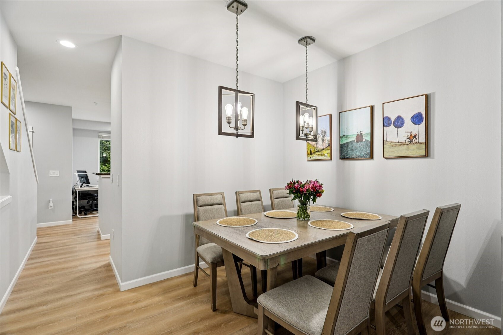 Find this warm and inviting, recently updated 2-bedroom, 2-bath townhouse-style condo at Peregrine Point. Wake up to peaceful Lake Sammamish views with easy access to local amenities and the freeway. Directly across the street, enjoy the fully paved 11-mile East Lake Sammamish Trail—perfect for walking, running, or biking. The open-concept main level features a cozy gas fireplace, radiant heated floors, updated wide-plank LVP flooring, gas cooking, a dining area, and newly installed recessed lighting. Upstairs, both bedrooms are spacious, including a primary suite with an ensuite bath and a second bedroom with a large walk-in closet. Bathrooms have been tastefully updated. A two-car tandem garage features an extra storage closet and the newer water heater. The HOA provides low-maintenance living, covering insurance, all landscaping, exterior maintenance, and a recently painted exterior. Welcome Home!