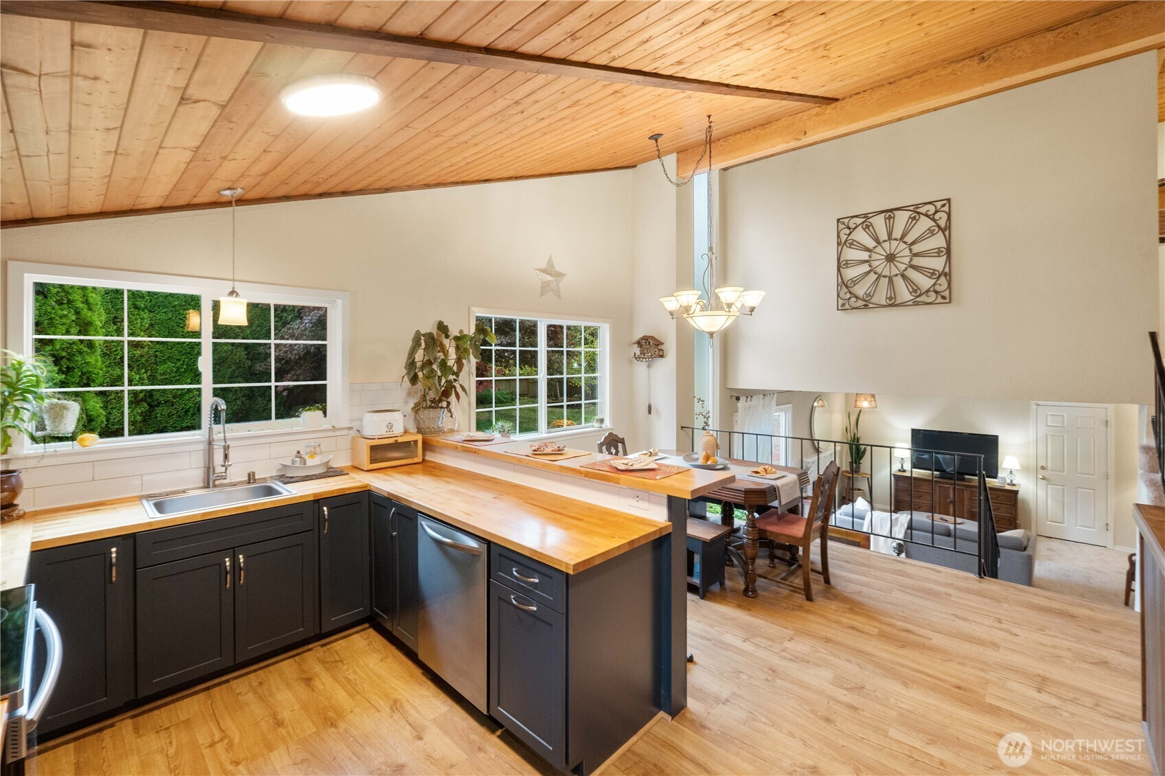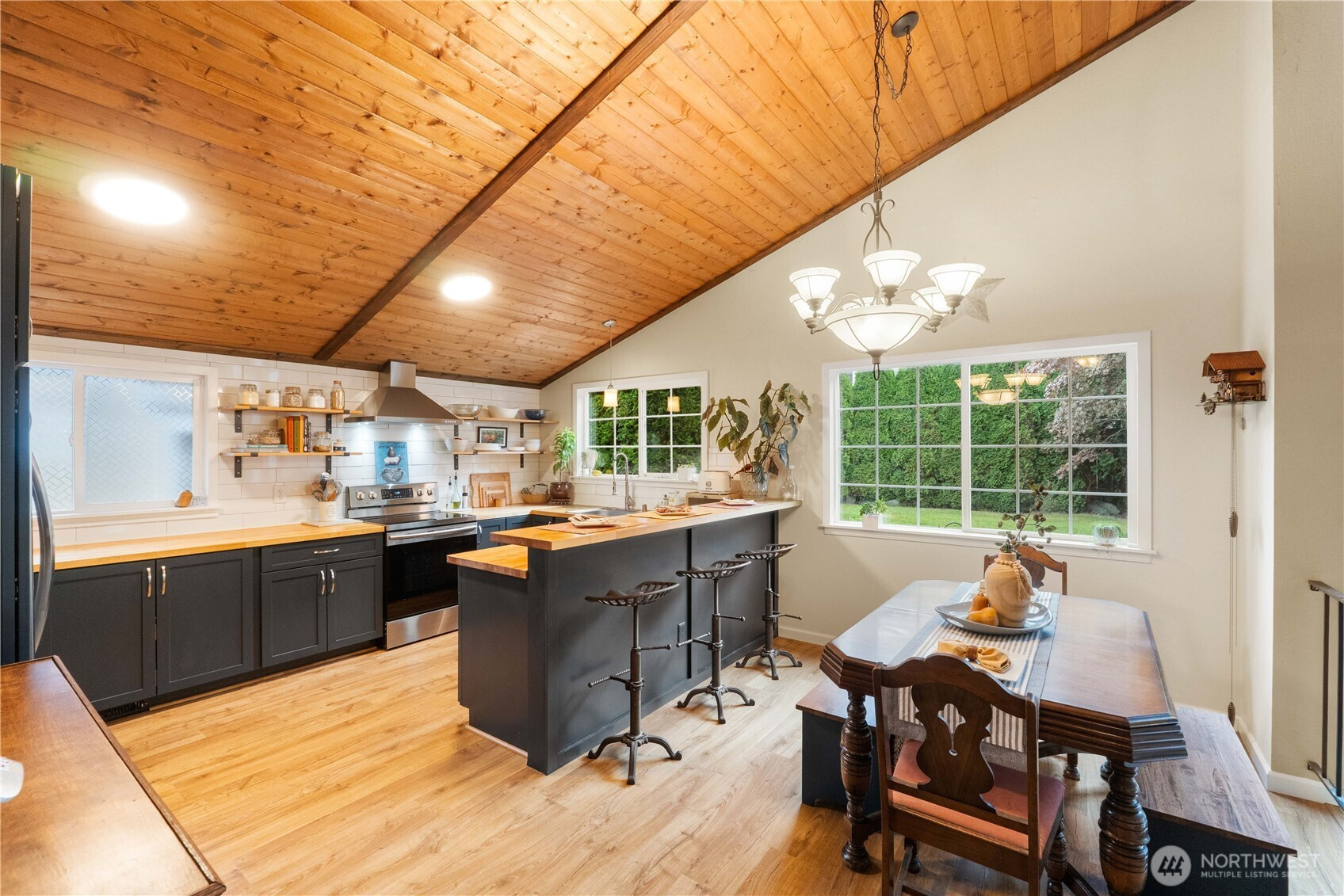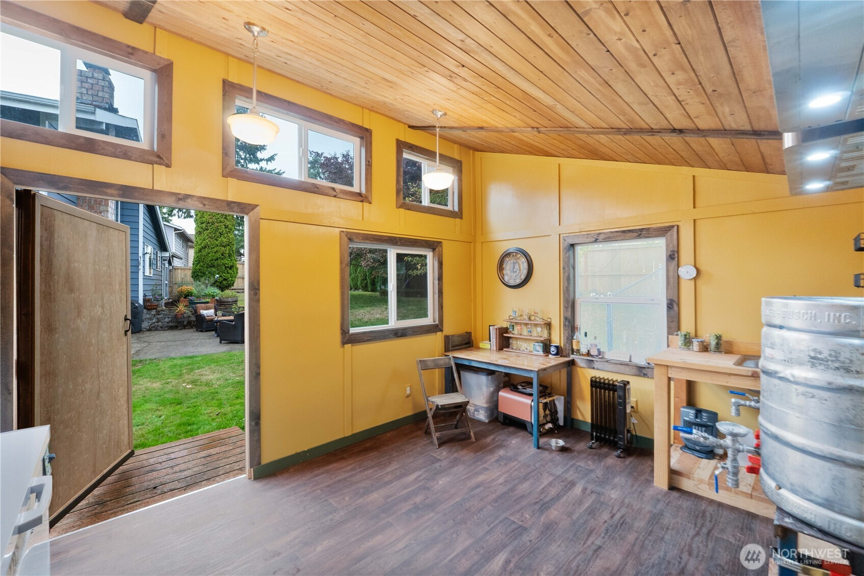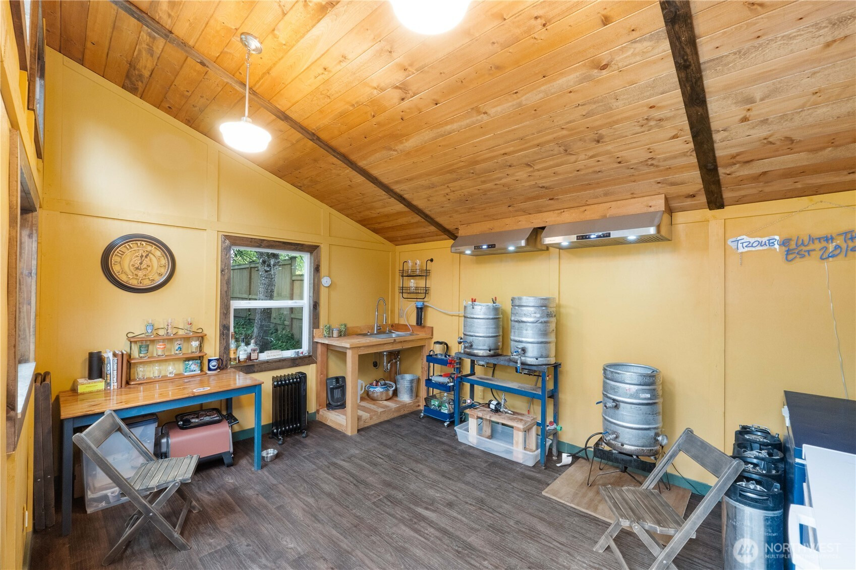 Fantastically updated home in established Kent neighborhood with mature trees is convenient to Gary Grant Park, Soos Creek Trail, and multiple schools. This 4-bed, 2.5-bath home features a fully-equipped outbuilding with water and heat — ideal for studio, office, or guest suite. Absolutely gorgeous kitchen remodel showcases white subway tile, custom cabinetry, new stainless appliances, butcher-block counters, and abundant breakfast bar with separate dining. Main level interior features soaring vaulted tongue-n-groove wood ceilings. Private yard with new cedar fence is perfect for outdoor entertaining. Updates to the home include vinyl plank flooring, tiled ensuite bath, new windows, water heater, and carport. Truly turnkey & move-in ready!!
