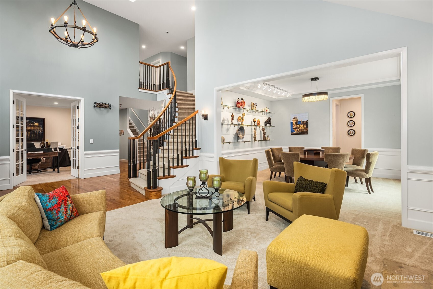 On likely the largest lot in Aldarra Estates, coming in at 0.55 acres this home sits proudly up & above for picture-prefect, year-round panoramic views of the Cascade mtn range enjoyed from nearly every room in the house. This Murray Franklyn signature residence w/a palatial double-door entry leads into glistening hardwood flooring & dramatic curved staircase w/open views to the formal areas. Glass French doors open to lg office. A butler's pantry w/custom cabinetry separates the formal dining rm from the kitchen. The kitchen is a chef's paradise: raised-panel wood cabinets, double ovens, gas range & professional vent hood, two under-mount sinks, quartz counters, beautiful centered island, plus custom-built walk-in pantry. Separate mother-in-law apt on main flr for guests/multigenerational living. Upstairs the Primary Suite enjoys a fireplace and spa-like bath w/quartz counters, undermount sinks, wood-wrapped mirrors, & customized, dual walk-in closets. The three secondary bedrms are all ample in size w/large closets & remodeled bathrms. The Bonus rm is super-scaled for a multitude of uses including custom-built entertainment center, desks & fitness cabinet with hideaway treadmill. Four-car garage has customized cabinet & strong iron shelving. Step outside for six months of entertaining on the spacious deck. Sip on morning coffee or afternoon drinks & BBQ while you & your closest soak up the views & the exquisitely landscaped yard. Come to make a lifetime of memories!