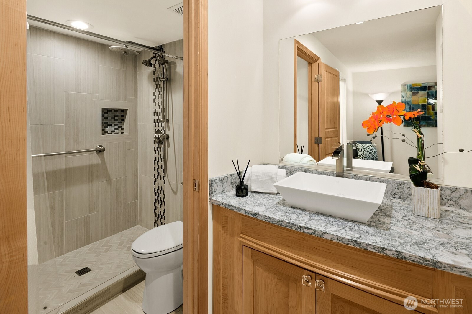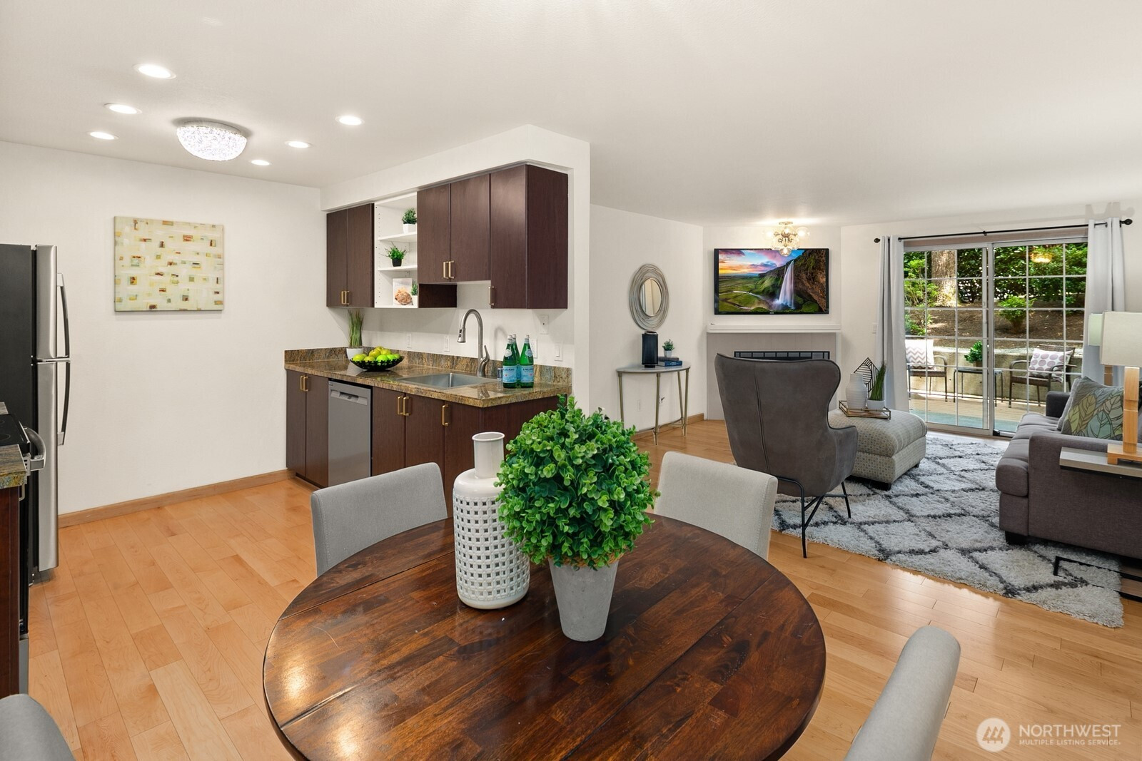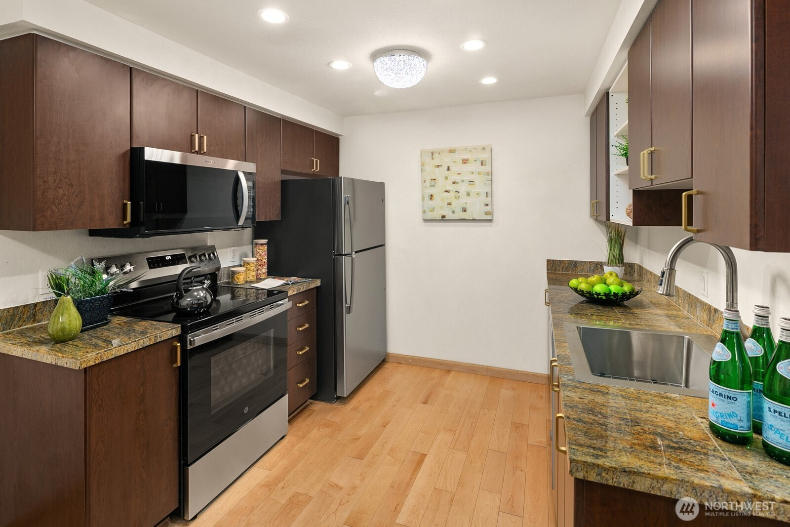 Welcome to Gallery Condominiums! This spacious 2BR/2BA ground-floor unit offers a perfect blend of comfort & convenience in a prime Kirkland location. Enjoy the open layout featuring a cozy gas fireplace, updated kitchen w/ granite counters, brand new SS appliances, & warm wood cabinets. Beautiful hardwood floors and doors! The modern bathrooms are tastefully remodeled, & the in-unit washer/dryer adds everyday ease. Relax on your private patio with garden views, just steps from landscaped grounds. Amenities include a pool, hot tub, gym, clubhouse, & assigned covered parking. Ideally located near DT Kirkland, restaurants, shops, transit, parks & the lake. Don’t miss this opportunity to live in a hip/trendy Kirkland Community. No Rental Cap.
