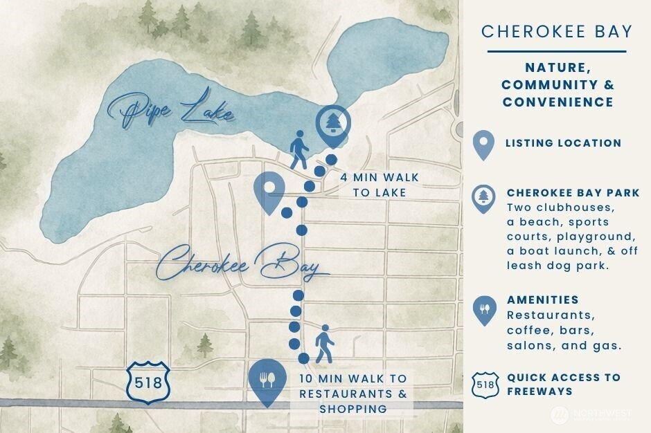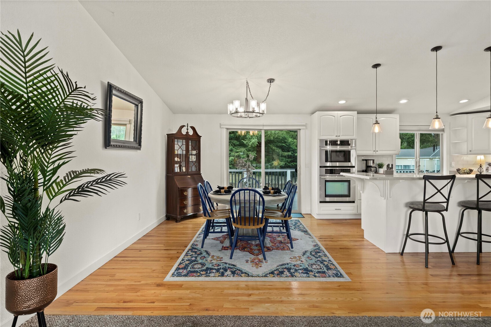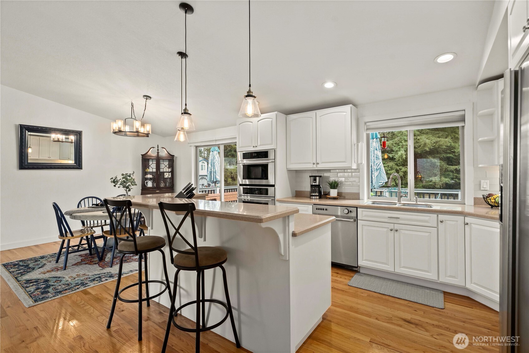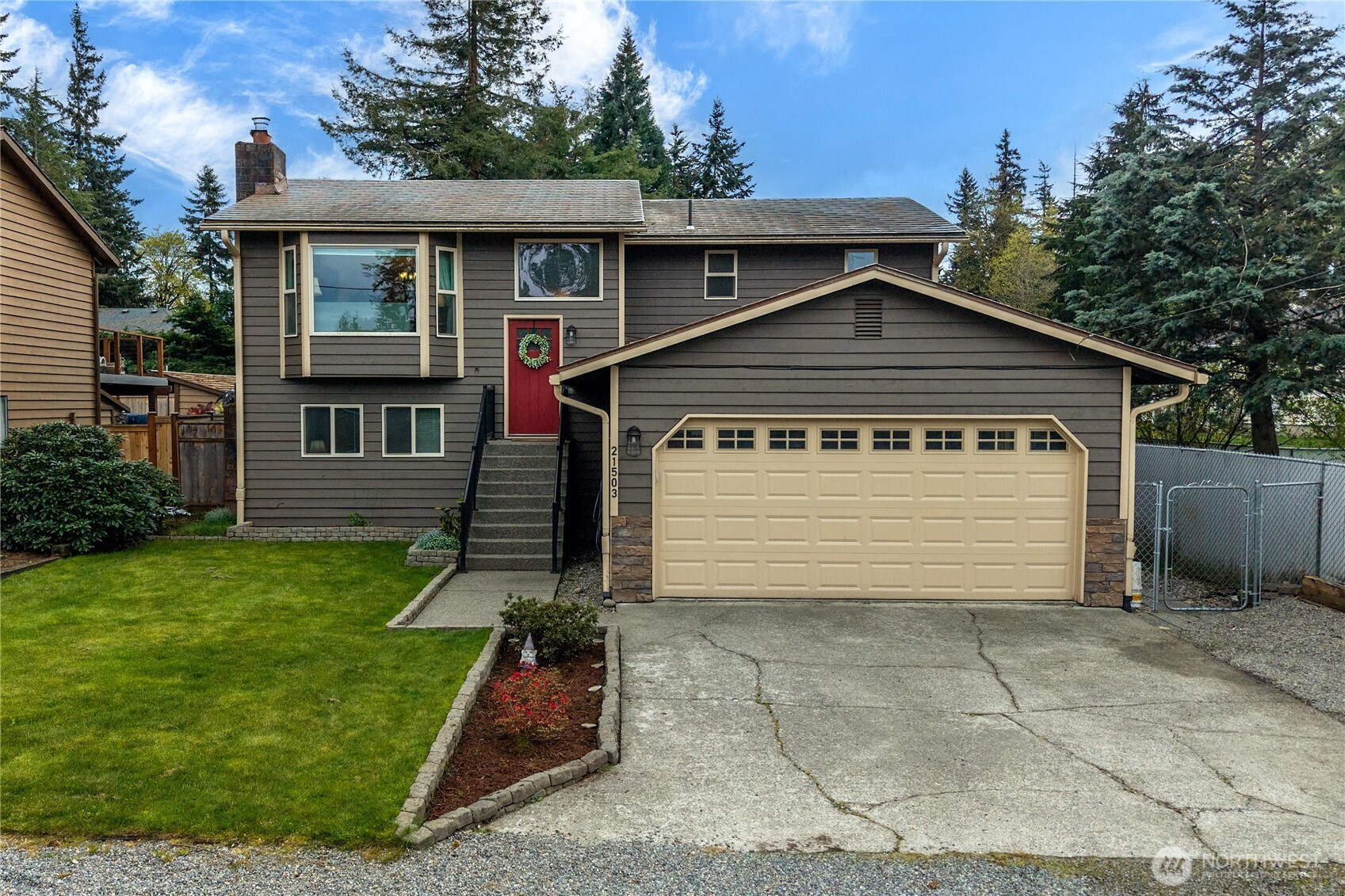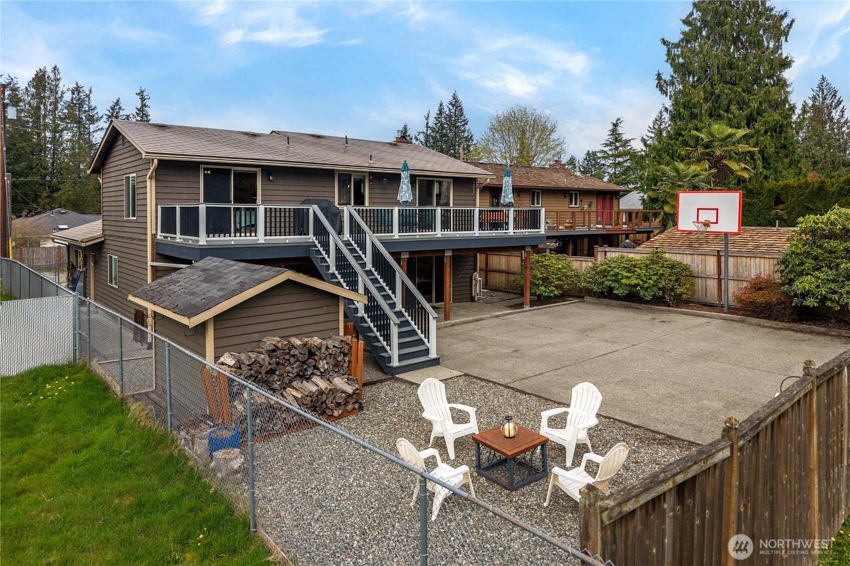 Open, bright, and thoughtfully laid out, this Maple Valley home offers comfortable living spaces and easy indoor-outdoor flow. The main living area features vaulted ceilings and a large bay window that fills the space with natural light. The kitchen showcases solid oak hardwood floors, white cabinetry, stainless steel appliances, wall oven, durable solid surface counters, a pantry, and a generous center island with seating. The adjacent dining area opens to a large deck, creating a natural extension of the living space for gatherings and outdoor enjoyment. The primary bedroom is light-filled and inviting, complete with its own slider opening directly to the patio. Downstairs, a spacious bonus room with fireplace and sliding glass door leads to a fully covered patio with a built-in gutter system, allowing for comfortable outdoor use throughout the seasons. Two additional bedrooms are located on the lower level along with a full and half bath, offering flexibility for guests, work-from-home needs, or hobbies. The fully fenced backyard is designed for both recreation and relaxation, featuring a basketball court and storage shed. Located near Cherokee Bay, enjoy community amenities including HOA dues that cover water, plus lakeside park access just steps away with a playground, boat launch, sport court, and more. Convenient access to major highways keeps commuting simple while nearby outdoor amenities make it easy to enjoy the Maple Valley lifestyle.
