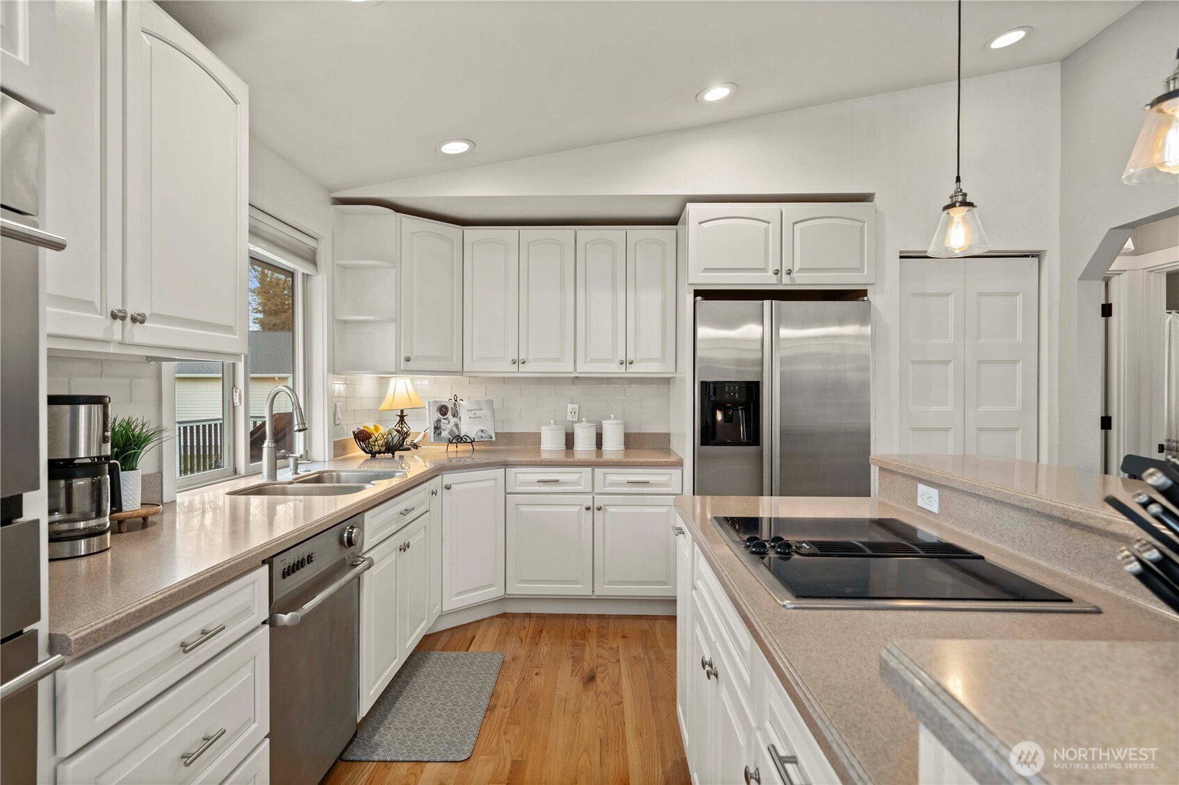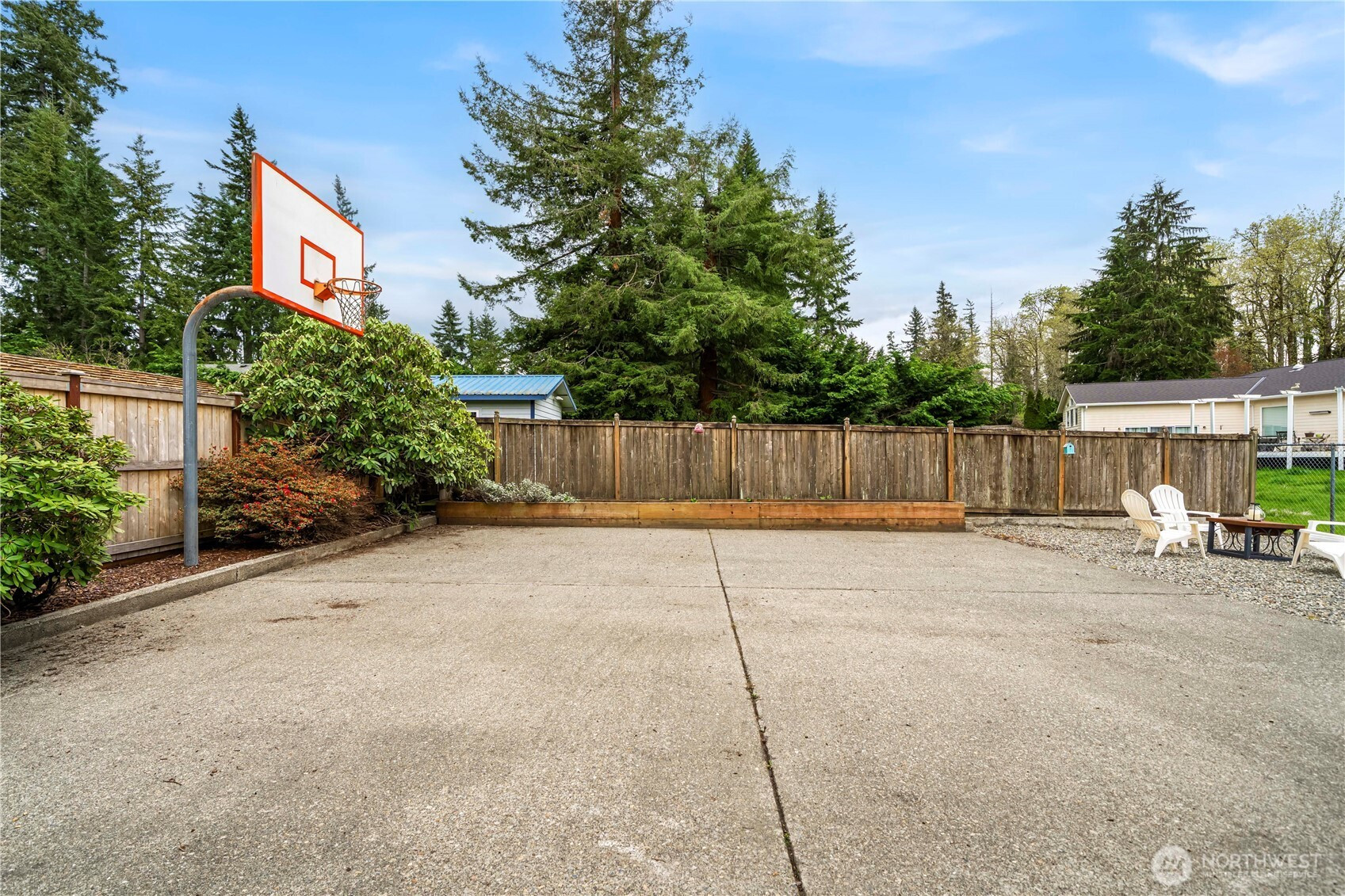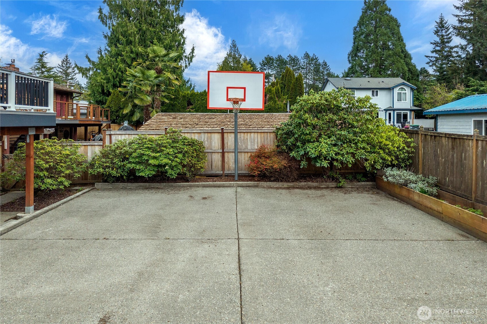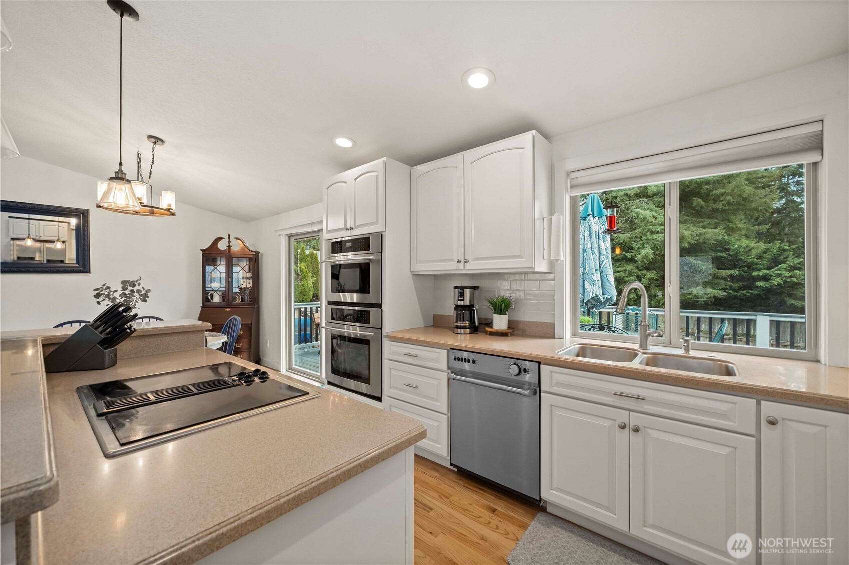 Open, bright, and thoughtfully laid out, this Maple Valley home offers comfortable living spaces and easy indoor-outdoor flow. The main living area features vaulted ceilings and a large bay window that fills the space with natural light. The kitchen showcases solid oak hardwood floors, white cabinetry, stainless steel appliances, wall oven, durable solid surface counters, a pantry, and a generous center island with seating. The adjacent dining area opens to a large deck, creating a natural extension of the living space for gatherings and outdoor enjoyment. The primary bedroom is light-filled and inviting, complete with its own slider opening directly to the patio. Downstairs, a spacious bonus room with fireplace and sliding glass door leads to a fully covered patio with a built-in gutter system, allowing for comfortable outdoor use throughout the seasons. Two additional bedrooms are located on the lower level along with a full and half bath, offering flexibility for guests, work-from-home needs, or hobbies. The fully fenced backyard is designed for both recreation and relaxation, featuring a basketball court and storage shed. Located near Cherokee Bay, enjoy community amenities including HOA dues that cover water, plus lakeside park access just steps away with a playground, boat launch, sport court, and more. Convenient access to major highways keeps commuting simple while nearby outdoor amenities make it easy to enjoy the Maple Valley lifestyle.