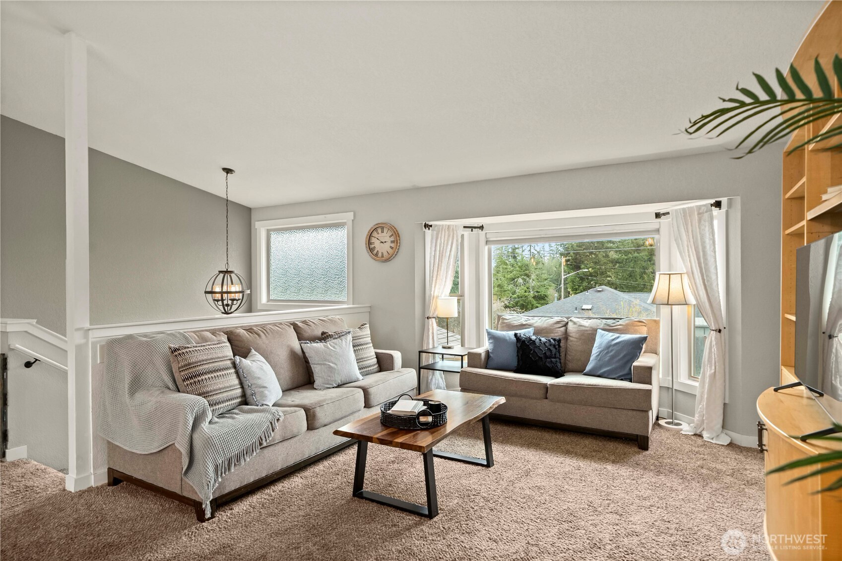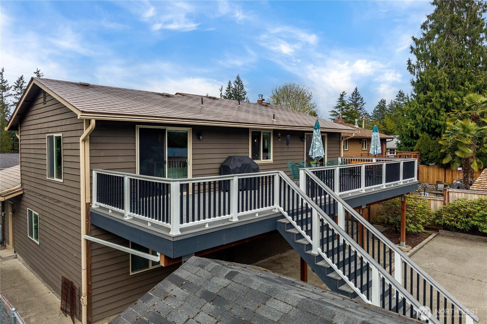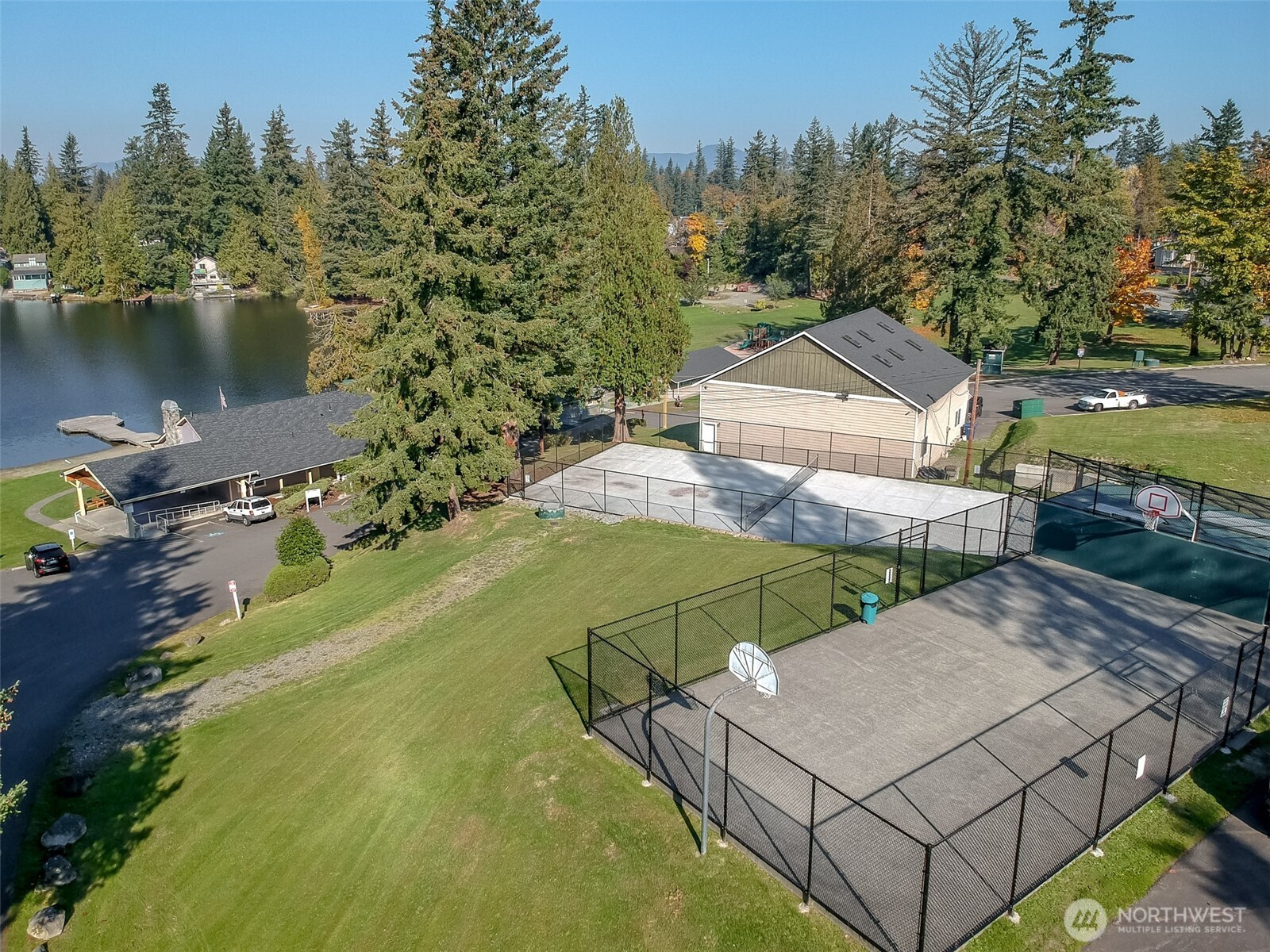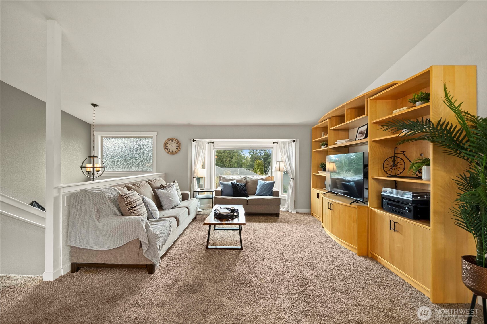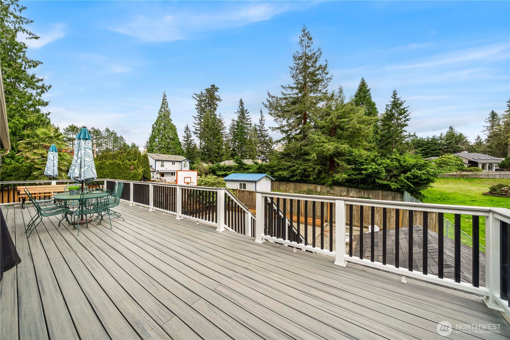 Open, bright, and thoughtfully laid out, this Maple Valley home offers comfortable living spaces and easy indoor-outdoor flow. The main living area features vaulted ceilings and a large bay window that fills the space with natural light. The kitchen showcases solid oak hardwood floors, white cabinetry, stainless steel appliances, wall oven, durable solid surface counters, a pantry, and a generous center island with seating. The adjacent dining area opens to a large deck, creating a natural extension of the living space for gatherings and outdoor enjoyment. The primary bedroom is light-filled and inviting, complete with its own slider opening directly to the patio. Downstairs, a spacious bonus room with fireplace and sliding glass door leads to a fully covered patio with a built-in gutter system, allowing for comfortable outdoor use throughout the seasons. Two additional bedrooms are located on the lower level along with a full and half bath, offering flexibility for guests, work-from-home needs, or hobbies. The fully fenced backyard is designed for both recreation and relaxation, featuring a basketball court and storage shed. Located near Cherokee Bay, enjoy community amenities including HOA dues that cover water, plus lakeside park access just steps away with a playground, boat launch, sport court, and more. Convenient access to major highways keeps commuting simple while nearby outdoor amenities make it easy to enjoy the Maple Valley lifestyle.