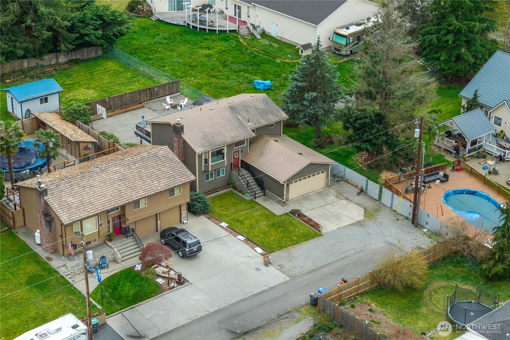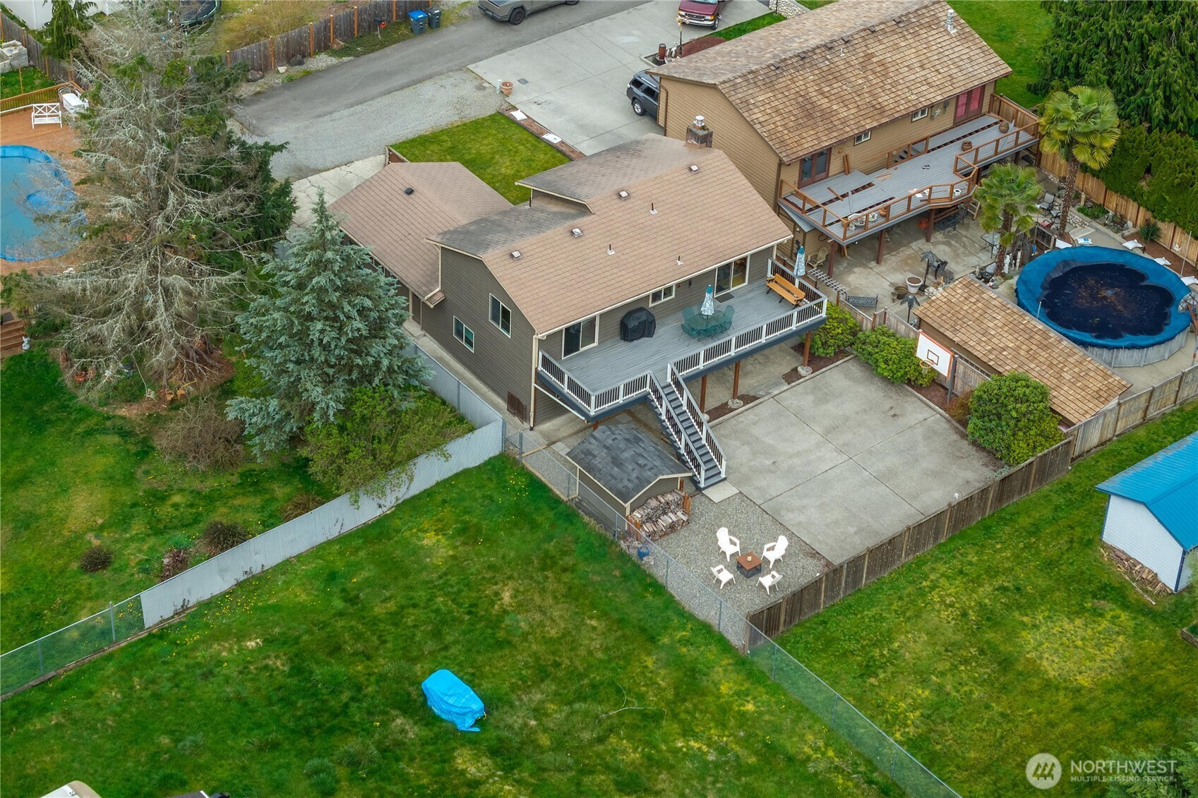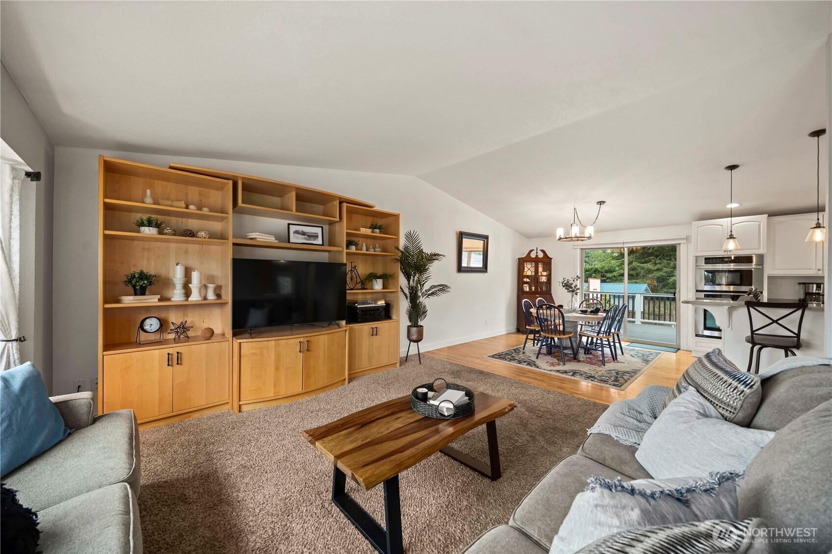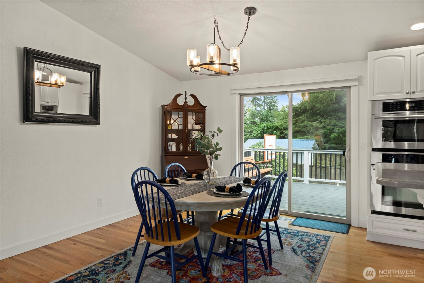 Open, bright, and thoughtfully laid out, this Maple Valley home offers comfortable living spaces and easy indoor-outdoor flow. The main living area features vaulted ceilings and a large bay window that fills the space with natural light. The kitchen showcases solid oak hardwood floors, white cabinetry, stainless steel appliances, wall oven, durable solid surface counters, a pantry, and a generous center island with seating. The adjacent dining area opens to a large deck, creating a natural extension of the living space for gatherings and outdoor enjoyment. The primary bedroom is light-filled and inviting, complete with its own slider opening directly to the patio. Downstairs, a spacious bonus room with fireplace and sliding glass door leads to a fully covered patio with a built-in gutter system, allowing for comfortable outdoor use throughout the seasons. Two additional bedrooms are located on the lower level along with a full and half bath, offering flexibility for guests, work-from-home needs, or hobbies. The fully fenced backyard is designed for both recreation and relaxation, featuring a basketball court and storage shed. Located near Cherokee Bay, enjoy community amenities including HOA dues that cover water, plus lakeside park access just steps away with a playground, boat launch, sport court, and more. Convenient access to major highways keeps commuting simple while nearby outdoor amenities make it easy to enjoy the Maple Valley lifestyle.