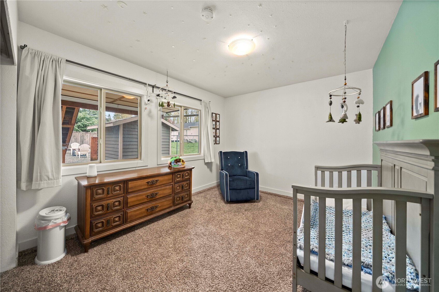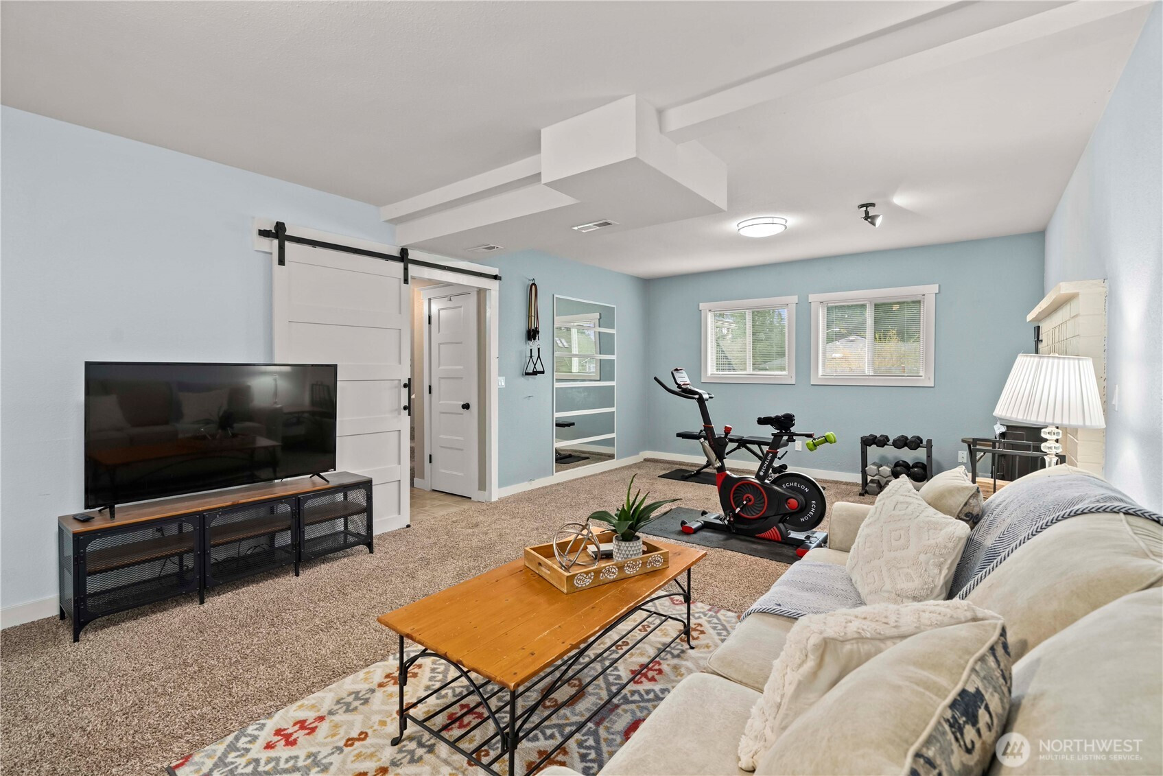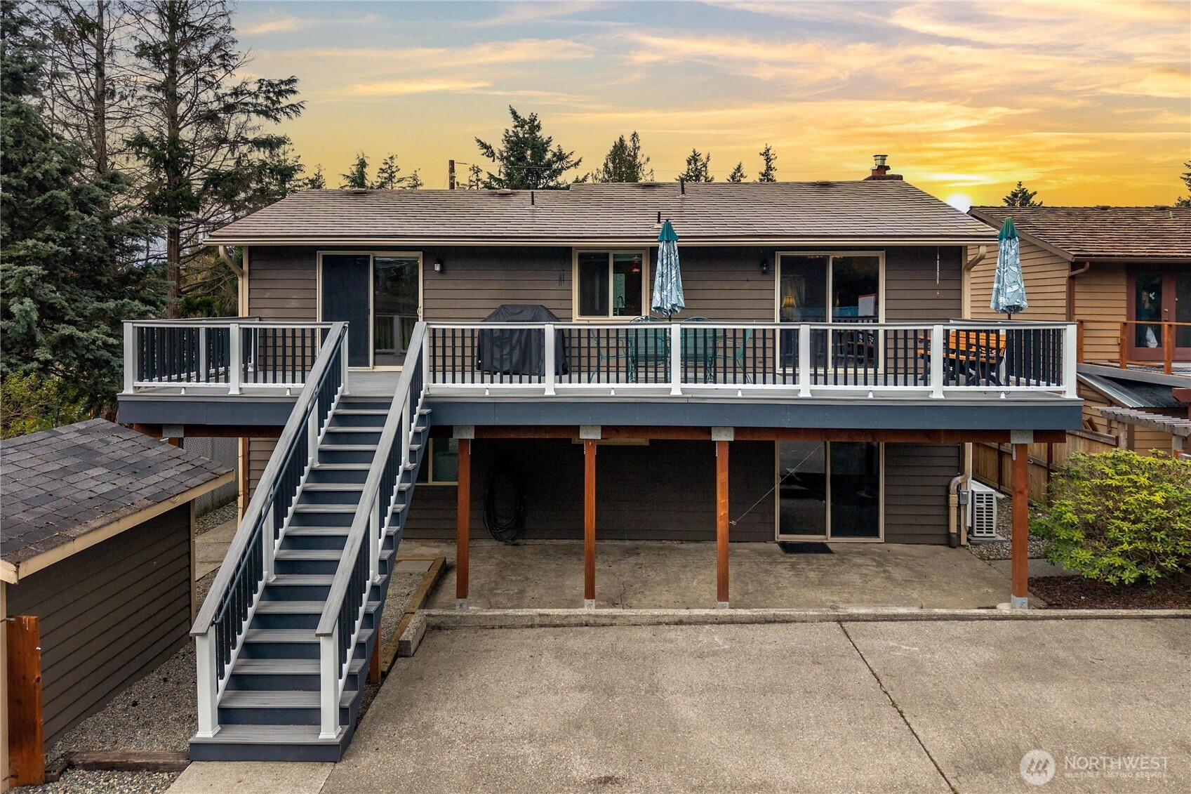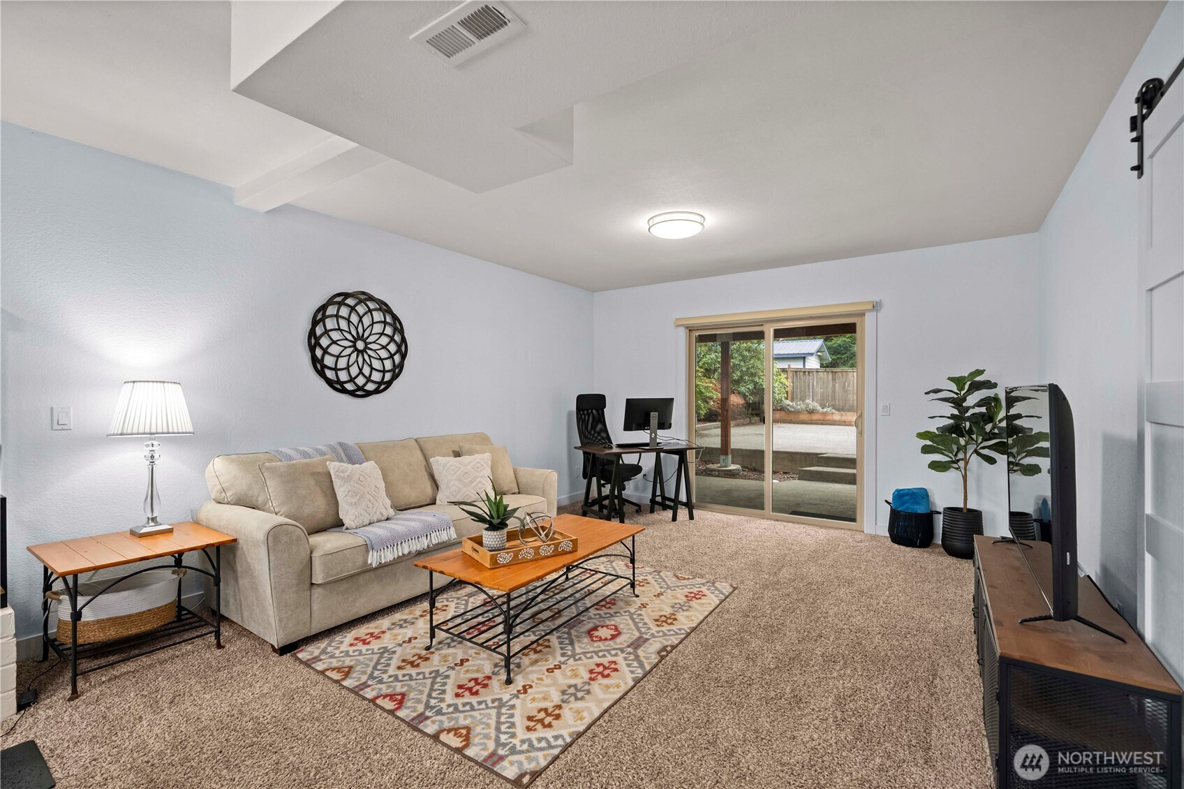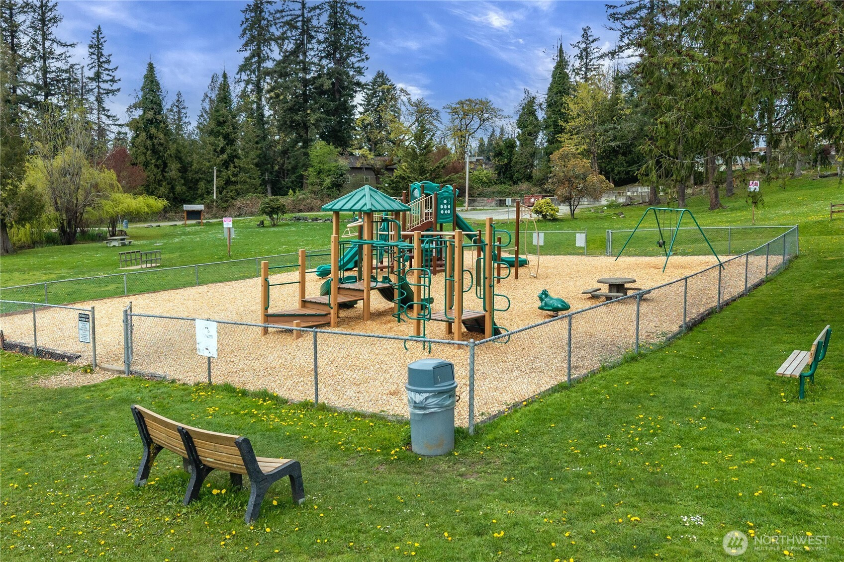 Open, bright, and thoughtfully laid out, this Maple Valley home offers comfortable living spaces and easy indoor-outdoor flow. The main living area features vaulted ceilings and a large bay window that fills the space with natural light. The kitchen showcases solid oak hardwood floors, white cabinetry, stainless steel appliances, wall oven, durable solid surface counters, a pantry, and a generous center island with seating. The adjacent dining area opens to a large deck, creating a natural extension of the living space for gatherings and outdoor enjoyment. The primary bedroom is light-filled and inviting, complete with its own slider opening directly to the patio. Downstairs, a spacious bonus room with fireplace and sliding glass door leads to a fully covered patio with a built-in gutter system, allowing for comfortable outdoor use throughout the seasons. Two additional bedrooms are located on the lower level along with a full and half bath, offering flexibility for guests, work-from-home needs, or hobbies. The fully fenced backyard is designed for both recreation and relaxation, featuring a basketball court and storage shed. Located near Cherokee Bay, enjoy community amenities including HOA dues that cover water, plus lakeside park access just steps away with a playground, boat launch, sport court, and more. Convenient access to major highways keeps commuting simple while nearby outdoor amenities make it easy to enjoy the Maple Valley lifestyle.