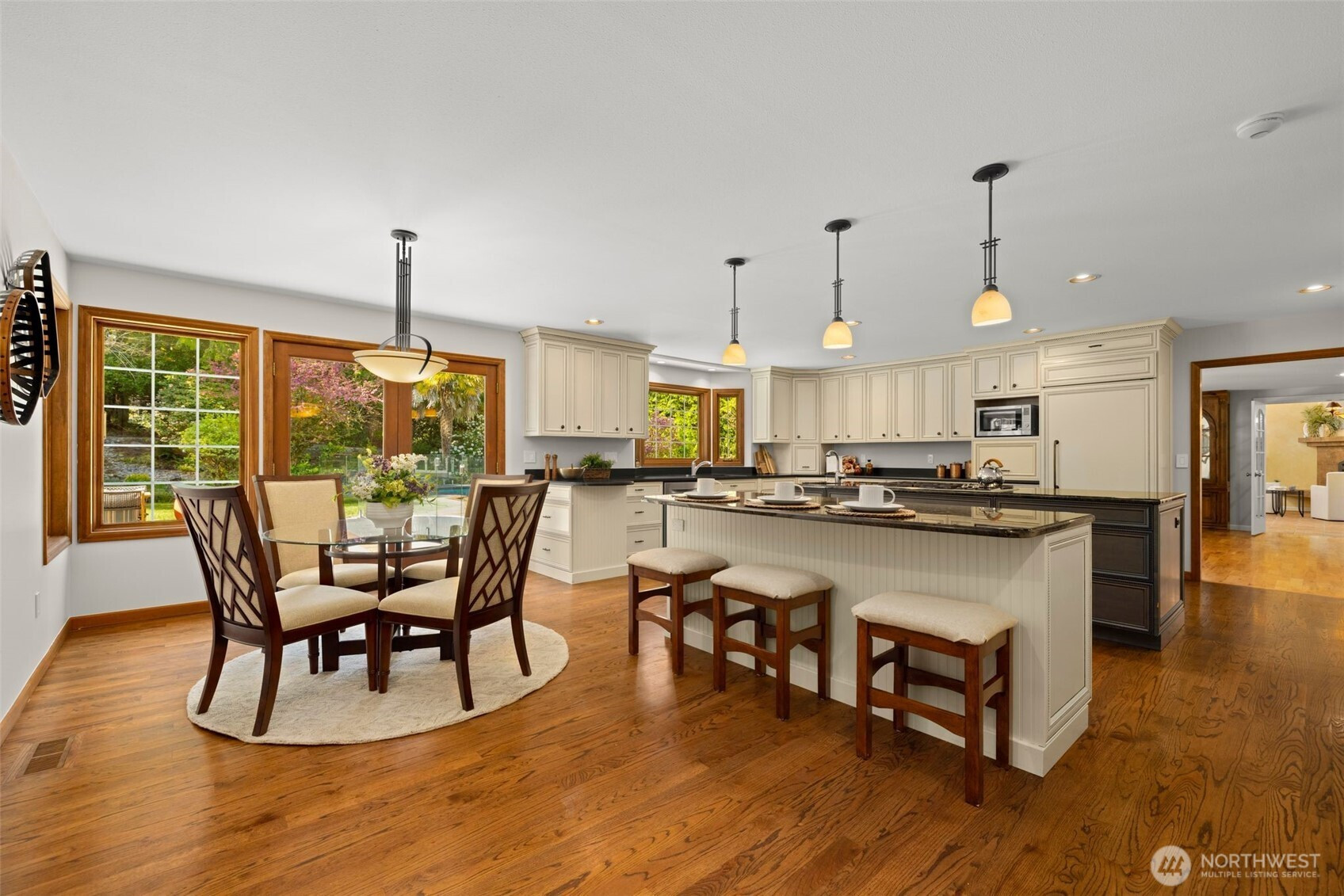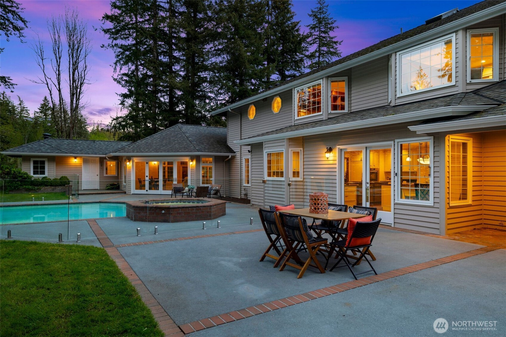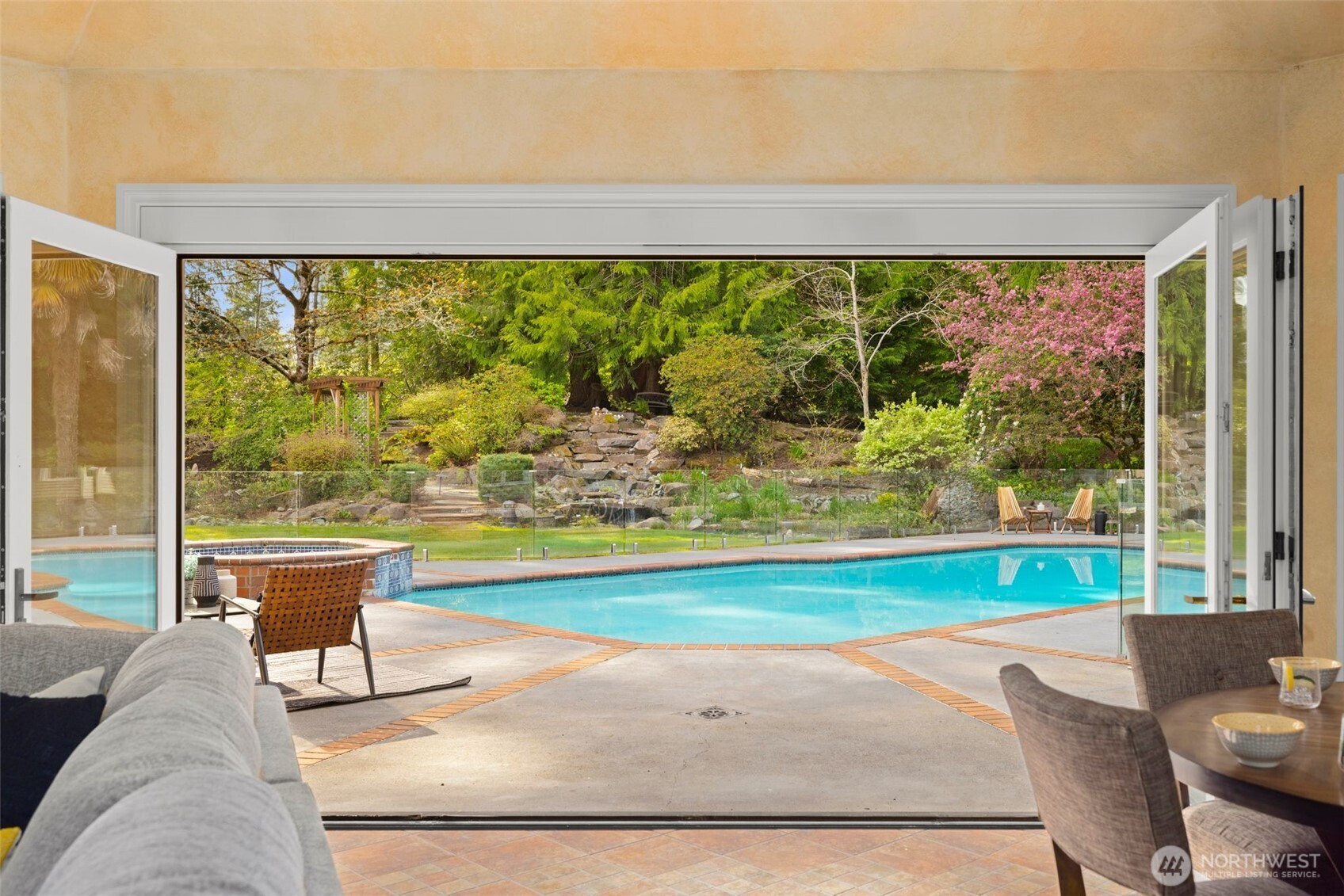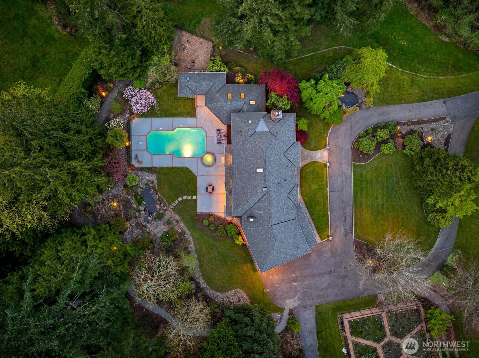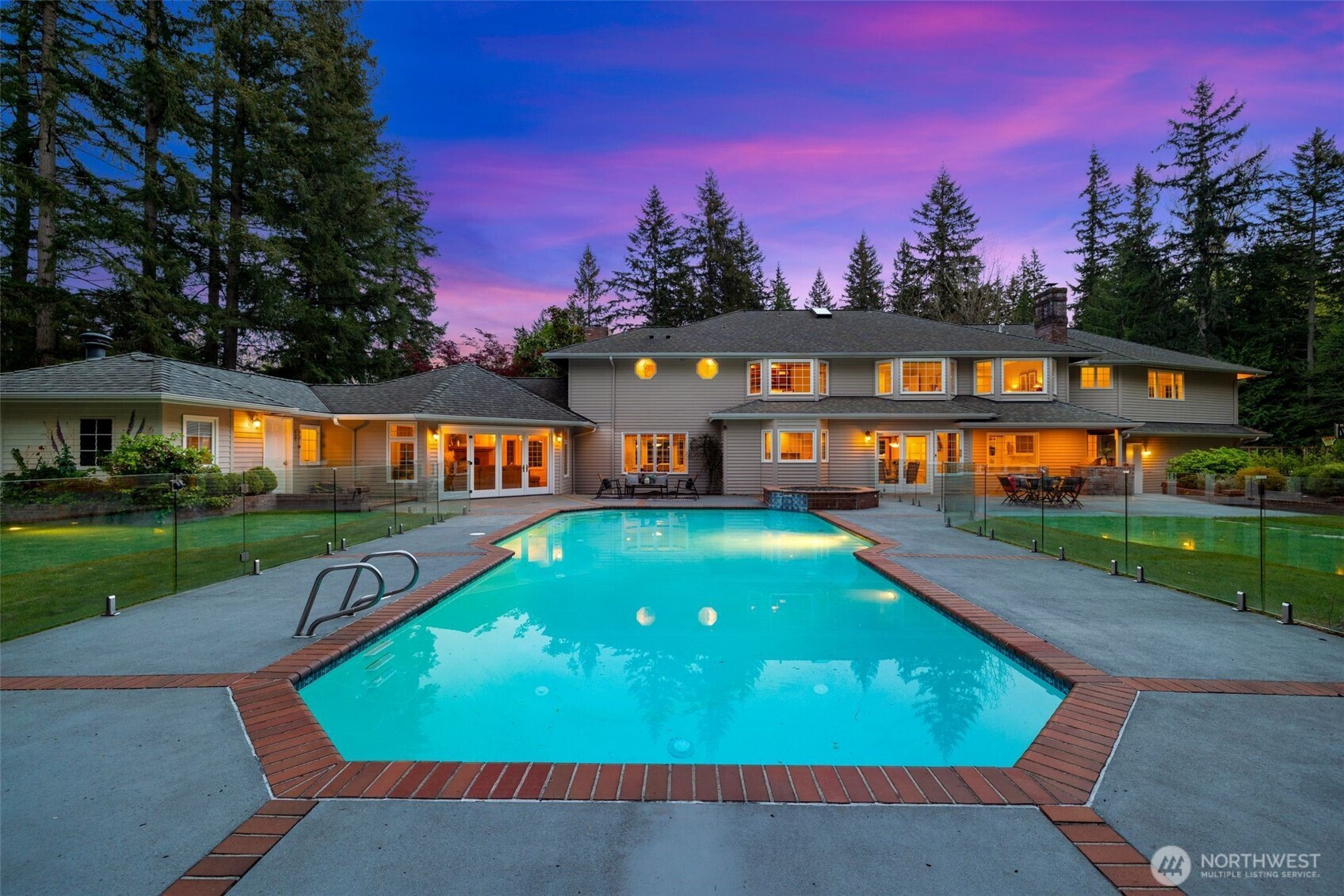 Designed around a central atrium that opens to the pool, this generous 6 acre estate unfolds across expansive interiors, a dual-island kitchen, and landscaped grounds arranged for both gathering and privacy. Mature evergreens surround the property, creating a sense of seclusion just moments from Sammamish amenities, dining, and parks. Inside, spaces are composed to support both daily rhythm and larger occasions. Living and dining areas maintain definition while remaining visually connected, allowing for easy movement between them. An intimate living room with fireplace offers a quiet setting, while the kitchen becomes a natural point of convergence, appointed with integrated appliances, custom cabinetry, and two substantial islands designed for preparation, conversation, and lingering. Light moves through the atrium, extending the interior toward the pool and shaping how the home is experienced throughout the day. Upstairs, the primary suite is set apart, oriented toward the surrounding canopy and offering a sense of pause, supported by a spacious bath and dressing area. A generous bonus room with wet bar invites evenings spent in, while additional bedrooms and a secondary office accommodate shifting needs over time. Across the grounds, pathways, water features, and garden spaces create a sequence of outdoor settings. Areas for dining, conversation, and retreat are placed throughout, resulting in a setting that feels established, private, and enduring.