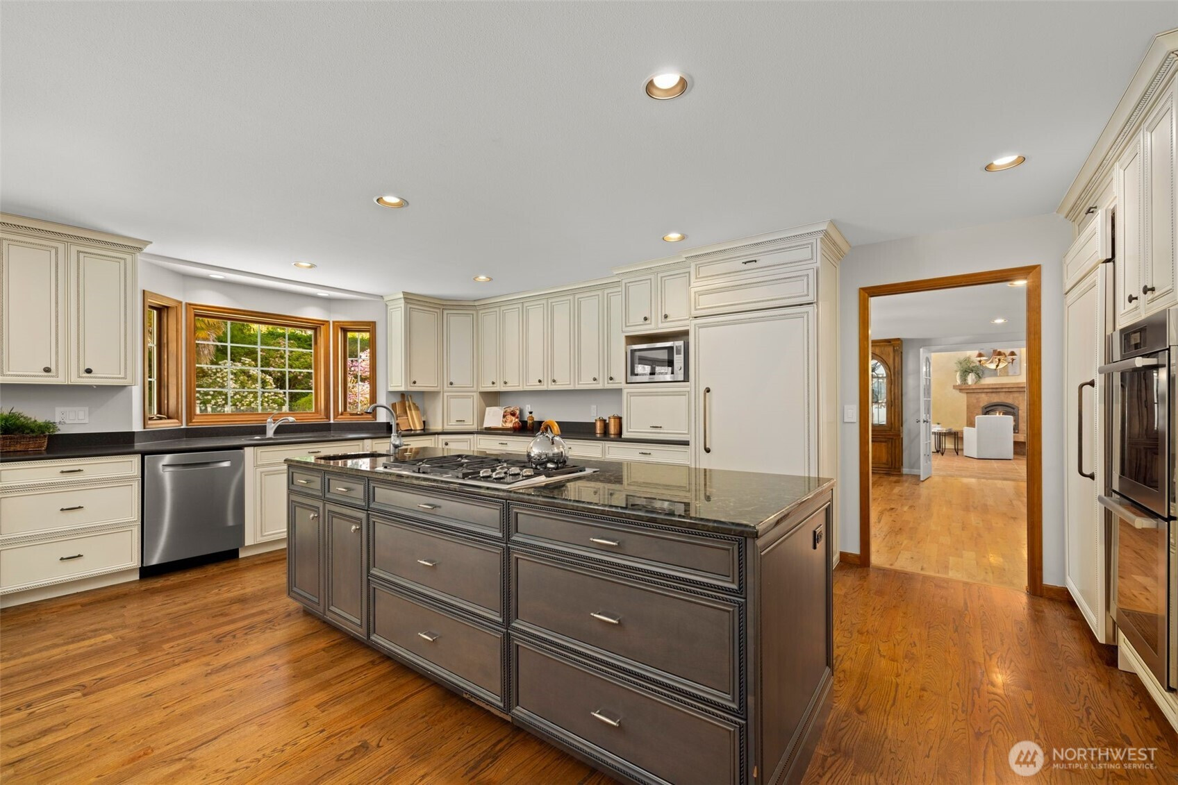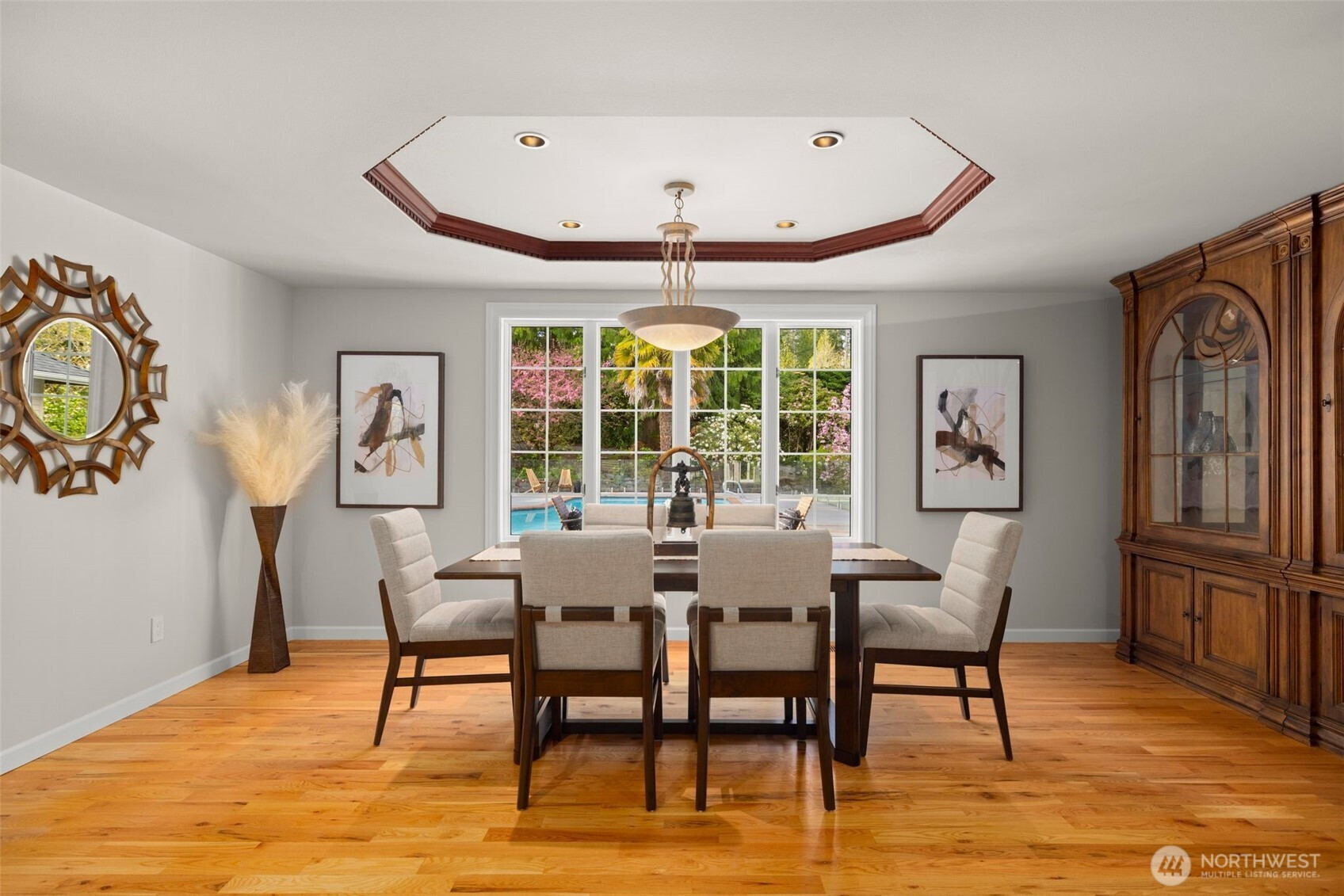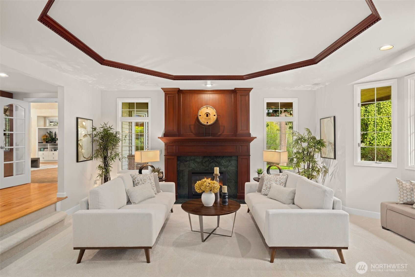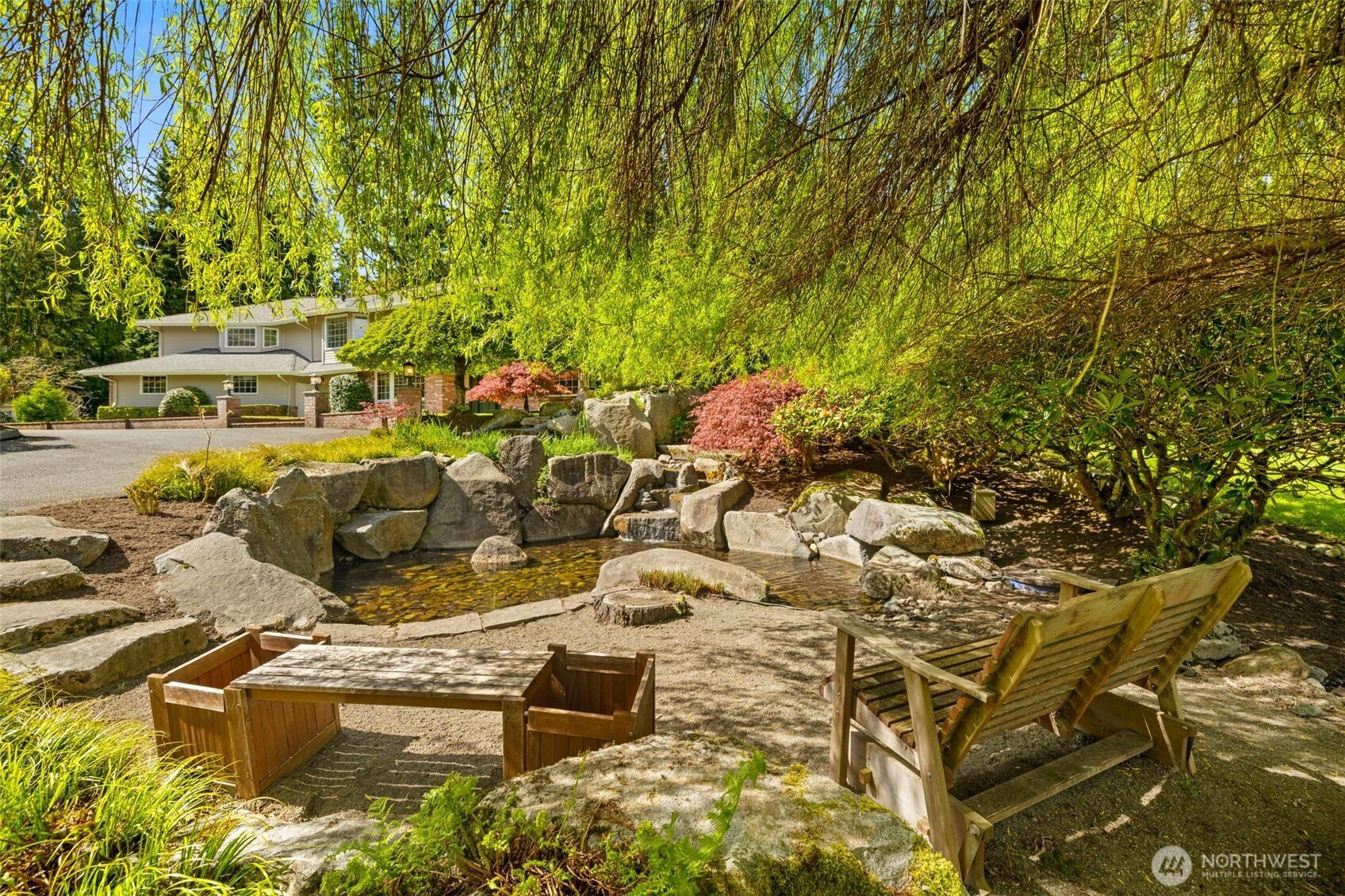 Designed around a central atrium that opens to the pool, this generous 6 acre estate unfolds across expansive interiors, a dual-island kitchen, and landscaped grounds arranged for both gathering and privacy. Mature evergreens surround the property, creating a sense of seclusion just moments from Sammamish amenities, dining, and parks. Inside, spaces are composed to support both daily rhythm and larger occasions. Living and dining areas maintain definition while remaining visually connected, allowing for easy movement between them. An intimate living room with fireplace offers a quiet setting, while the kitchen becomes a natural point of convergence, appointed with integrated appliances, custom cabinetry, and two substantial islands designed for preparation, conversation, and lingering. Light moves through the atrium, extending the interior toward the pool and shaping how the home is experienced throughout the day. Upstairs, the primary suite is set apart, oriented toward the surrounding canopy and offering a sense of pause, supported by a spacious bath and dressing area. A generous bonus room with wet bar invites evenings spent in, while additional bedrooms and a secondary office accommodate shifting needs over time. Across the grounds, pathways, water features, and garden spaces create a sequence of outdoor settings. Areas for dining, conversation, and retreat are placed throughout, resulting in a setting that feels established, private, and enduring.