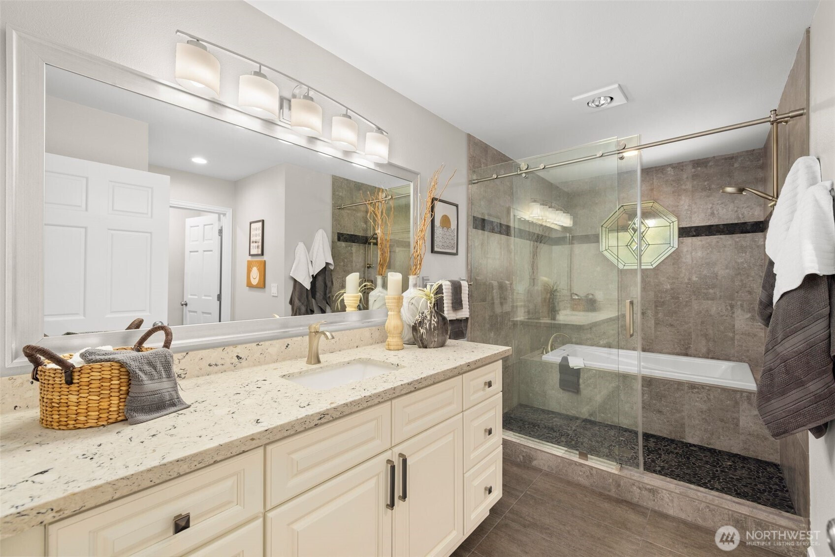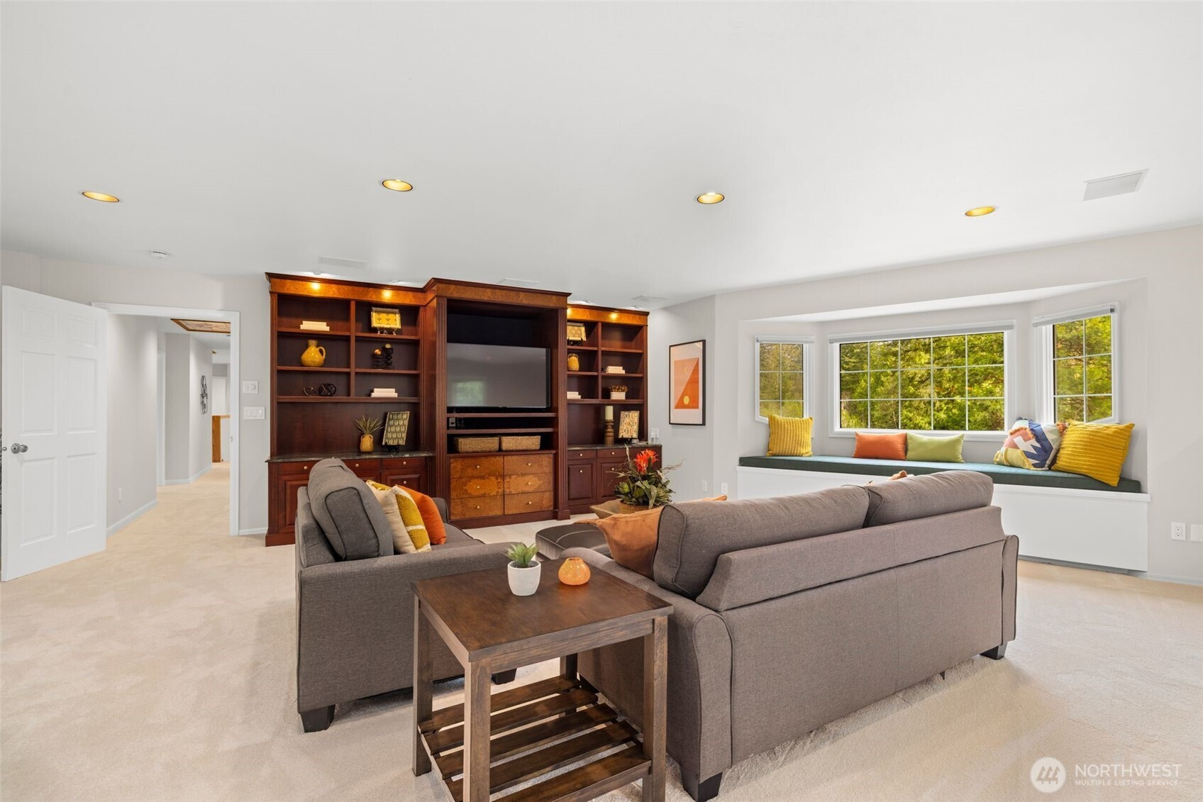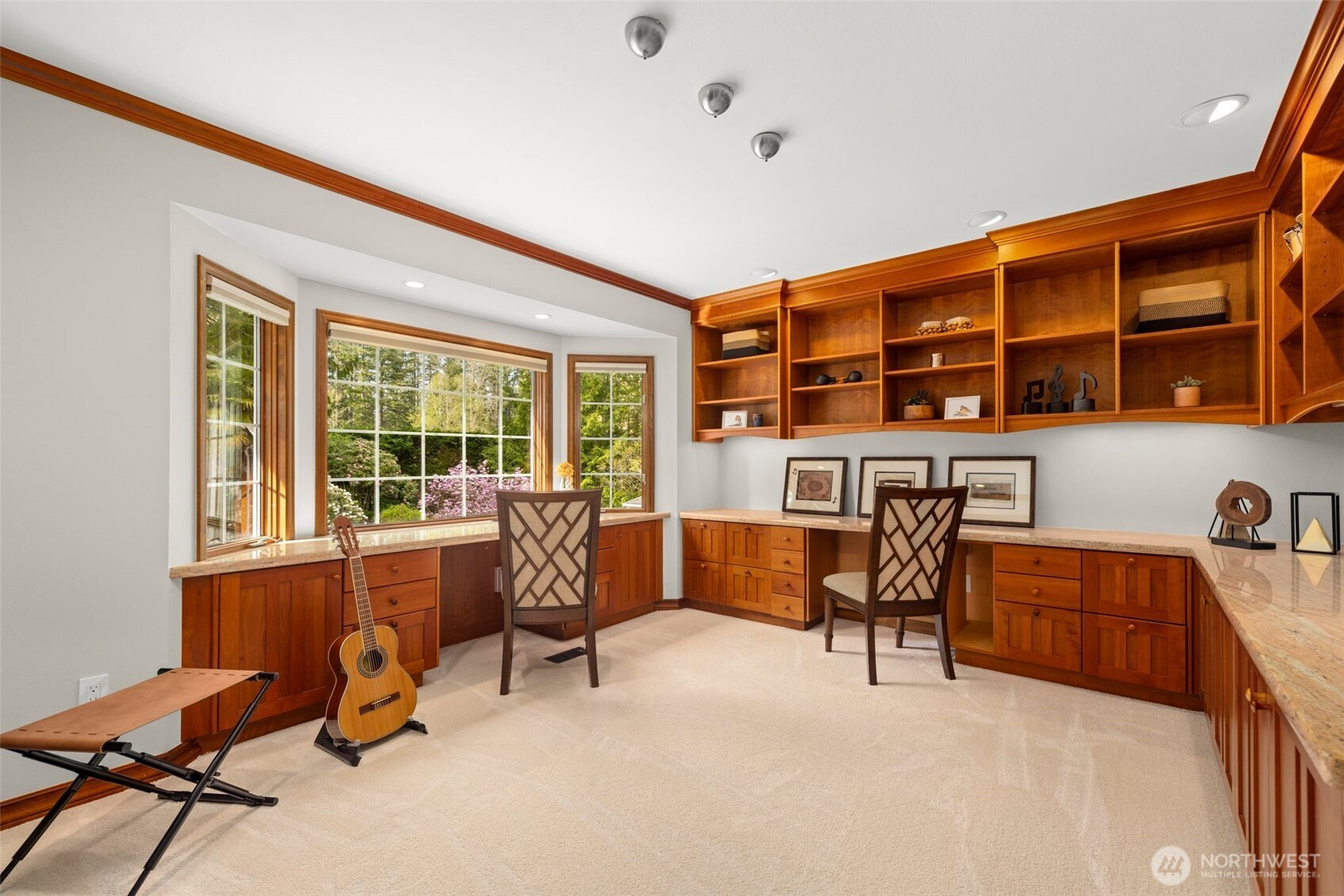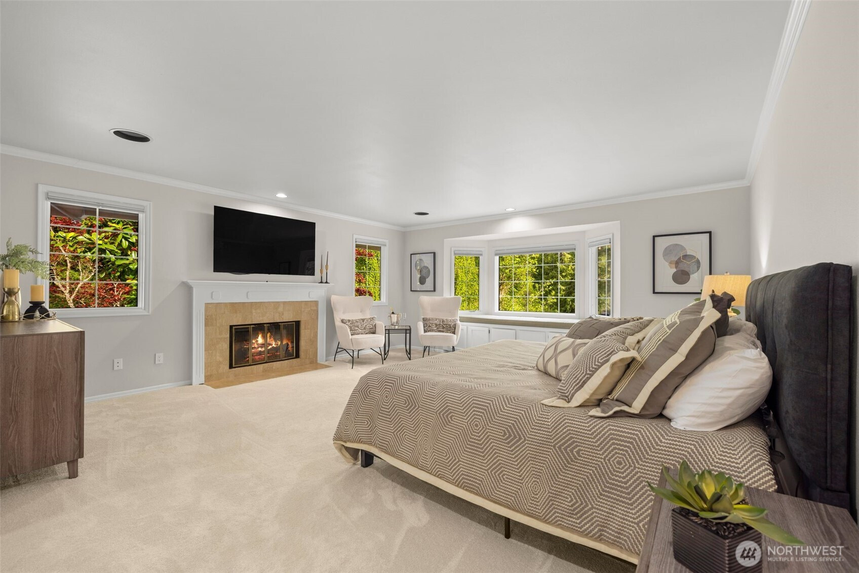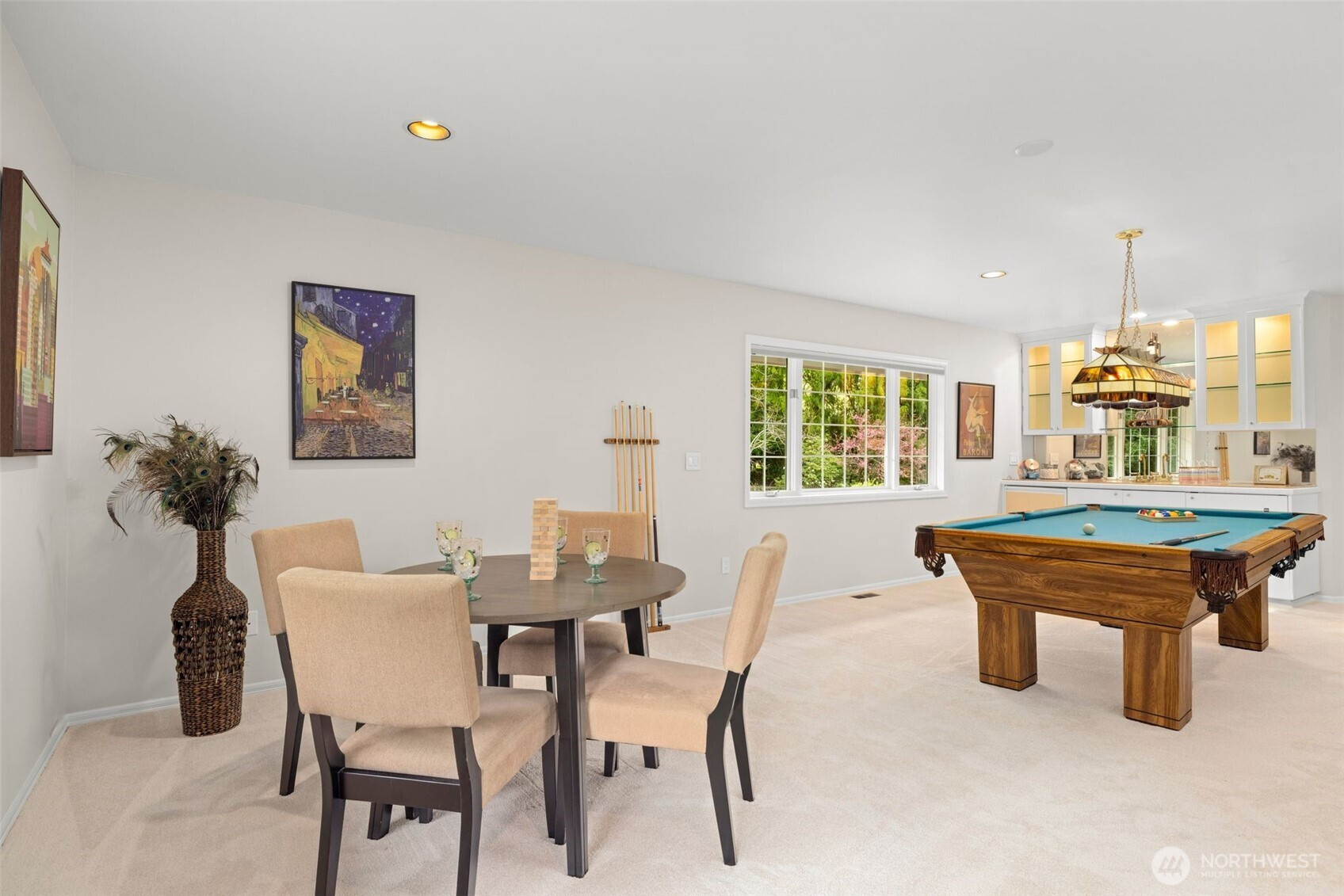 Designed around a central atrium that opens to the pool, this generous 6 acre estate unfolds across expansive interiors, a dual-island kitchen, and landscaped grounds arranged for both gathering and privacy. Mature evergreens surround the property, creating a sense of seclusion just moments from Sammamish amenities, dining, and parks. Inside, spaces are composed to support both daily rhythm and larger occasions. Living and dining areas maintain definition while remaining visually connected, allowing for easy movement between them. An intimate living room with fireplace offers a quiet setting, while the kitchen becomes a natural point of convergence, appointed with integrated appliances, custom cabinetry, and two substantial islands designed for preparation, conversation, and lingering. Light moves through the atrium, extending the interior toward the pool and shaping how the home is experienced throughout the day. Upstairs, the primary suite is set apart, oriented toward the surrounding canopy and offering a sense of pause, supported by a spacious bath and dressing area. A generous bonus room with wet bar invites evenings spent in, while additional bedrooms and a secondary office accommodate shifting needs over time. Across the grounds, pathways, water features, and garden spaces create a sequence of outdoor settings. Areas for dining, conversation, and retreat are placed throughout, resulting in a setting that feels established, private, and enduring.