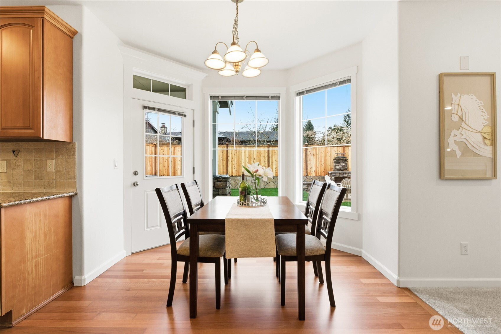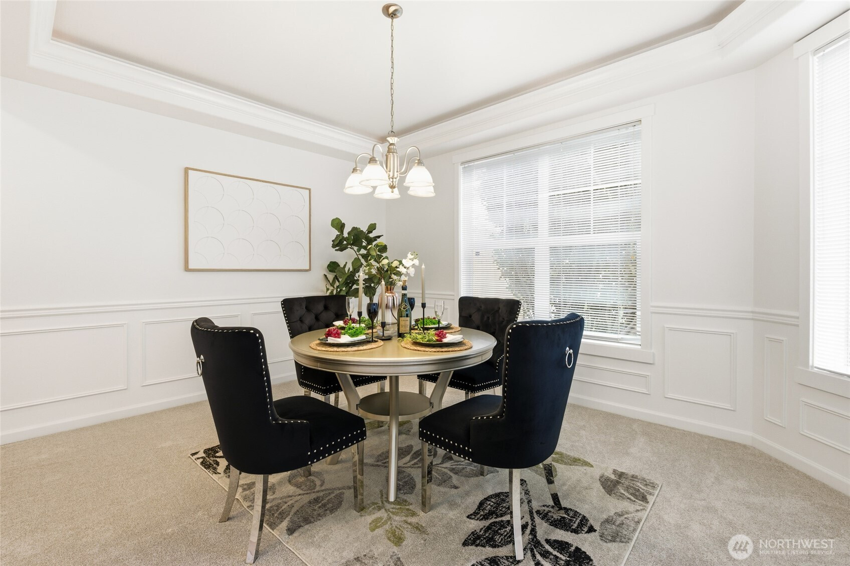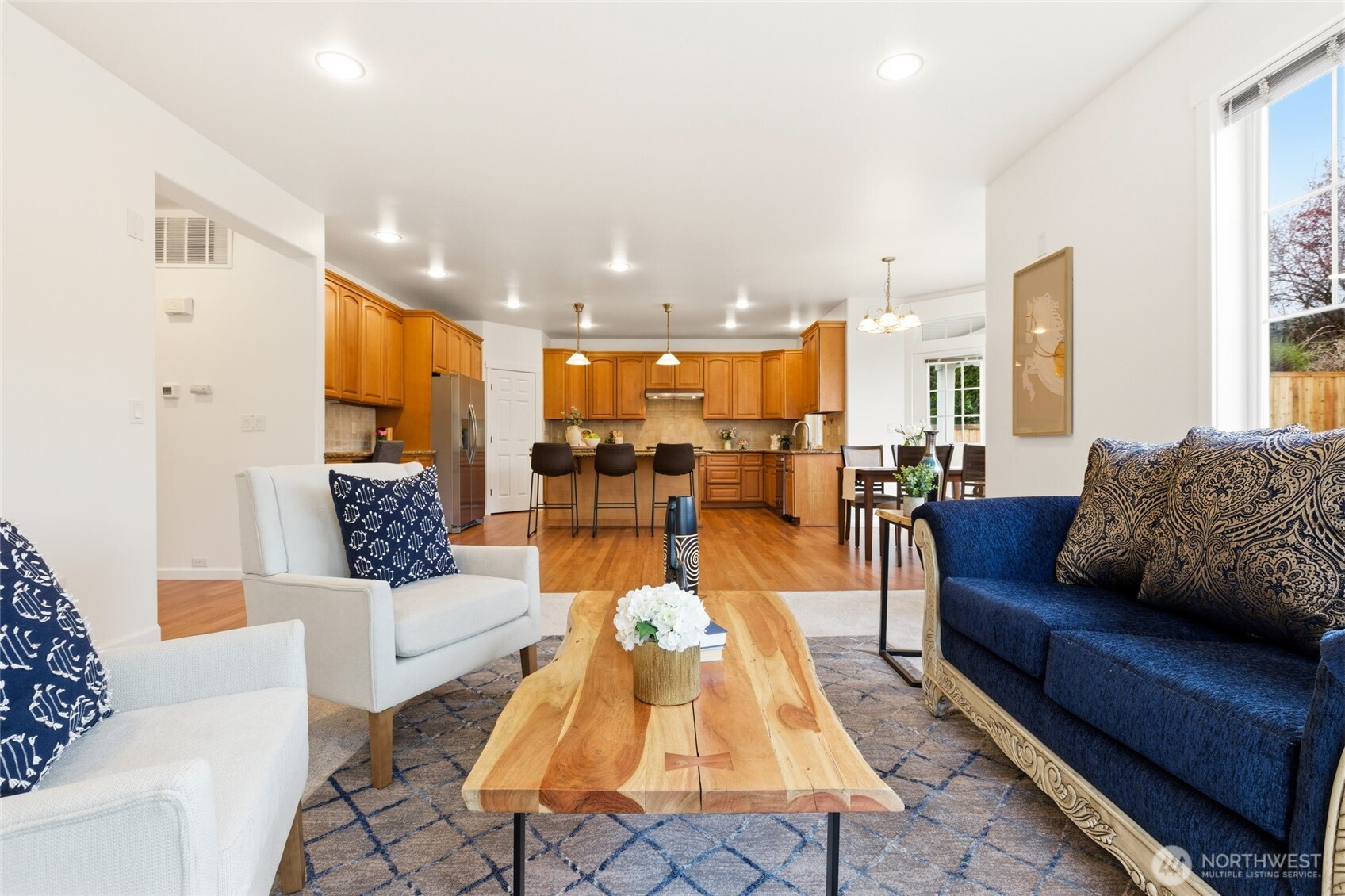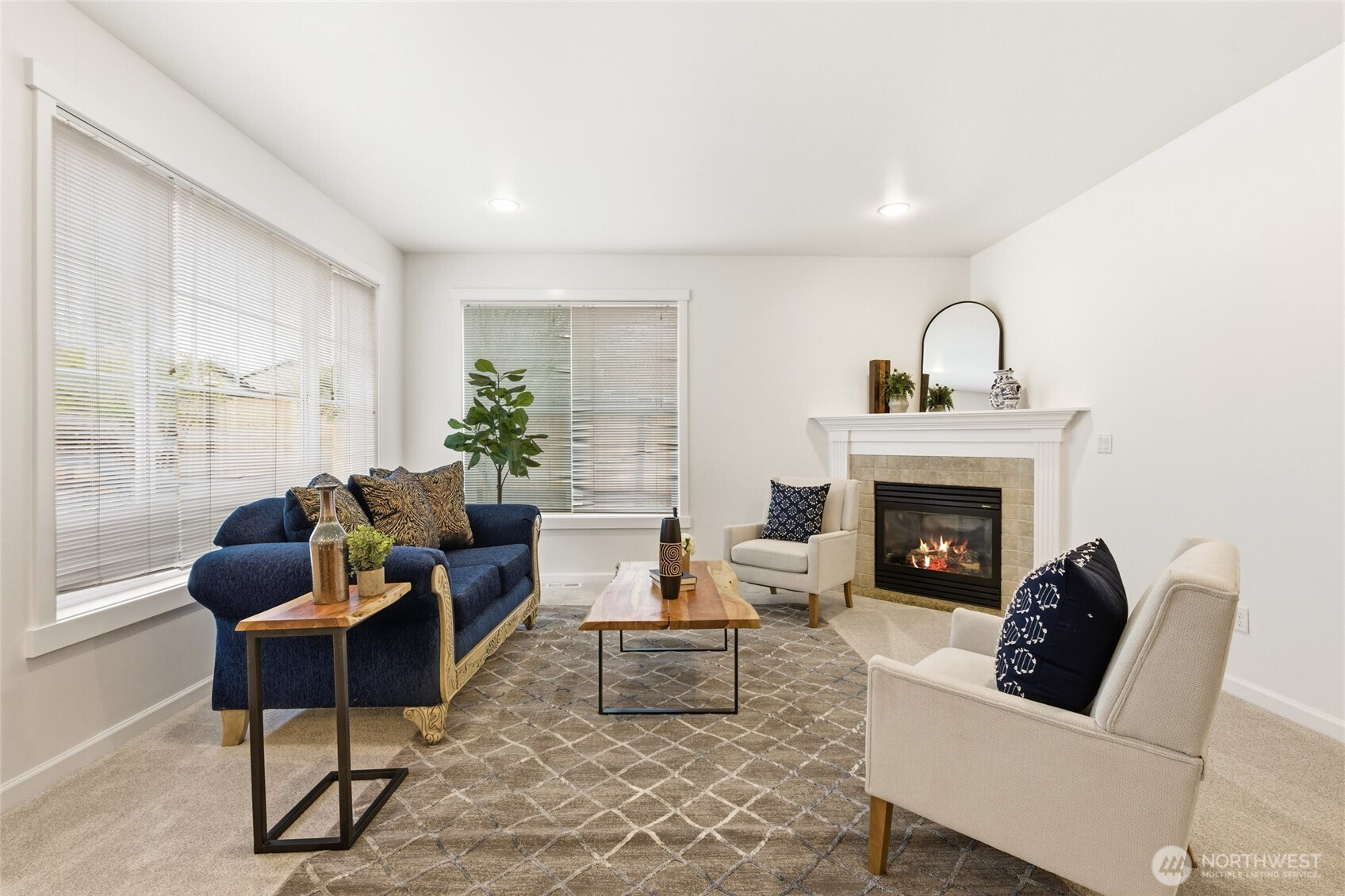 This 3,060 sq ft home on a corner lot features a functional four-bedroom layout and substantial infrastructure updates. The entryway opens with high ceilings and a staircase detailed with integrated foot lighting. Interior finishes include fresh paint, new carpet, and refinished hardwoods throughout the main level. The property is equipped with a new roof, a brand-new full fence, and a new hot water heater, alongside a newer furnace and existing central AC. The floor plan includes two gas fireplaces: one on the main level and a double-sided glass fireplace in the primary suite that serves both the bedroom and the primary bath. The outdoor living area features a patio equipped with an outdoor sink and an outdoor fireplace, creating a dedicated space for backyard activities. Located moments from Panther Lake and Lake Youngs recreation, this residence combines a spacious interior with a brand-new perimeter fence and functional outdoor amenities.