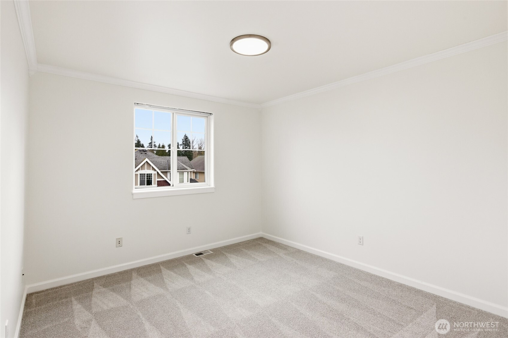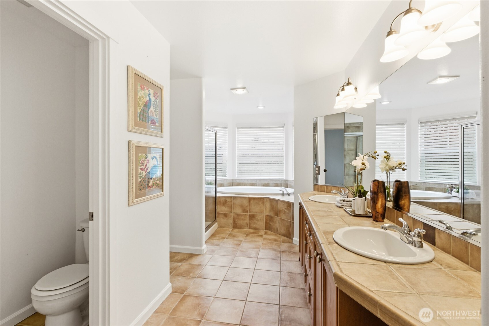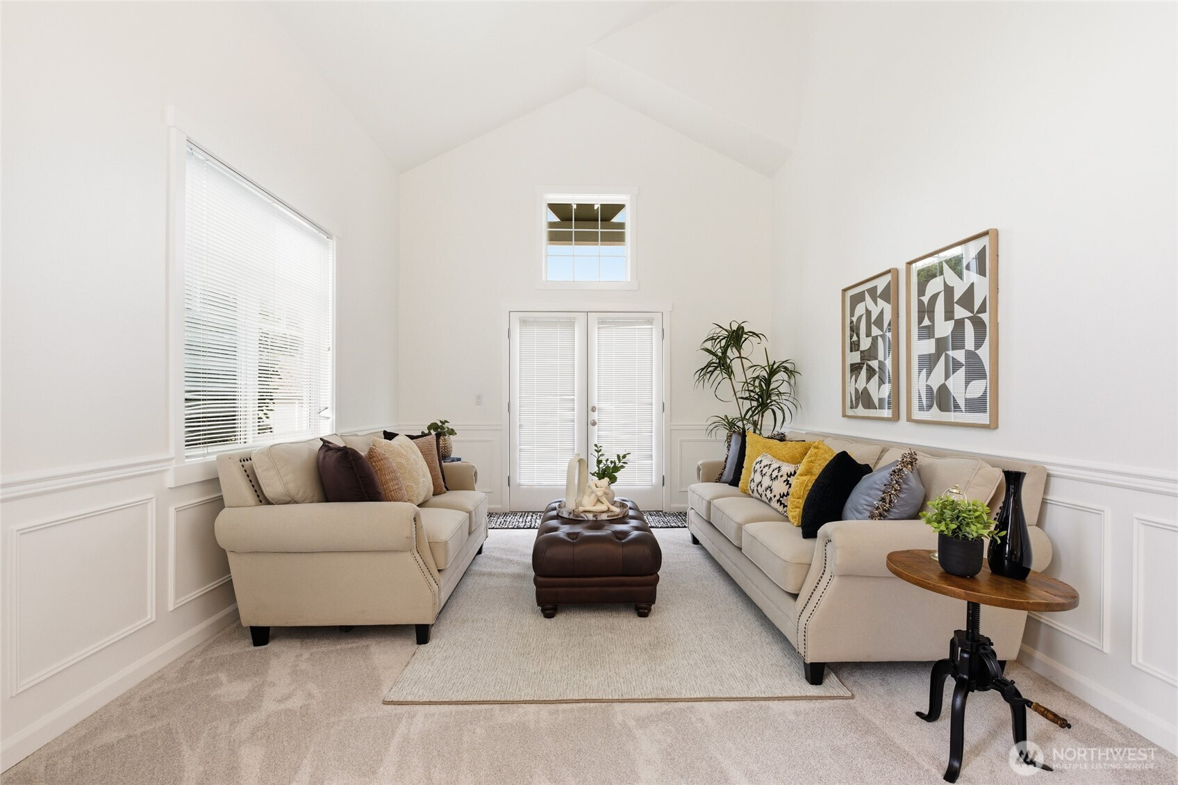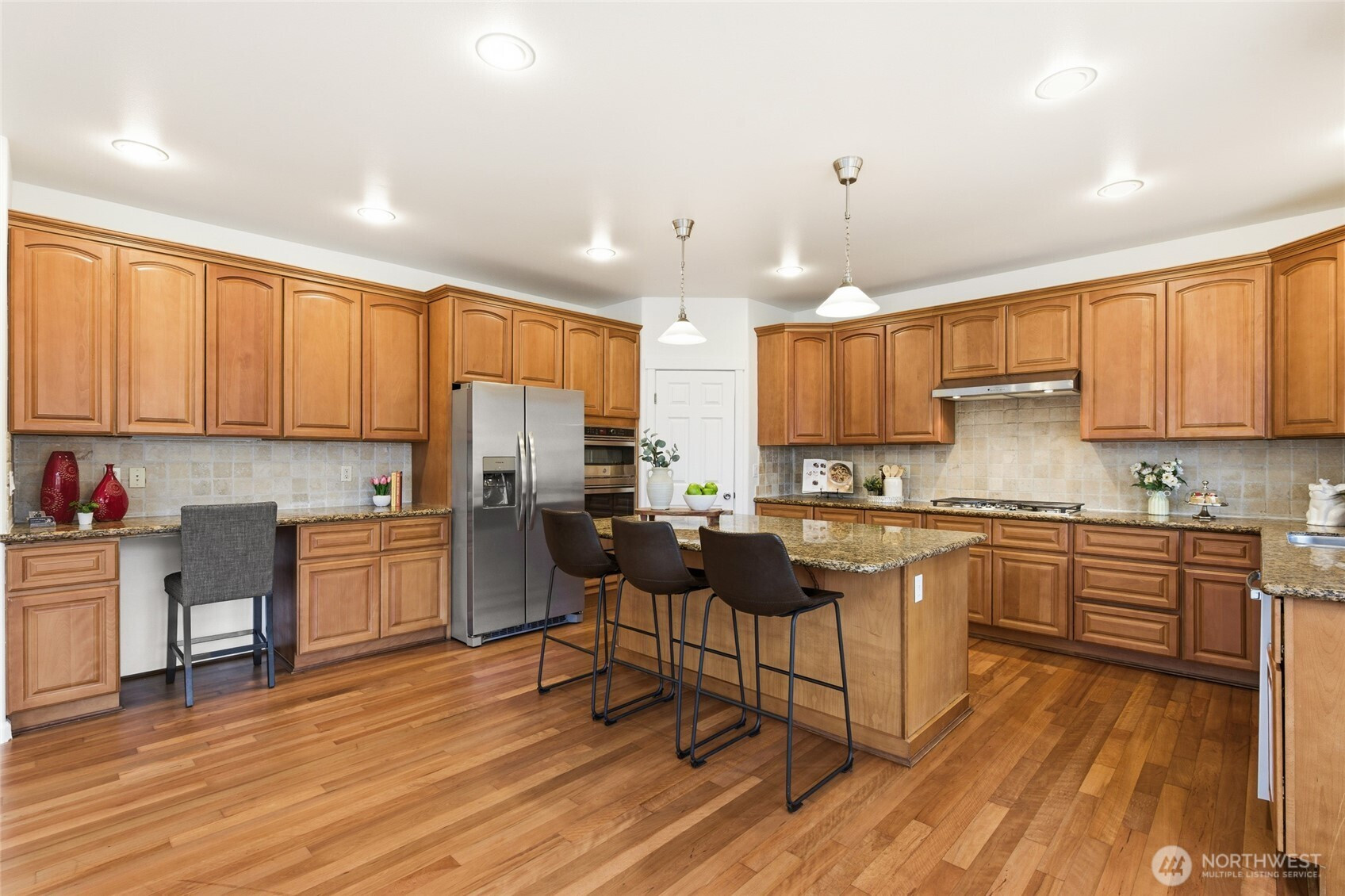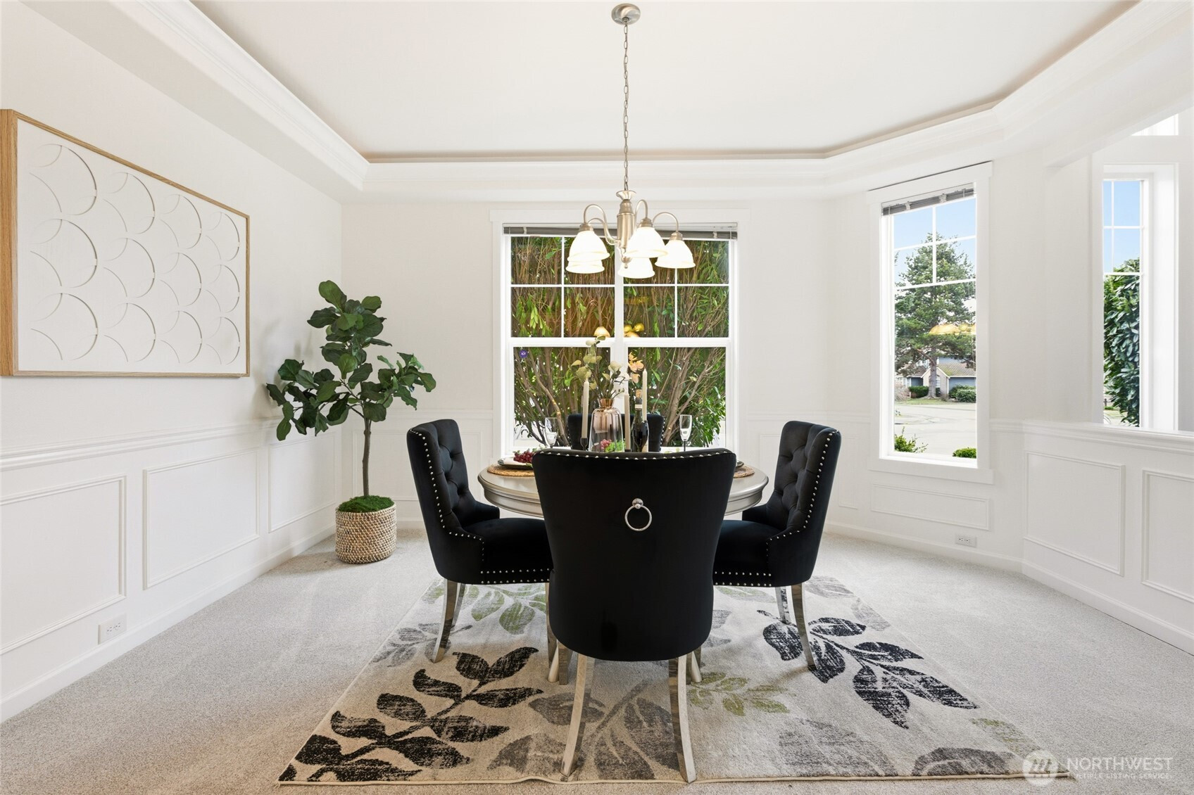 This 3,060 sq ft home on a corner lot features a functional four-bedroom layout and substantial infrastructure updates. The entryway opens with high ceilings and a staircase detailed with integrated foot lighting. Interior finishes include fresh paint, new carpet, and refinished hardwoods throughout the main level. The property is equipped with a new roof, a brand-new full fence, and a new hot water heater, alongside a newer furnace and existing central AC. The floor plan includes two gas fireplaces: one on the main level and a double-sided glass fireplace in the primary suite that serves both the bedroom and the primary bath. The outdoor living area features a patio equipped with an outdoor sink and an outdoor fireplace, creating a dedicated space for backyard activities. Located moments from Panther Lake and Lake Youngs recreation, this residence combines a spacious interior with a brand-new perimeter fence and functional outdoor amenities.