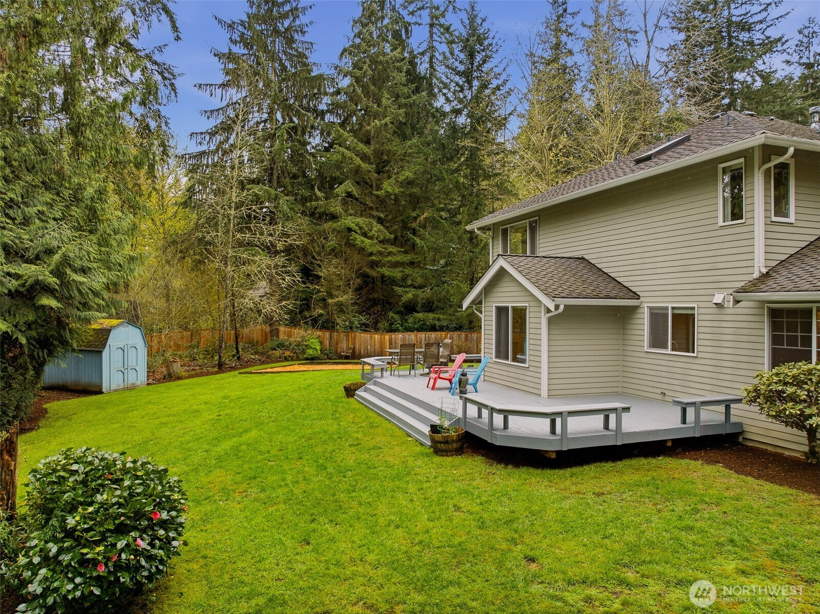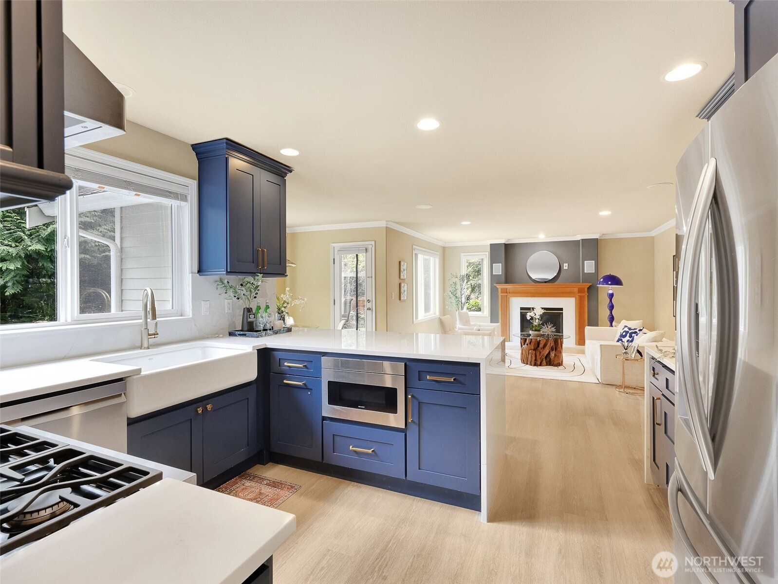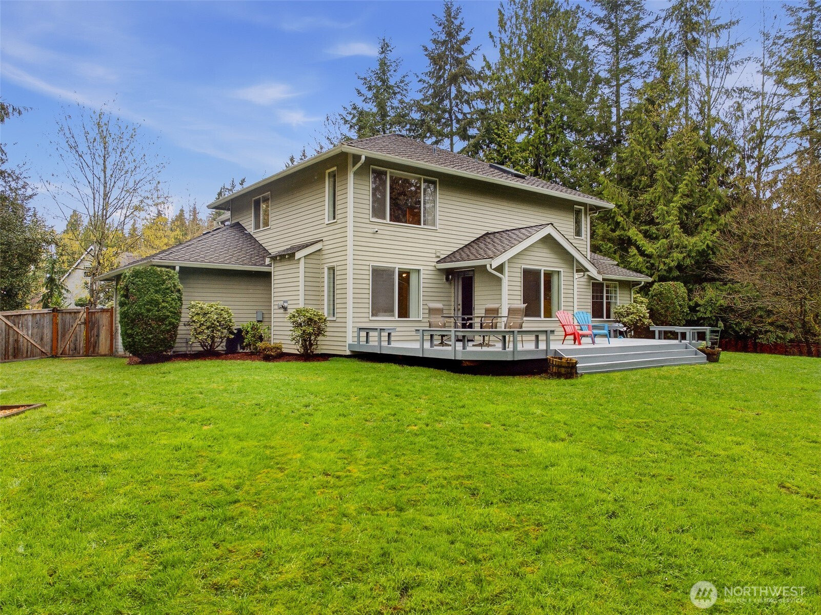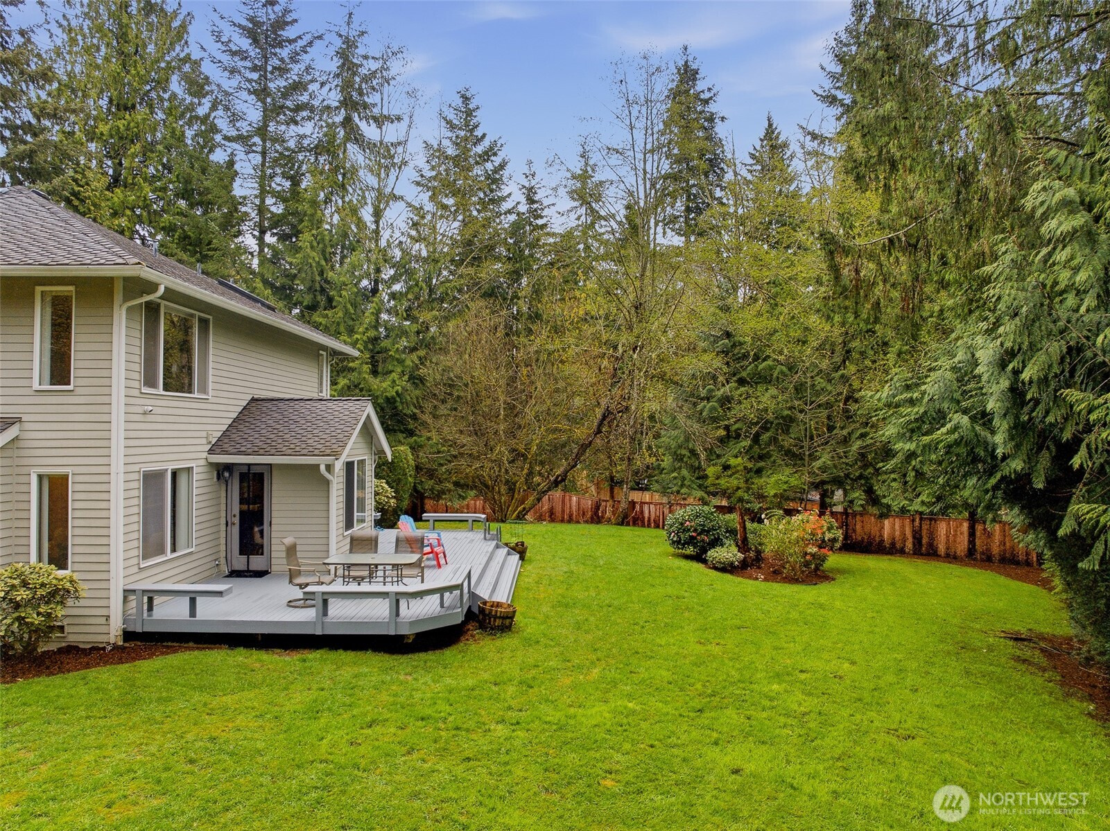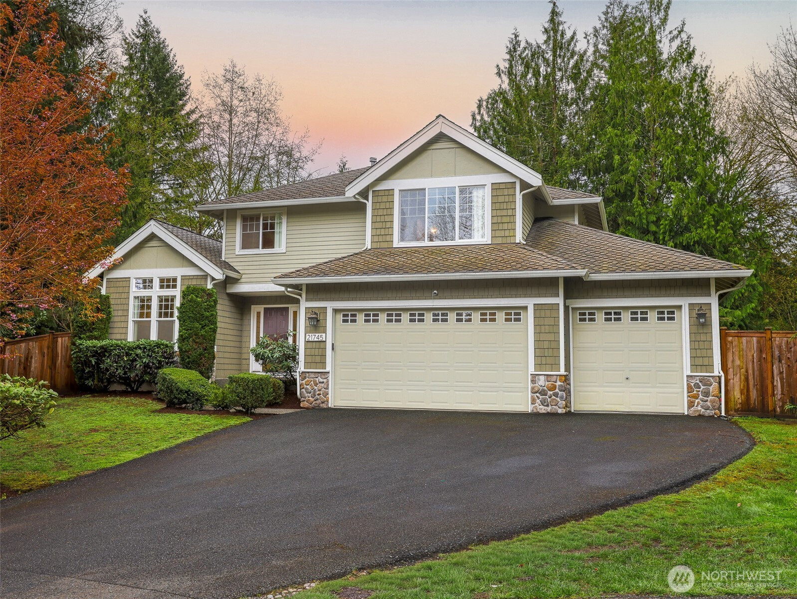 Tucked within a quiet cul-de-sac in the coveted Lexington neighborhood, this beautifully updated 4-bedroom, 2.5-bath home offers the perfect blend of comfort, style, and functionality — all within the Award-Winning Northshore School District and with NO HOA. Soaring vaulted ceilings, crown molding, and light engineered hardwood floors (2022) set an elegant tone throughout the bright, open main level. The grand living room flows seamlessly into a warm family room anchored by a fireplace, while a dedicated main-level office adds everyday versatility. The fully remodeled kitchen is a chef's dream — featuring a professional Miele dual-fuel range, waterfall quartz countertops, custom cabinetry, and a stunning farmhouse sink. A luxury deck just off the kitchen extends the living space outdoors, perfect for entertaining. Upstairs, the spacious primary suite is a true retreat, complete with a spa-inspired 5-piece bath and double vanity. Smart home features throughout include a 7.1 in-wall home theater system, built-in security alarm, CAT 5 wiring, and generator hookup. The finished and insulated 900 SF 3-car garage with EV charger, a 50-year roof, central A/C, and a fully fenced yard (2022) round out this move-in-ready home — truly nothing left to do but move in.