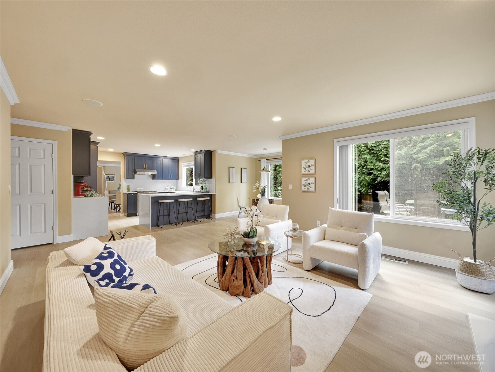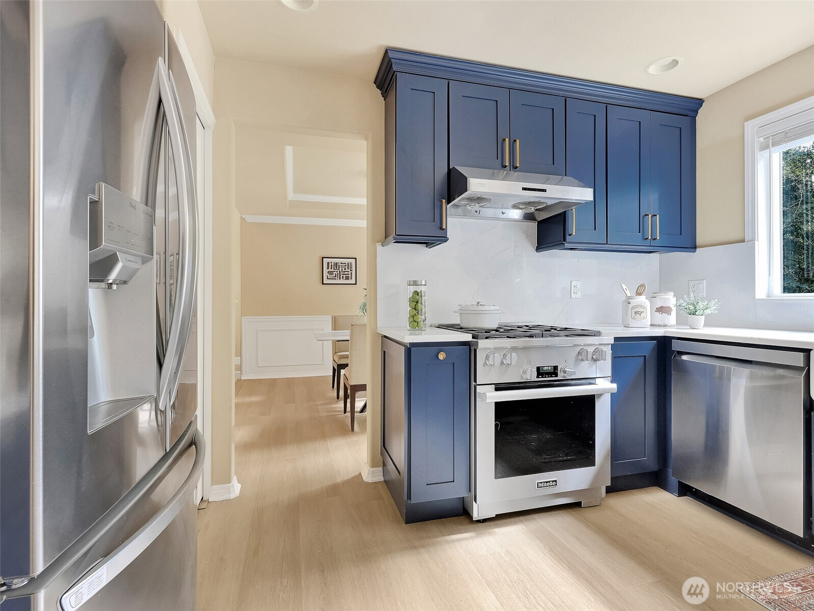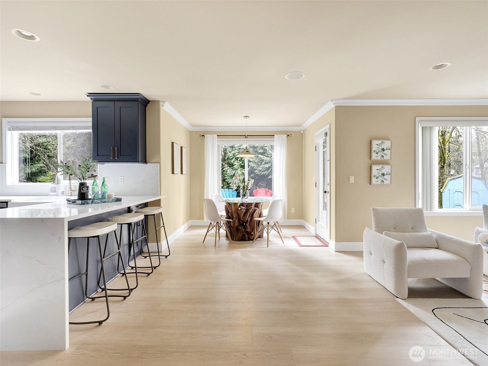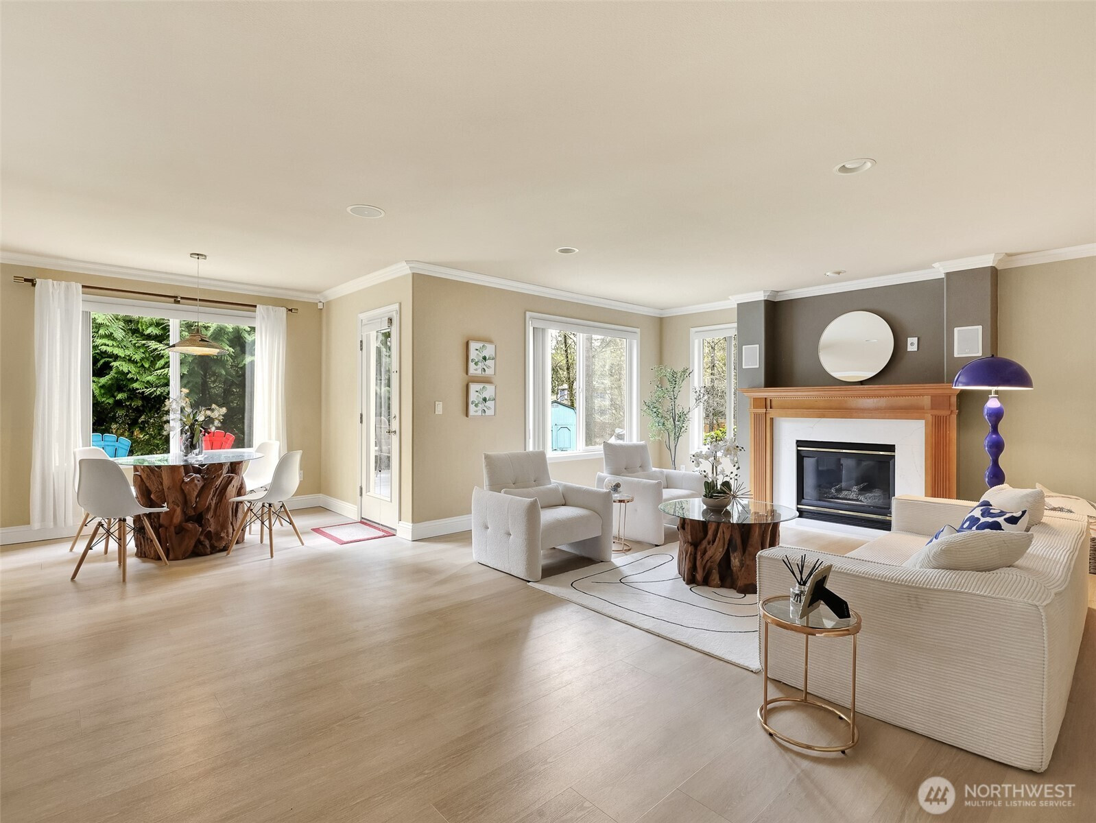 Tucked within a quiet cul-de-sac in the coveted Lexington neighborhood, this beautifully updated 4-bedroom, 2.5-bath home offers the perfect blend of comfort, style, and functionality — all within the Award-Winning Northshore School District and with NO HOA. Soaring vaulted ceilings, crown molding, and light engineered hardwood floors (2022) set an elegant tone throughout the bright, open main level. The grand living room flows seamlessly into a warm family room anchored by a fireplace, while a dedicated main-level office adds everyday versatility. The fully remodeled kitchen is a chef's dream — featuring a professional Miele dual-fuel range, waterfall quartz countertops, custom cabinetry, and a stunning farmhouse sink. A luxury deck just off the kitchen extends the living space outdoors, perfect for entertaining. Upstairs, the spacious primary suite is a true retreat, complete with a spa-inspired 5-piece bath and double vanity. Smart home features throughout include a 7.1 in-wall home theater system, built-in security alarm, CAT 5 wiring, and generator hookup. The finished and insulated 900 SF 3-car garage with EV charger, a 50-year roof, central A/C, and a fully fenced yard (2022) round out this move-in-ready home — truly nothing left to do but move in.