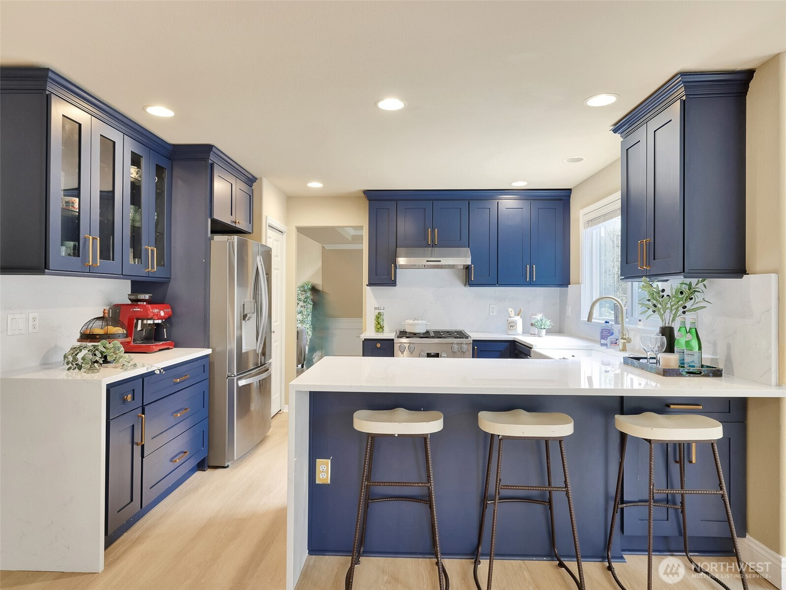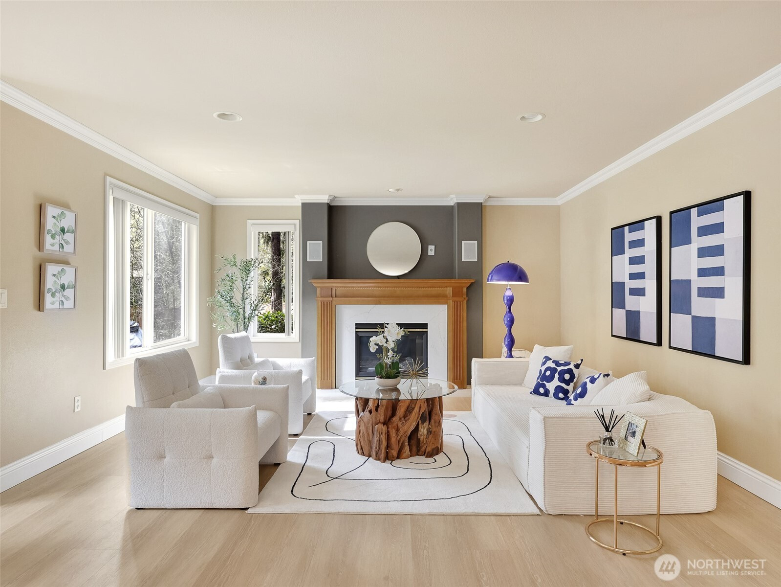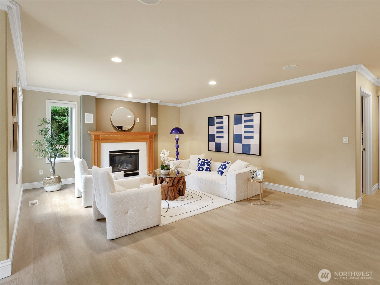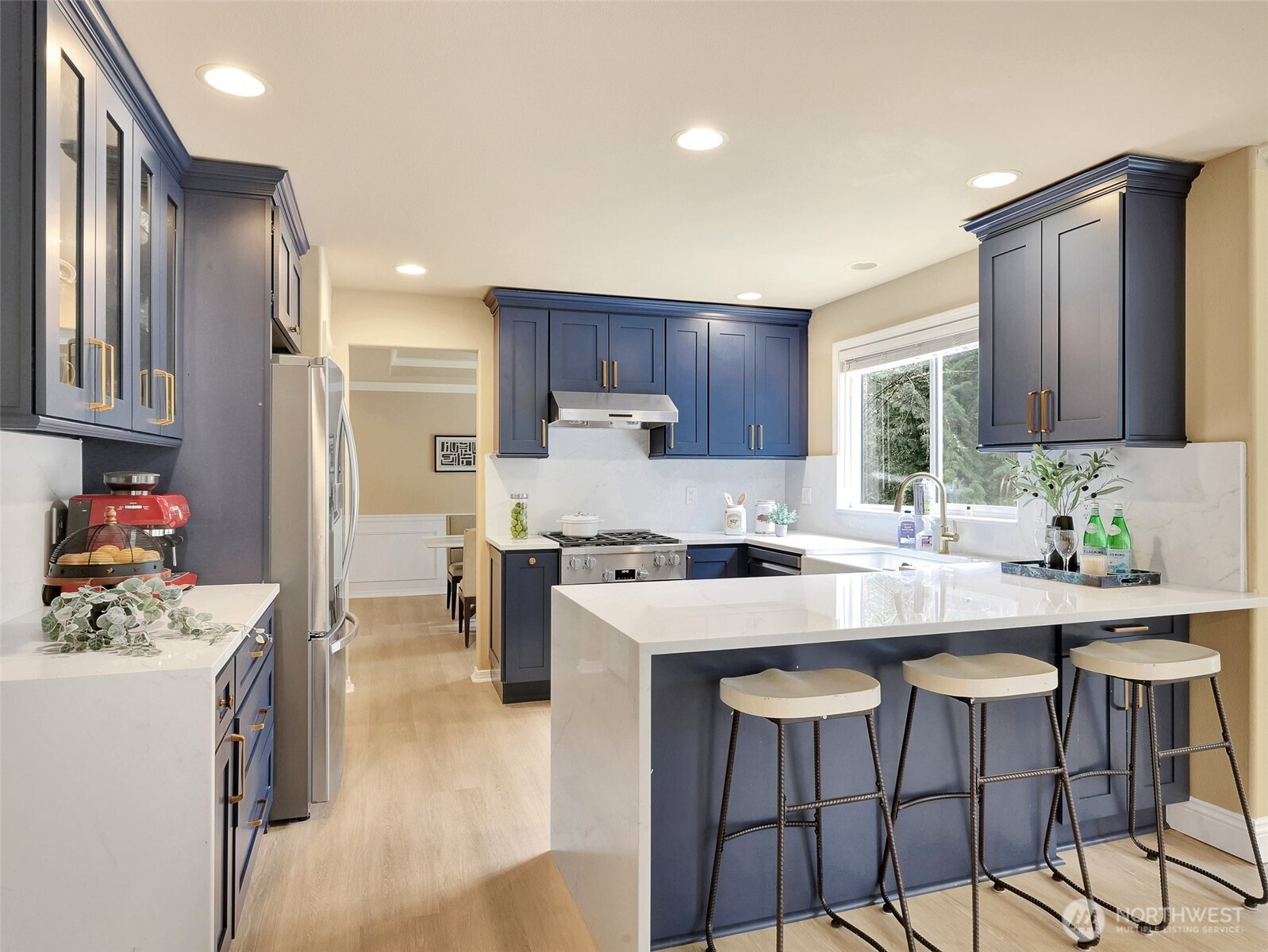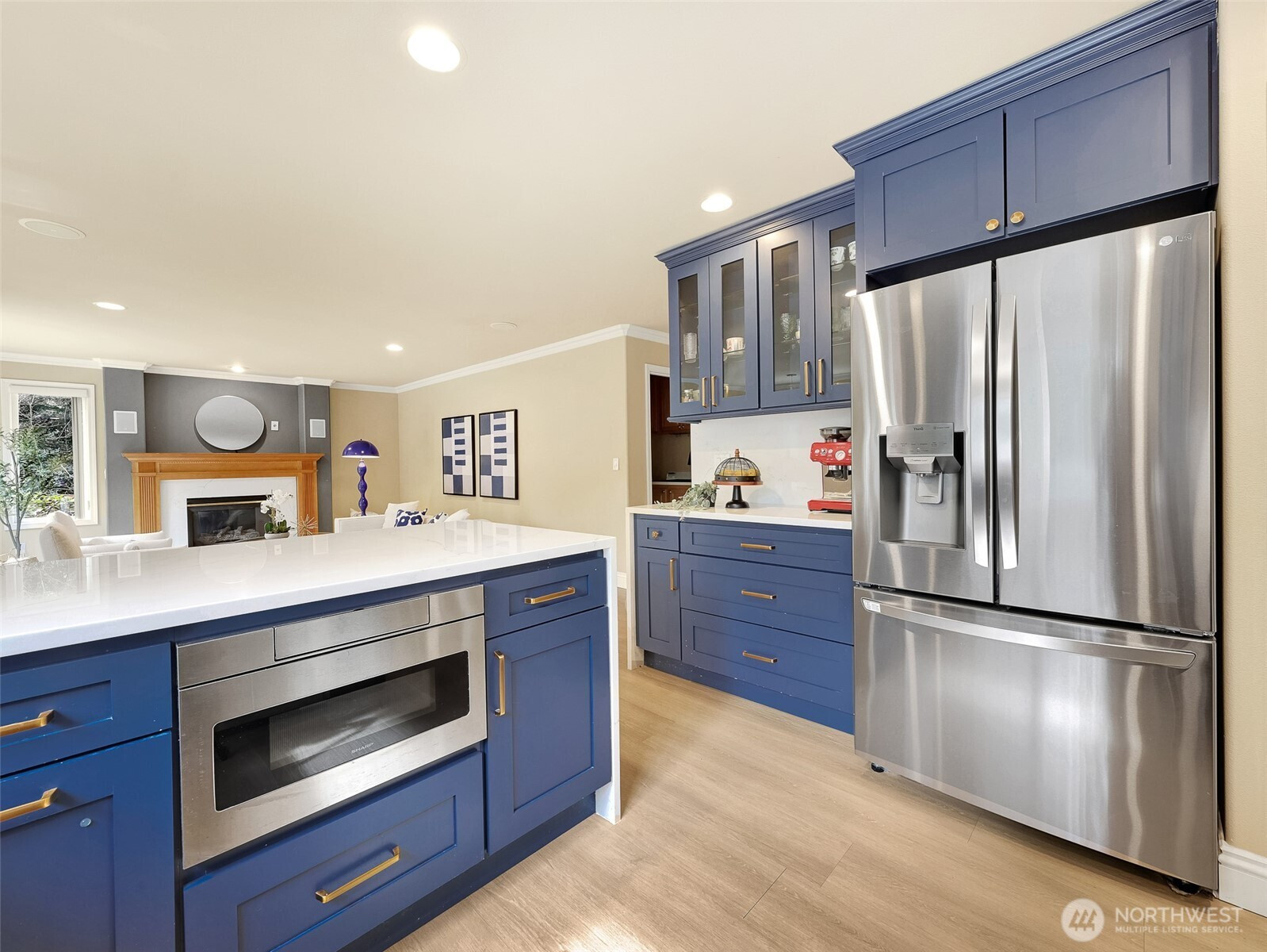 Tucked within a quiet cul-de-sac in the coveted Lexington neighborhood, this beautifully updated 4-bedroom, 2.5-bath home offers the perfect blend of comfort, style, and functionality — all within the Award-Winning Northshore School District and with NO HOA. Soaring vaulted ceilings, crown molding, and light engineered hardwood floors (2022) set an elegant tone throughout the bright, open main level. The grand living room flows seamlessly into a warm family room anchored by a fireplace, while a dedicated main-level office adds everyday versatility. The fully remodeled kitchen is a chef's dream — featuring a professional Miele dual-fuel range, waterfall quartz countertops, custom cabinetry, and a stunning farmhouse sink. A luxury deck just off the kitchen extends the living space outdoors, perfect for entertaining. Upstairs, the spacious primary suite is a true retreat, complete with a spa-inspired 5-piece bath and double vanity. Smart home features throughout include a 7.1 in-wall home theater system, built-in security alarm, CAT 5 wiring, and generator hookup. The finished and insulated 900 SF 3-car garage with EV charger, a 50-year roof, central A/C, and a fully fenced yard (2022) round out this move-in-ready home — truly nothing left to do but move in.