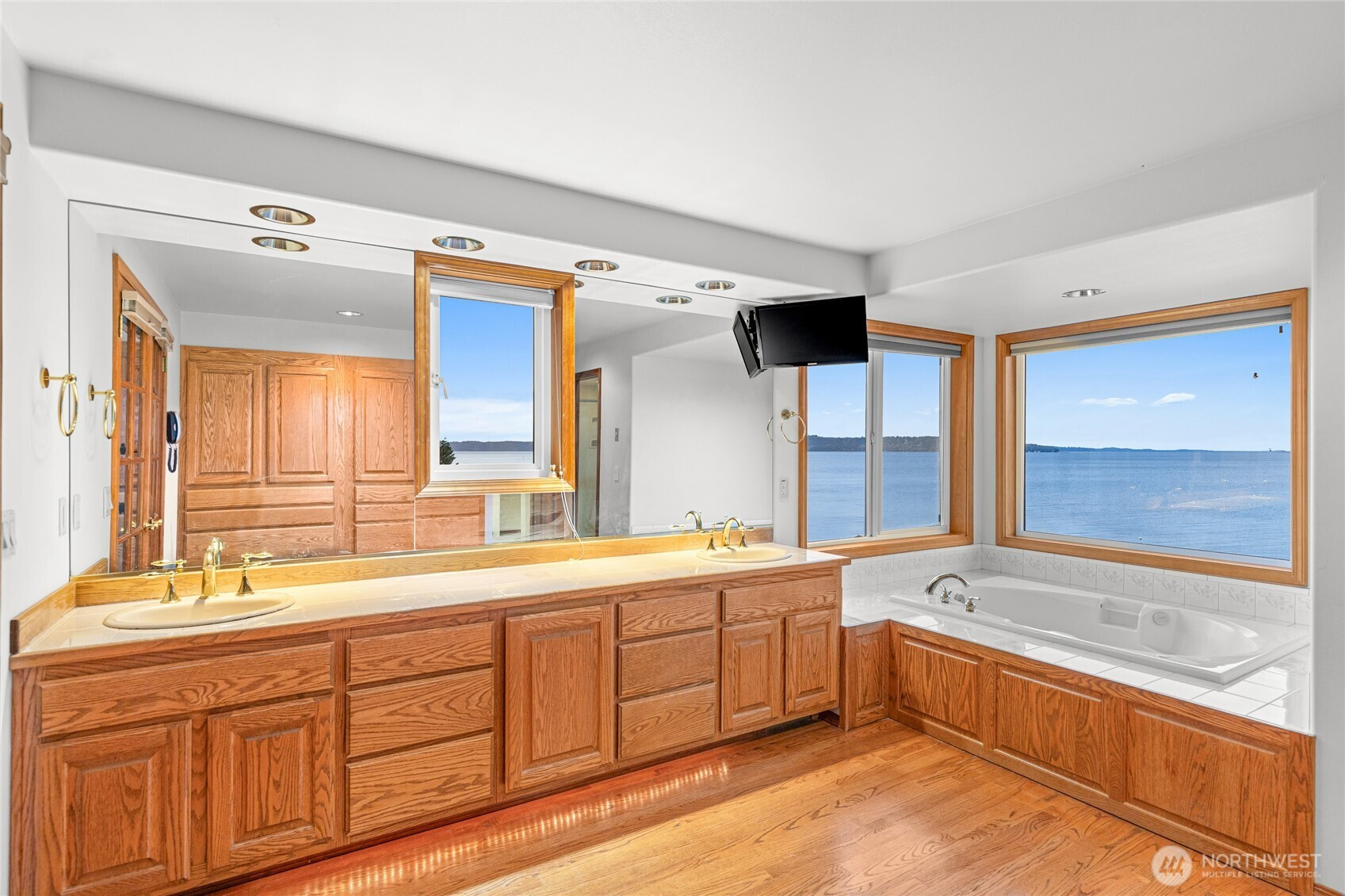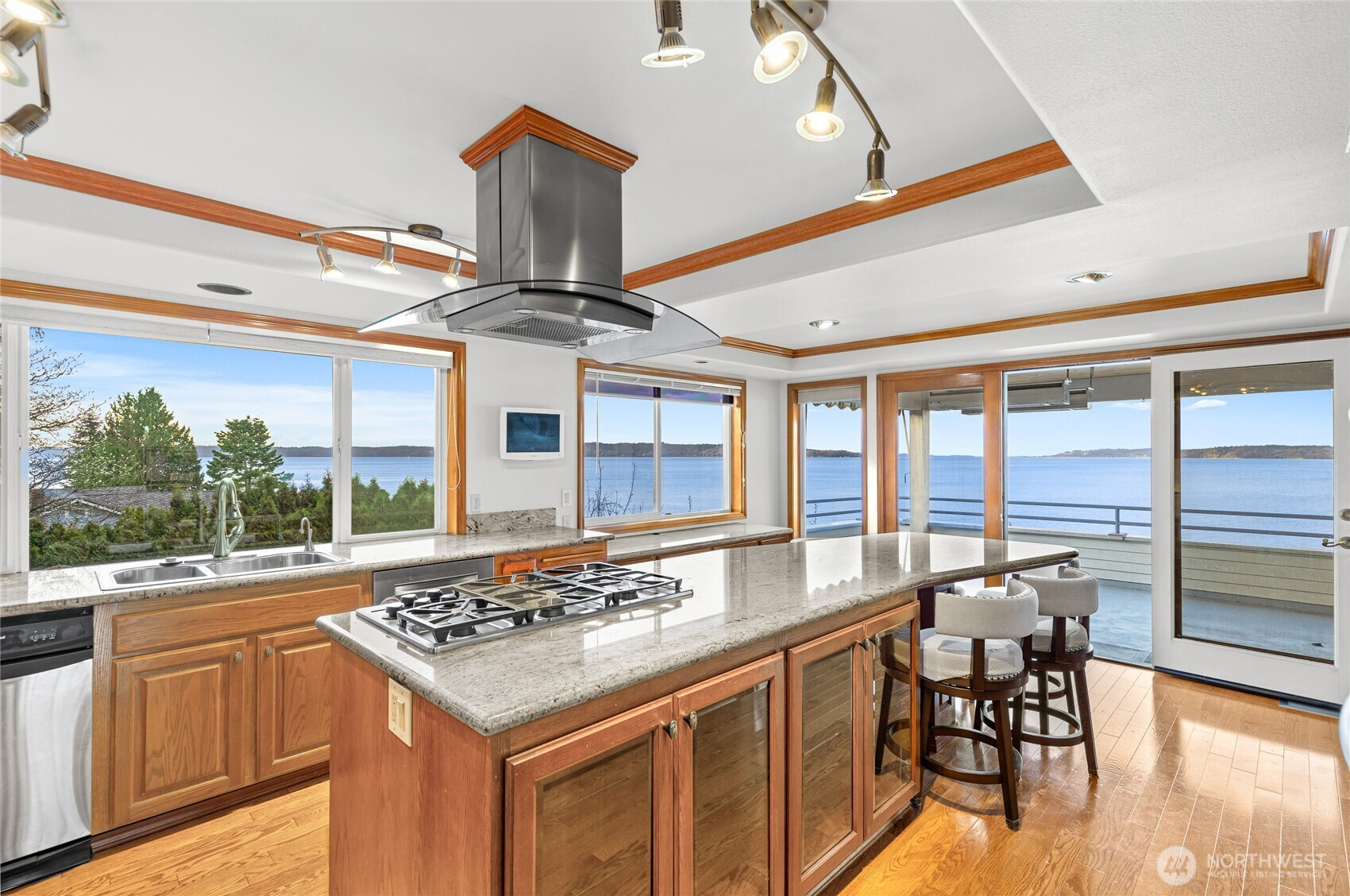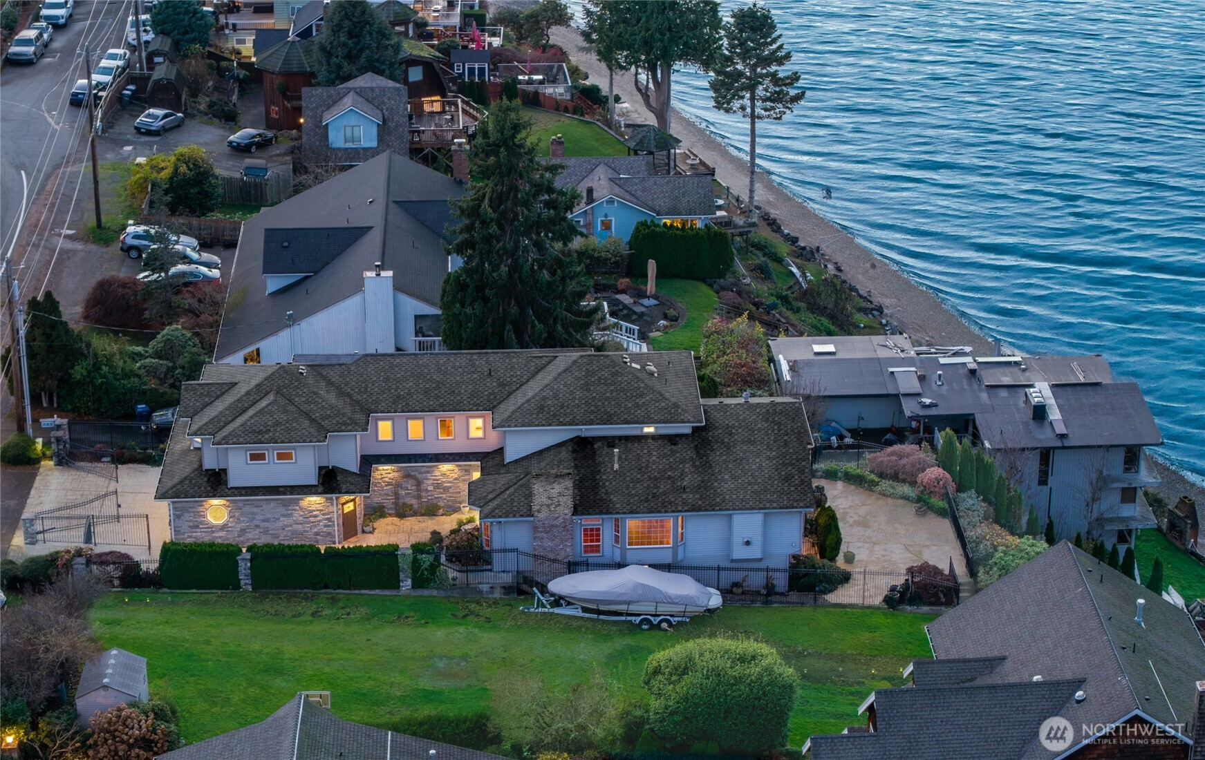 This stunning Redondo home features 50ft of prime waterfront with unobstructed of the Sound and mountains views. offering 5 bedrooms 3.5 baths, a dedicated office and a spacious great room. with two fireplaces on the main level. It blends luxury and comfort. The open floor plan highlights a chef's kitchen with a large island, perfect for entertaining. An in-home elevator provides effortless access to the upper level, completing this exceptional coastal life style property.