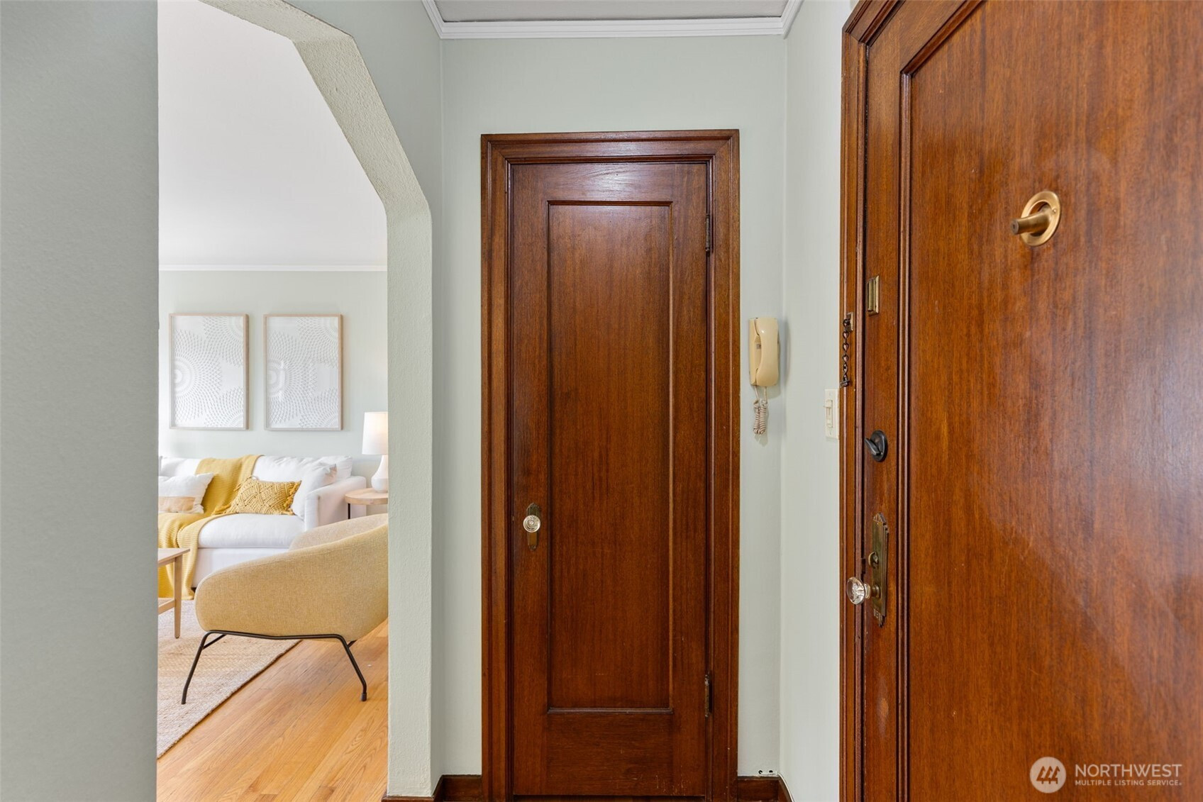Sweet studio living in this 1920’s Queen Anne classic, Olympus Manor. Light and bright with big windows and coved ceilings highlight the period details throughout. Mahogany doors and trim with charming crown molding frame this open layout. Hardwood floors and tiled kitchen lay the groundwork for this beauty to shine. Formal entry gives nice separation and a wide living space allows multipurpose arrangement with a huge walk-in closet. Wonderful kitchen has dining space with windows, display glass cabinets and a walk-in pantry. Close to Seattle’s iconic landmarks, entertainment and sports, parks and recreation. HOA dues include all the extras, property taxes too, with additional storage and laundry included.