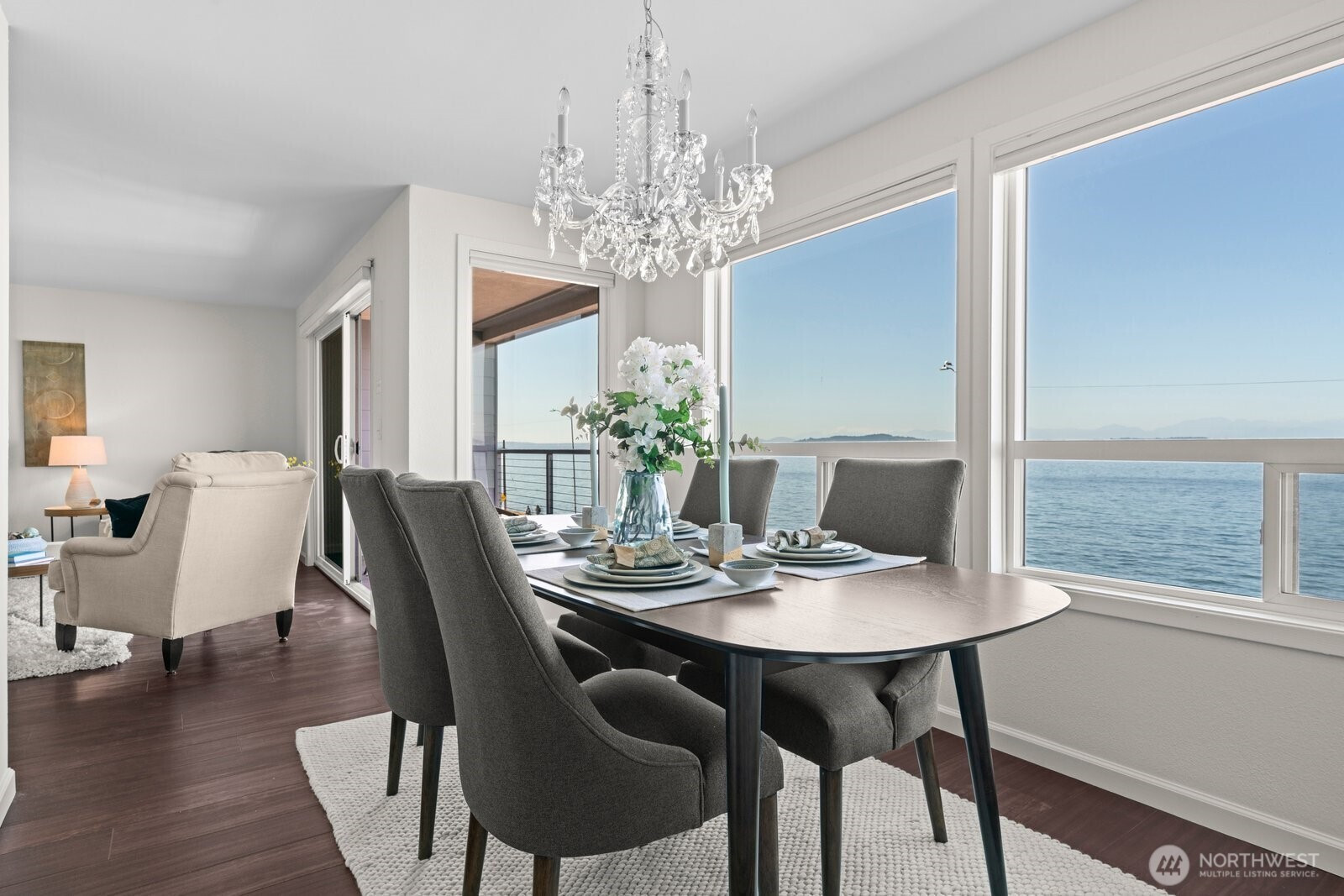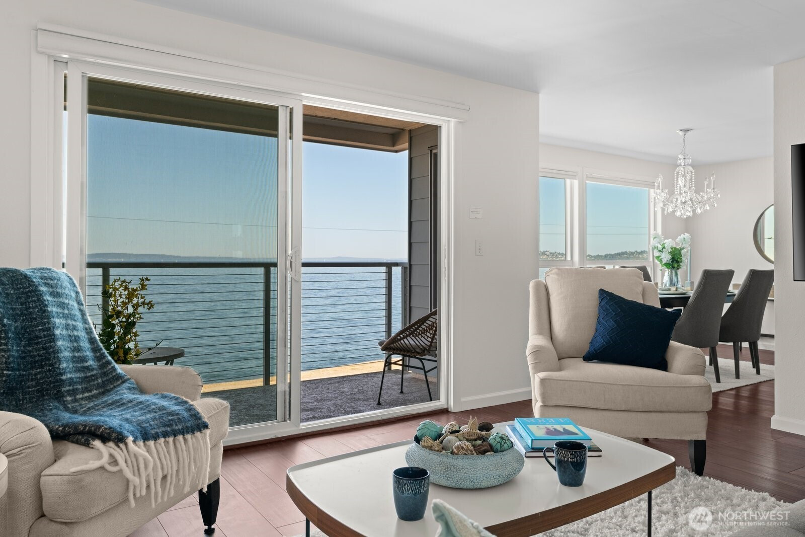 Perfectly located within walking distance to restaurants, and directly across the street from the shores of Alki Beach and boardwalk, this beautiful two-bedroom, two-bath condominium offers breathtaking, unobstructed 180* degree views of Puget Sound and the Olympic Mountains. Turnkey ready, featuring a modern kitchen with high quality cabinets and quartz countertops, fresh interior paint, easy-to-maintain LVP flooring, dining room with wrap around windows, and great room with oversized sliding glass door offering access to private balcony. Two nicely appointed bathrooms, and two considerable bedrooms, including a primary suite with walk-in closet, dual vanity, and elegant tiled shower. One-car parking space in secure garage.