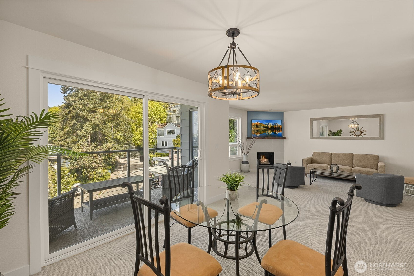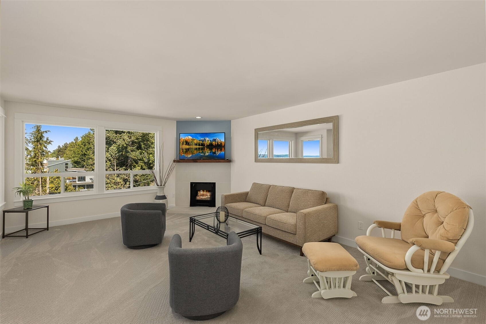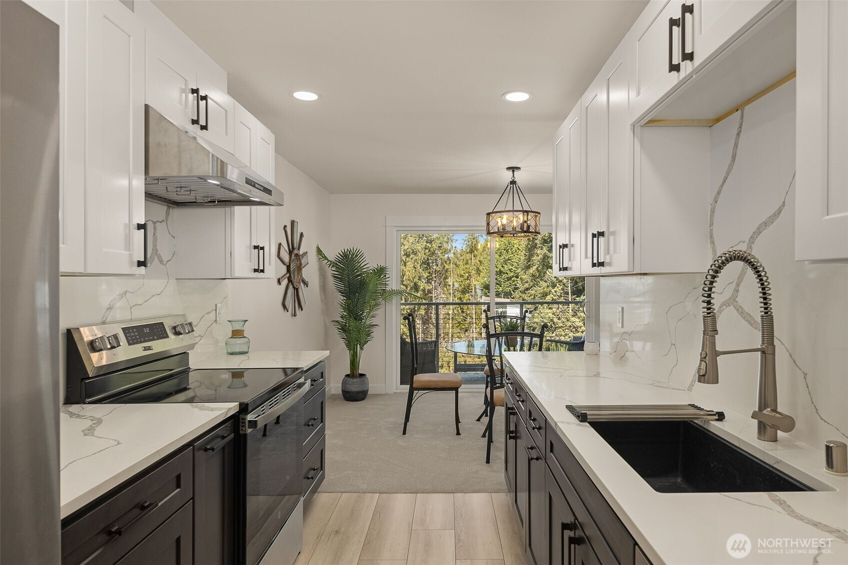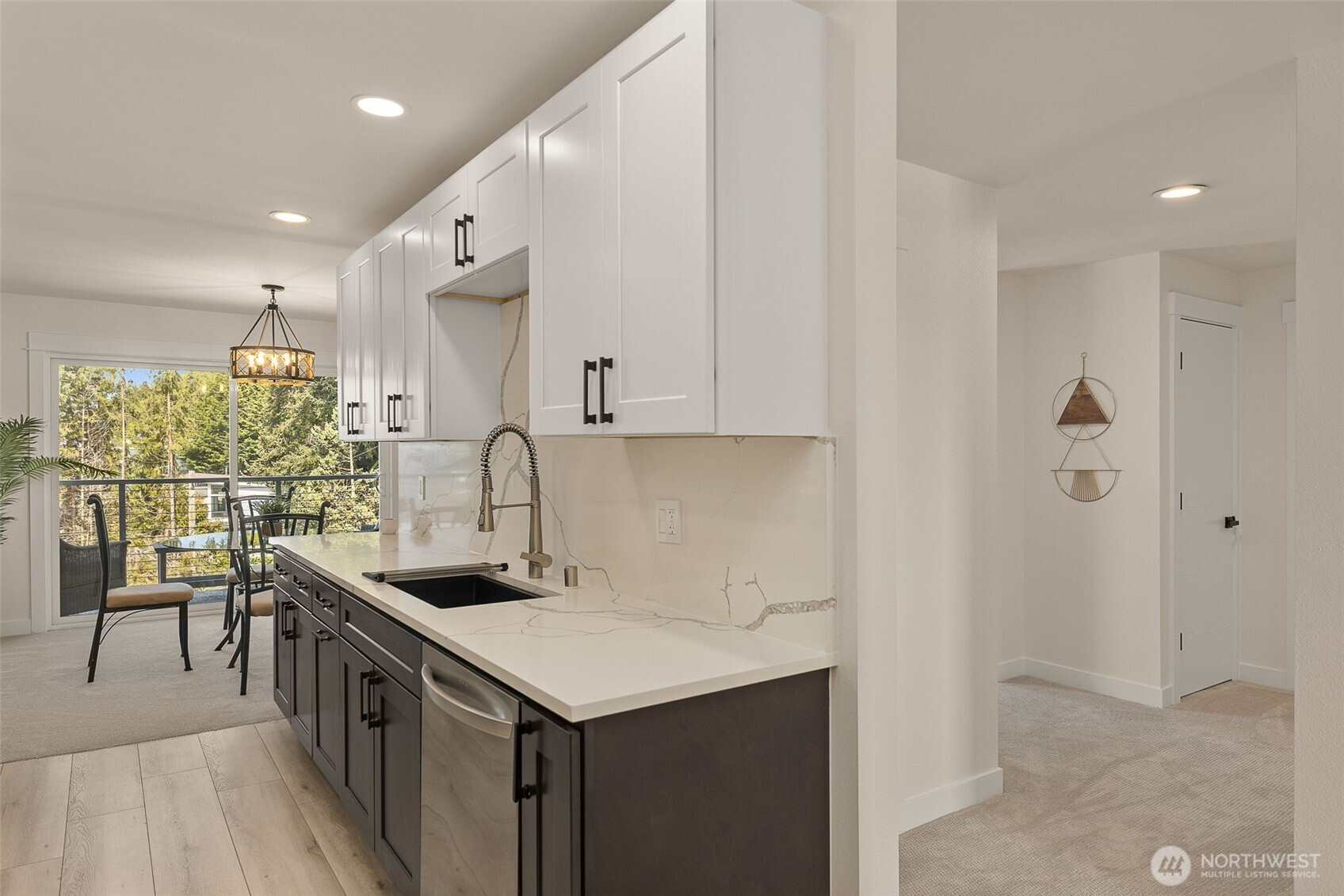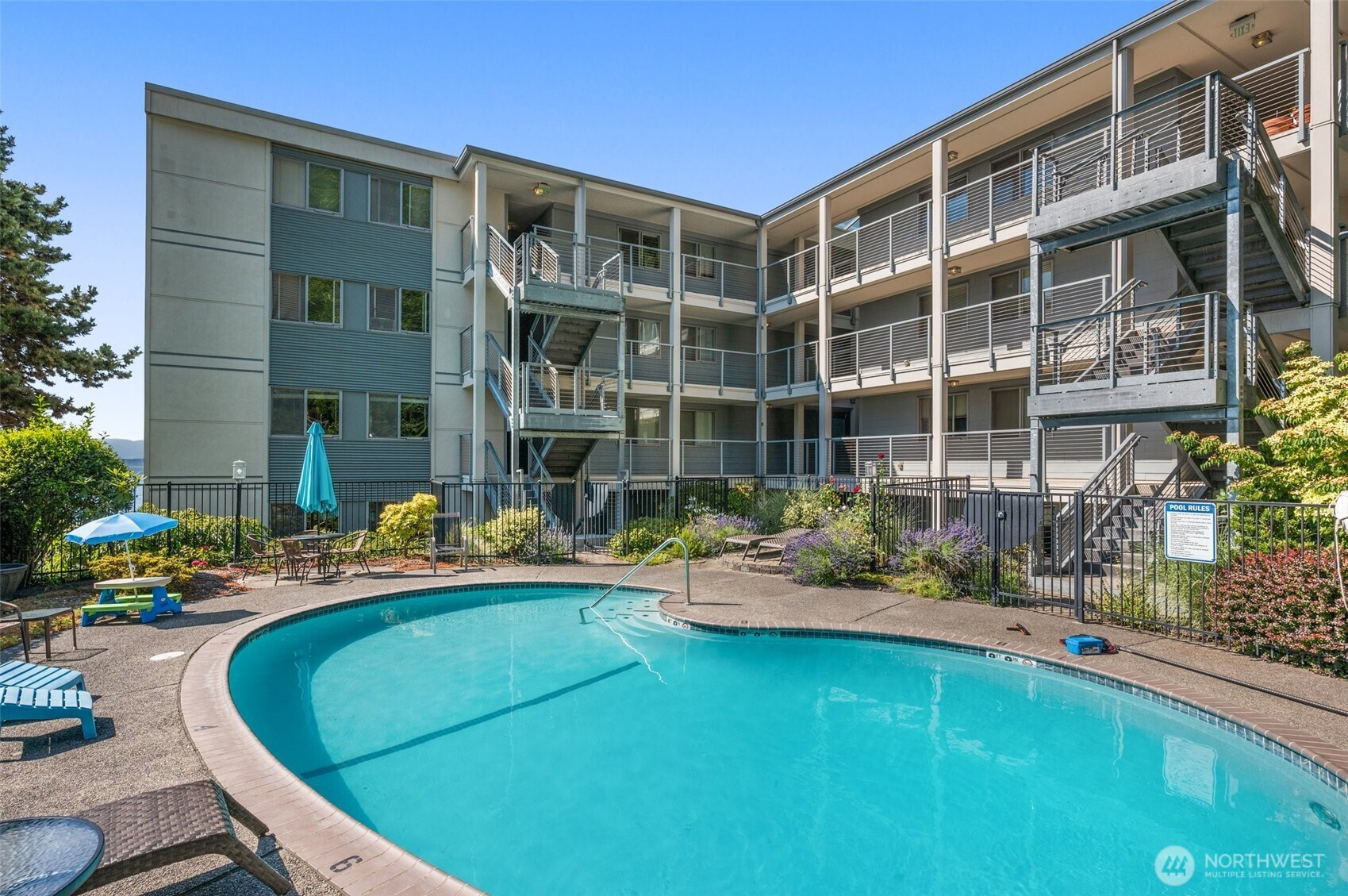 Beautifully Updated Top floor 2bed/1.75 bath/1354 sq ft condo features: New kitchen cabinets-w/pantry cabinet, Quartz counter tops and backsplash, all new appliances incl. washer/dryer, new bathrooms, flooring, doors, trim and paint, updated fireplace surround, and wet bar with cabinet and wine rack. Additional features incl. gas FP, laundry room w/cabinets, nice balcony/deck off dining area, sauna located on 3rd floor, outdoor pool, Includes 1 parking space in shared garage w/elevator access from garage = NO STAIRS, Located within 10 min. N/S bound I-5, Fabulous views from LR, DR, and bedrooms. Seller to Pay 1 yrs worth of HOA dues ($780 a month = $9360).