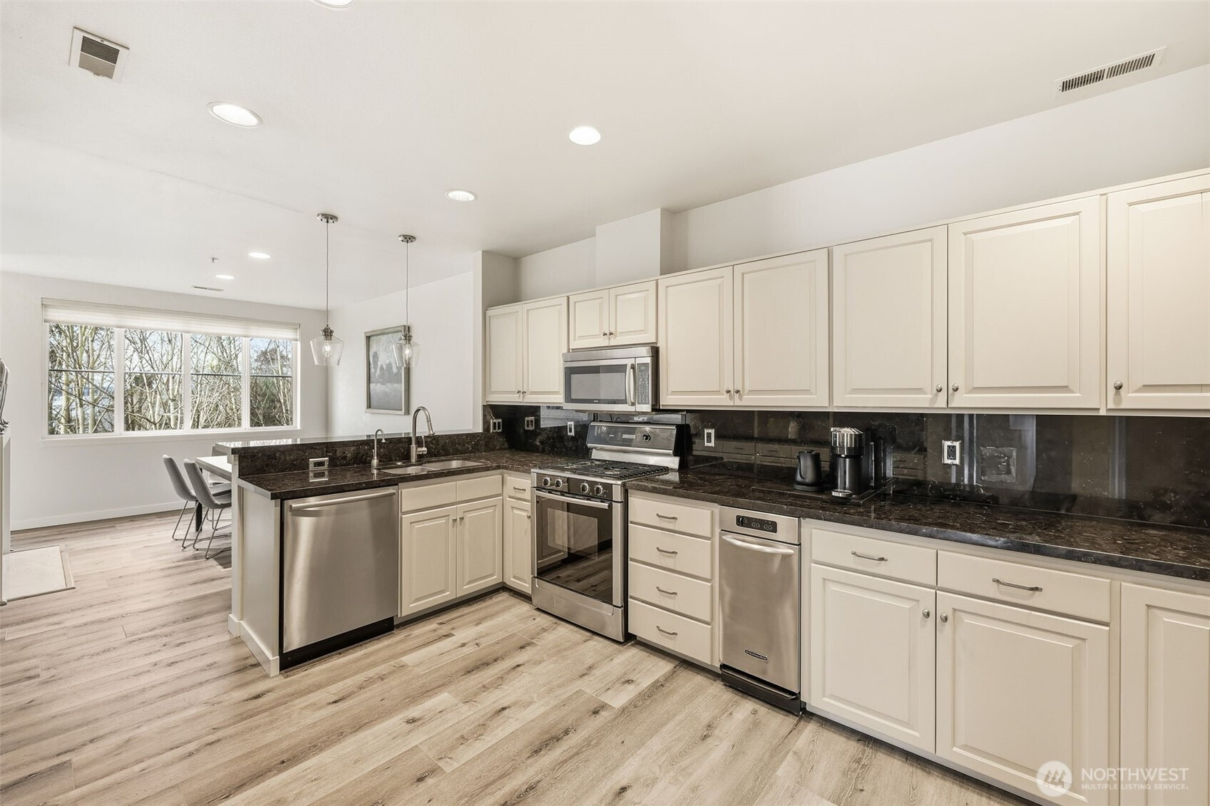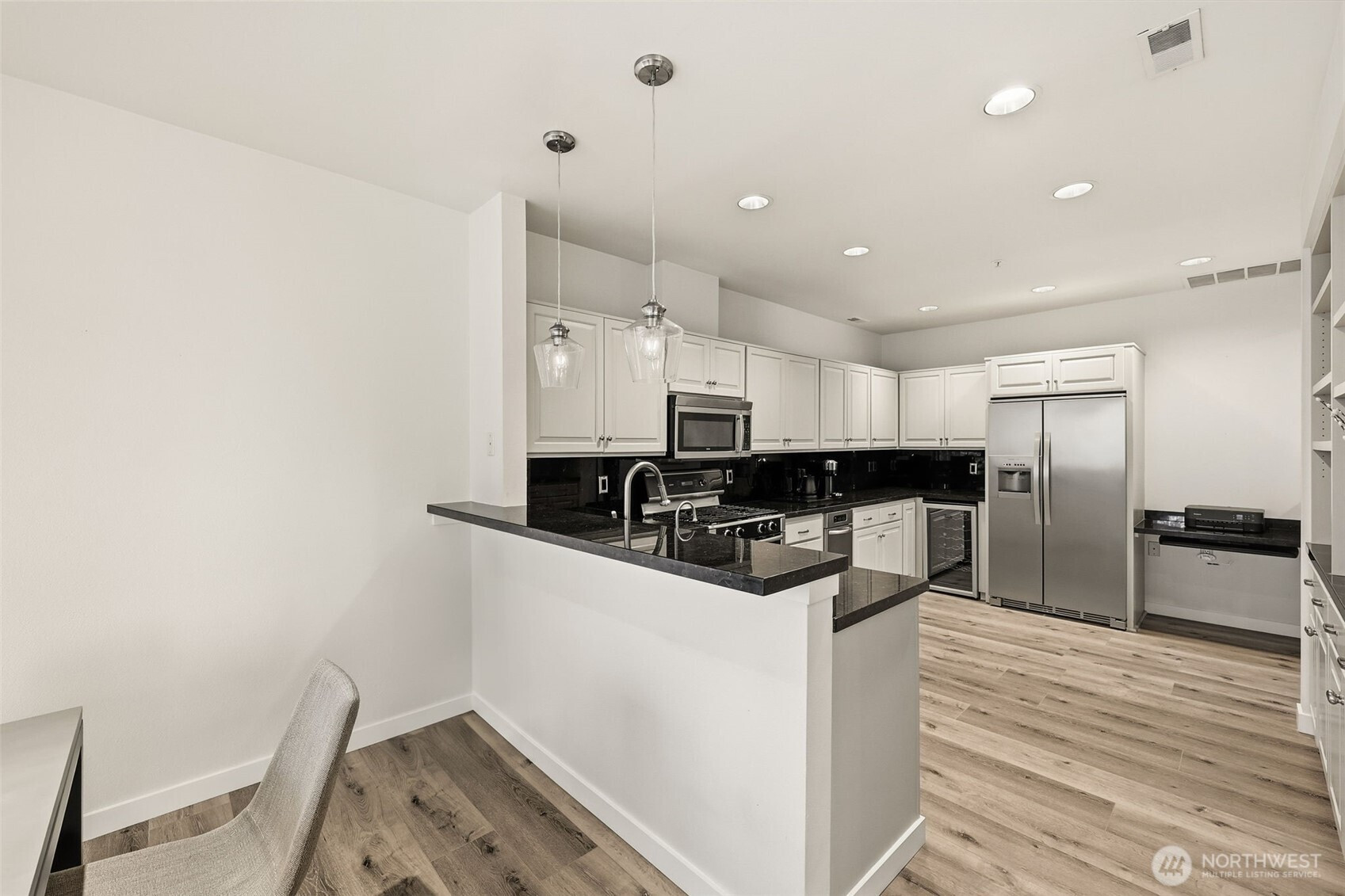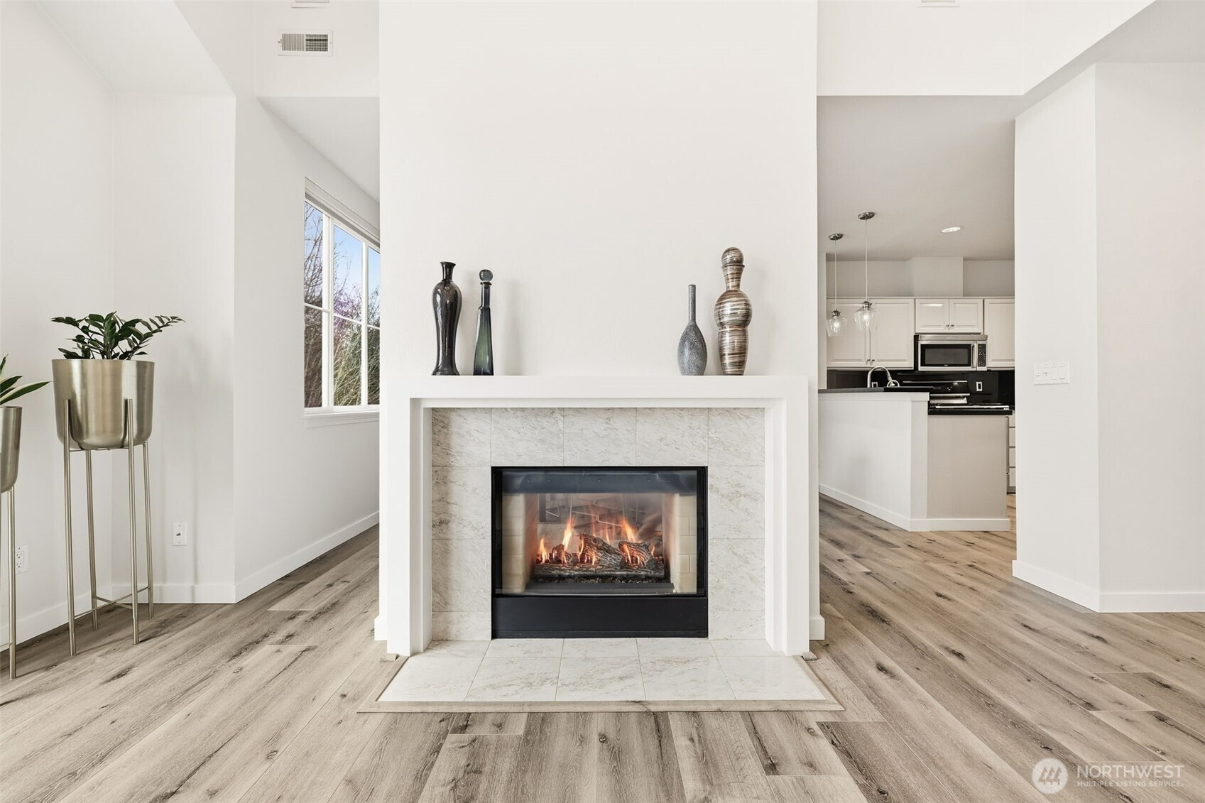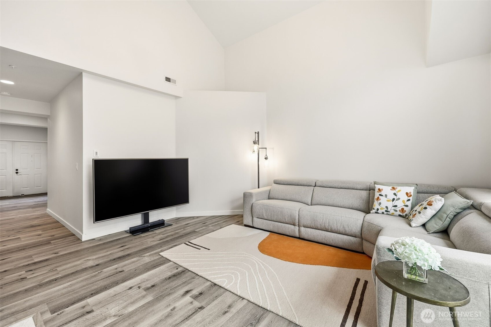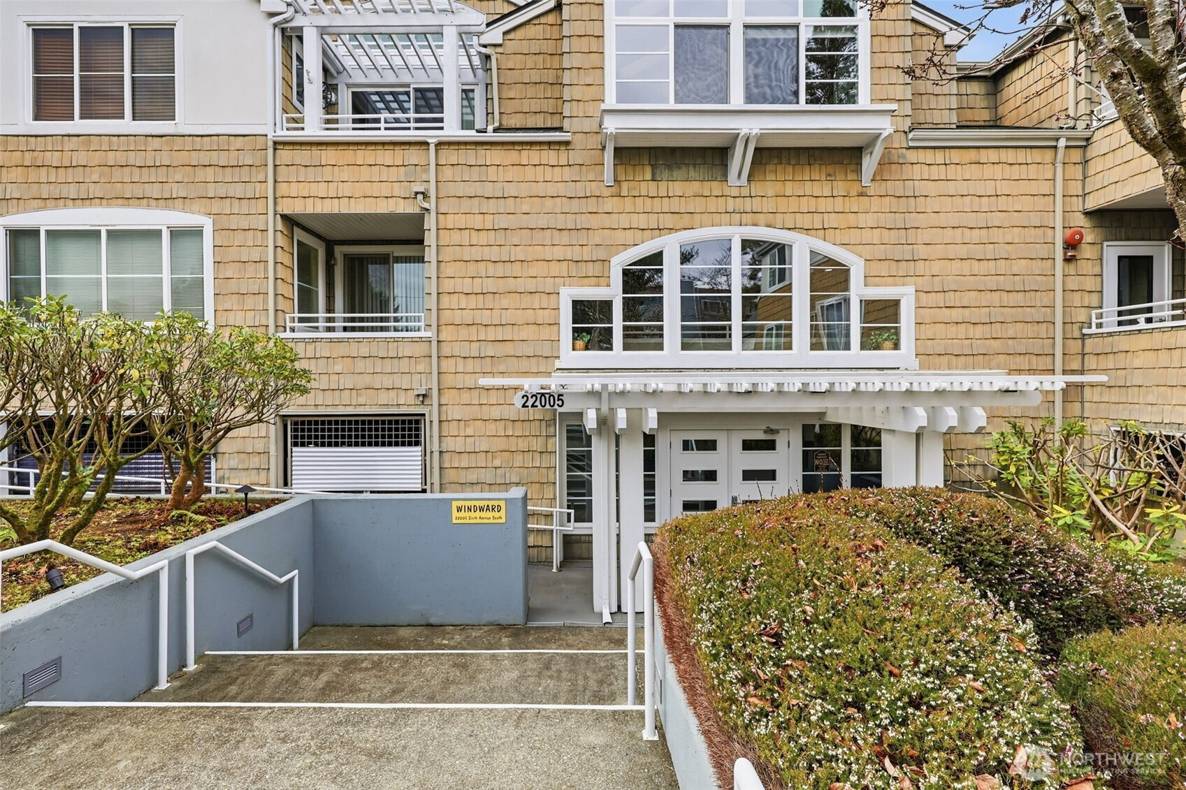Experience the rare intersection of panoramic serenity and modern sophistication in this premier top-floor corner unit. Positioned to capture partial Puget Sound views and lush canopy vistas, this residence offers a level of privacy and light seldom found in urban living. Every detail has been curated to provide a move-in-ready sanctuary optimized for a refined lifestyle. The open-concept living area features dramatic vaulted ceilings that create an airy, expansive atmosphere. A brand-new modern chandelier serves as the focal point, casting a glow over the sophisticated interior. Two new glass doors lead to your private balcony, bridging the gap between the living room and coastal air. High-end updates include new HOA-approved Luxury Vinyl Plank (LVP) flooring throughout, ensuring a quiet-zone environment. This high-performance home includes 2 dedicated secured parking spaces, elevator access, and a gas fireplace. Managed with excellence, the building features secured entry and a prime location within the Windward community. This is a strategic asset for those who value privacy, serenity, and coastal convenience. Situated in the heart of Des Moines desirable waterfront corridor, you are minutes from the regions best lifestyle assets.