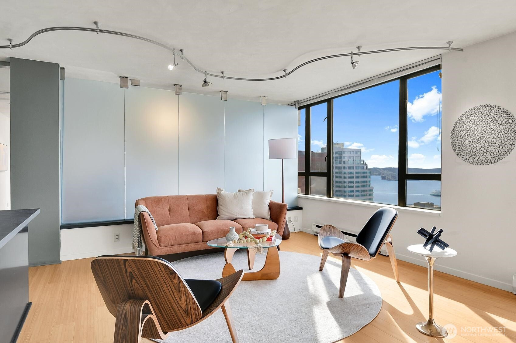 The ultimate Seattle Lifestyle..the Puget Sound at your feet, stunning views of the Olympic Mountain range and city lights! One watches the world float and steam by...freighters, cruise ships, eagles soar and the occasional orcas may be sighted! And did we mention the STUNNING sunsets? This home will take your breath away. There are three private balconies to enjoy the ever changing views. Light-filled with the western exposure, this home features abundant natural light. This urban oasis provides easy access to all that Seattle offers- Pike Place Market, the Olympic Sculpture Park, shops, restaurants, the Seattle Space Needle and the wonderful new waterfront promenade and Aquarium. Once home for the evening, the office /den meets all your needs, fabulous open kitchen with a view and of course and the primary suite featuring the city's skyline. The 7th floor touts an exercise center, an inside pool, a hot tub and sauna. A club house, and even a guest suite for rent. And the deck is not to be missed! All utilities are covered by the well run HOA. Pet friendly, no rental cap, secure garage and building. Welcome home!