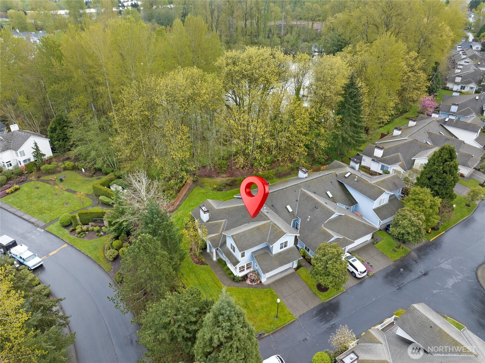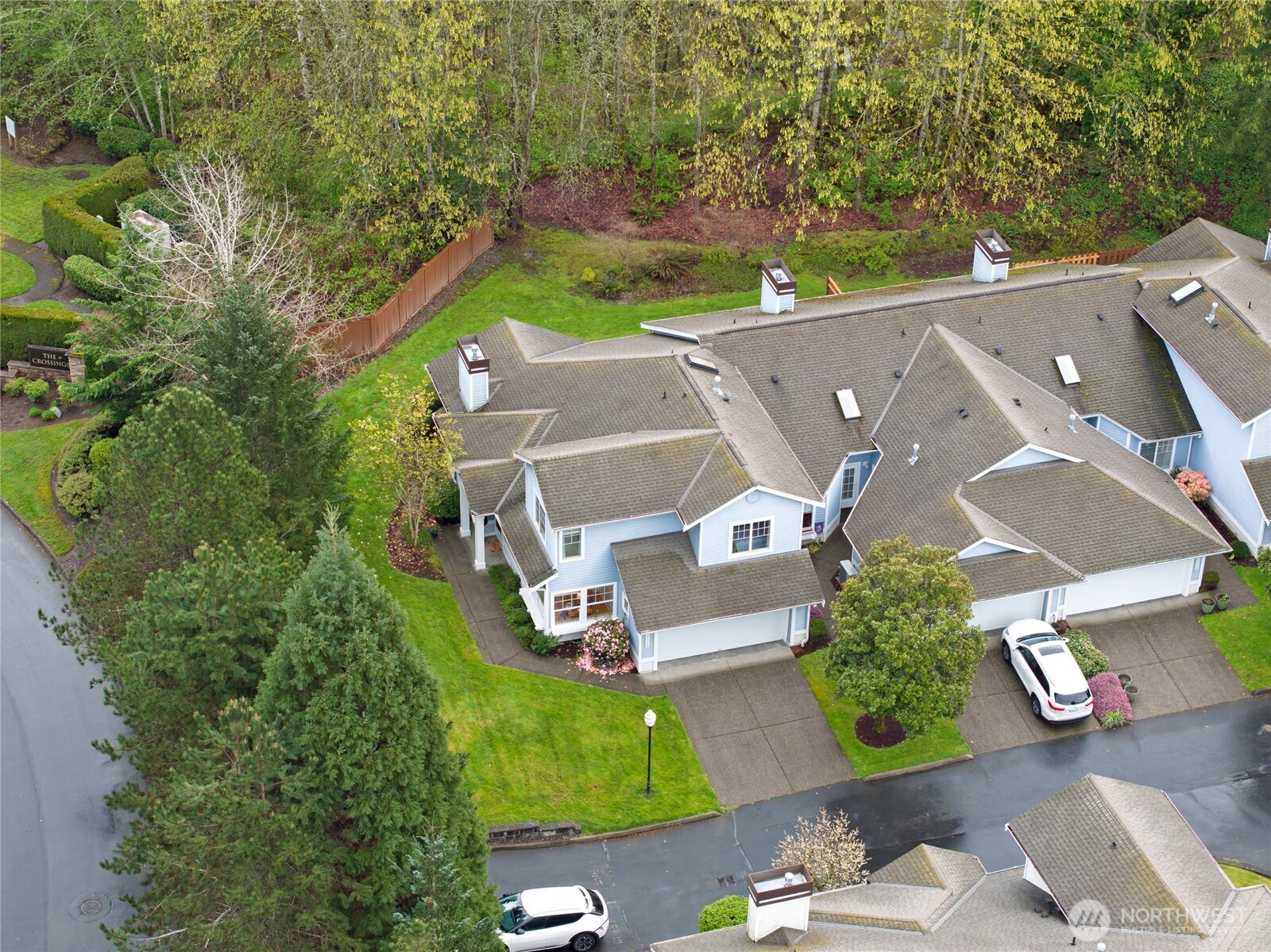 Pristine patio-style end-unit townhome in the gated community of The Pointe at Riverview, perfectly positioned against a tranquil permanent native growth area for a peaceful, natural backdrop. Located at the end of the community, on a dead-end, ensures exceptional privacy, and conveniently located next to two guest parking spots! -- This light-filled residence lives large with soaring vaulted ceilings, abundant windows, and quality finishes throughout. The thoughtful design features natural, calming colors and a sought-after main-level primary suite, complete with a spacious walk-in closet and a five-piece bath with dual vanity. The kitchen is bright and welcoming, opening seamlessly to the dining area and inviting living room with cozy gas fireplace—ideal for both everyday living and entertaining. Upstairs offers two generously sized bedrooms, a 3/4 bath, and an open loft that functions perfectly as a home office or relaxed sitting area. Enjoy your own plush, level yard and patio—perfect for summer evenings or morning coffee. Additional highlights include gas heat, beautiful hardwoods, new carpets, white millwork, on-trend lighting & ceiling fan, and lots of white-vinyl windows to let the natural light in. Enjoy an attached two-car garage for convenience, storage, and security, plus the added benefit of a quiet end-unit location with exceptional natural light. A wonderful opportunity for easy living in a well-maintained, gated community!