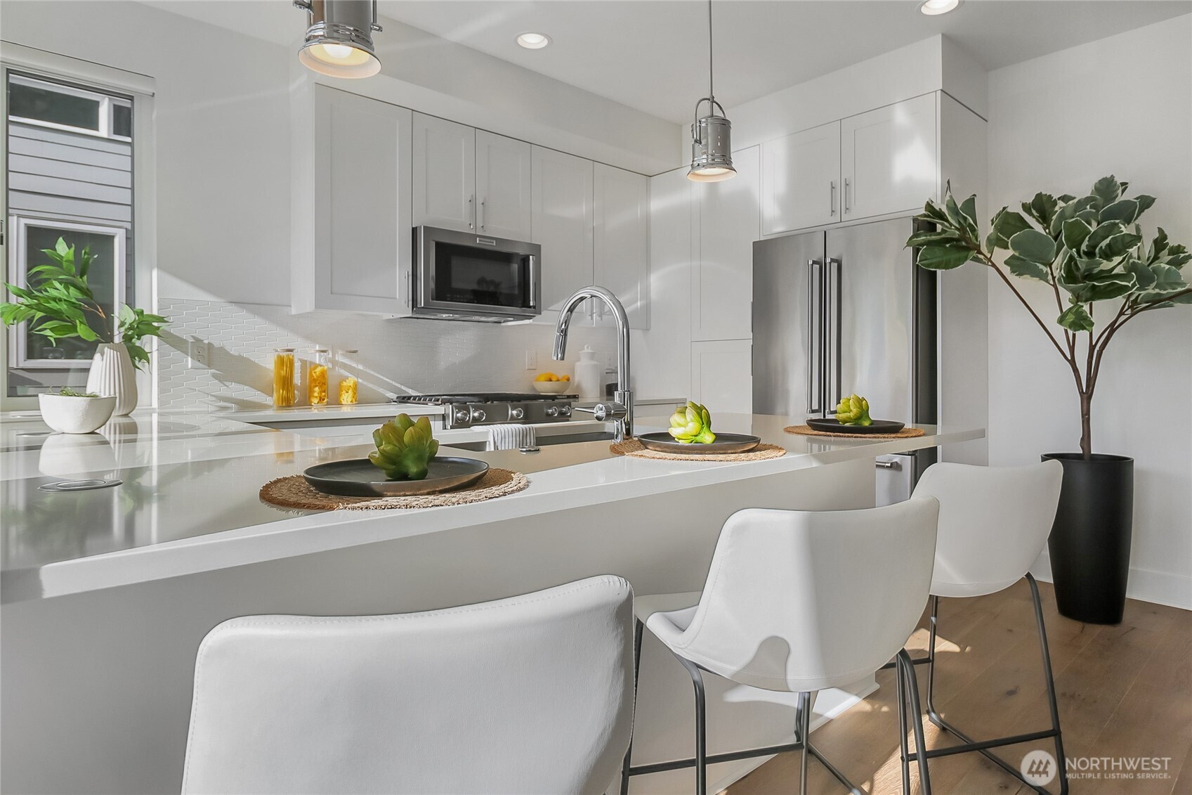 Sophisticated downtown Kirkland townhome in the sought-after City 12 community, offering refined, low-maintenance, lock-and-leave living in a premier location. Built in 2018 and meticulously maintained by the original owner, this 2-bedroom, 2.25-bath residence is filled with natural light on every level, giving the home a bright, polished feel throughout the day. The well-designed main living level features clean architectural lines and contemporary finishes, with a balcony off the kitchen—ideal for morning coffee or dining al fresco. Hunter Douglas motorized window blinds add everyday convenience and a refined aesthetic. The primary suite includes a well-appointed bath and generous closet space. Energy-efficient mini-split systems provide year-round comfort and flexibility. Attached two-car garage. HOA dues are notably competitive compared to other downtown Kirkland townhomes, supporting long-term value. Ideal for buyers who value efficiency, simplicity, and ease—whether commuting, traveling, or enjoying weekends away. Conveniently located near Kirkland Urban, the Google Campus, nearby beaches, dining, shopping, and the amenities of downtown Kirkland—an exceptional turnkey opportunity in one of the Eastside’s most competitive markets.