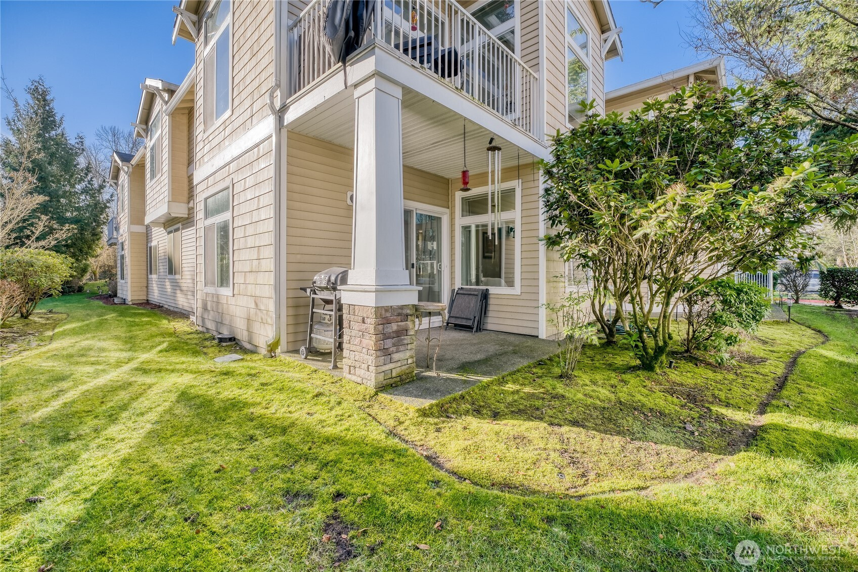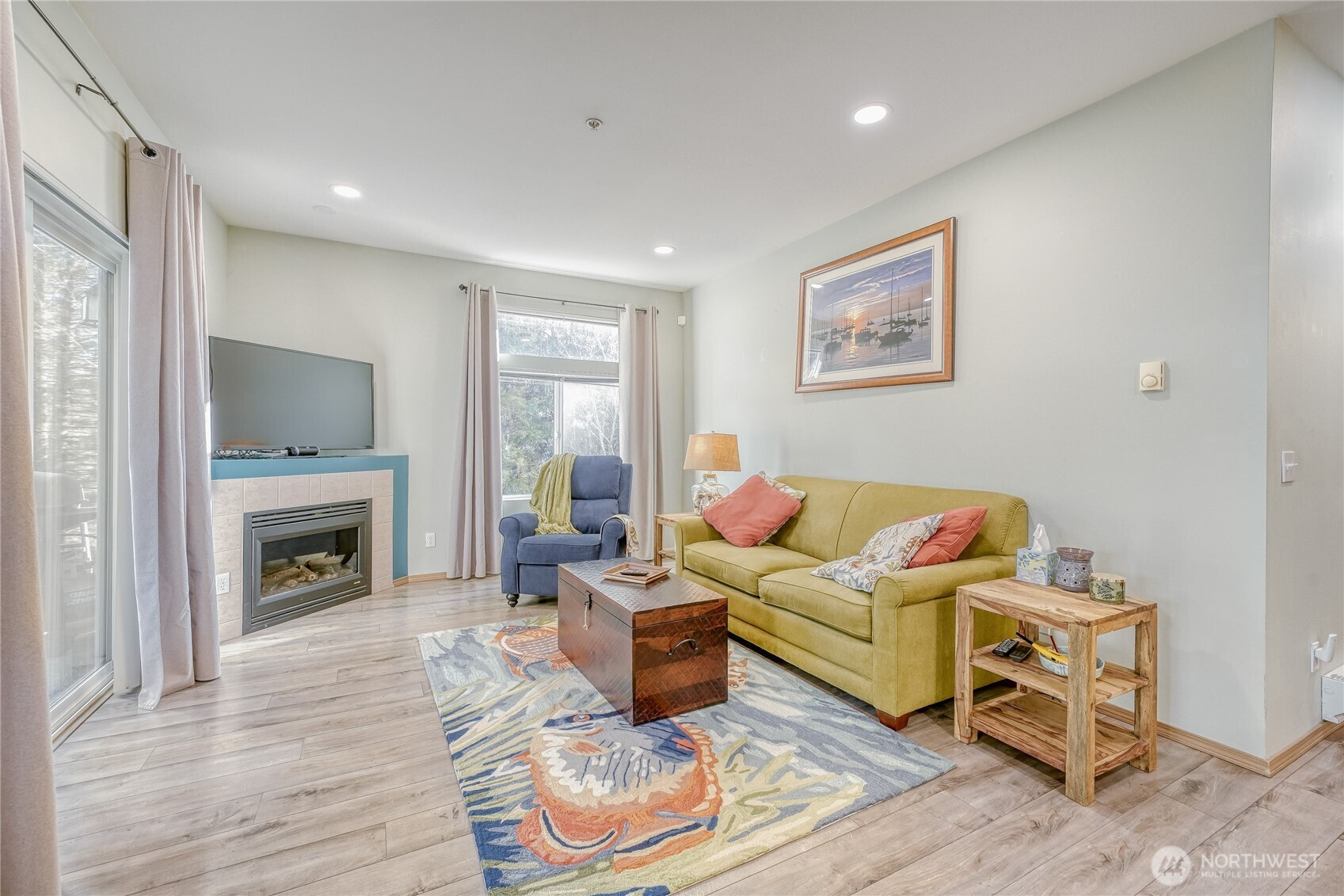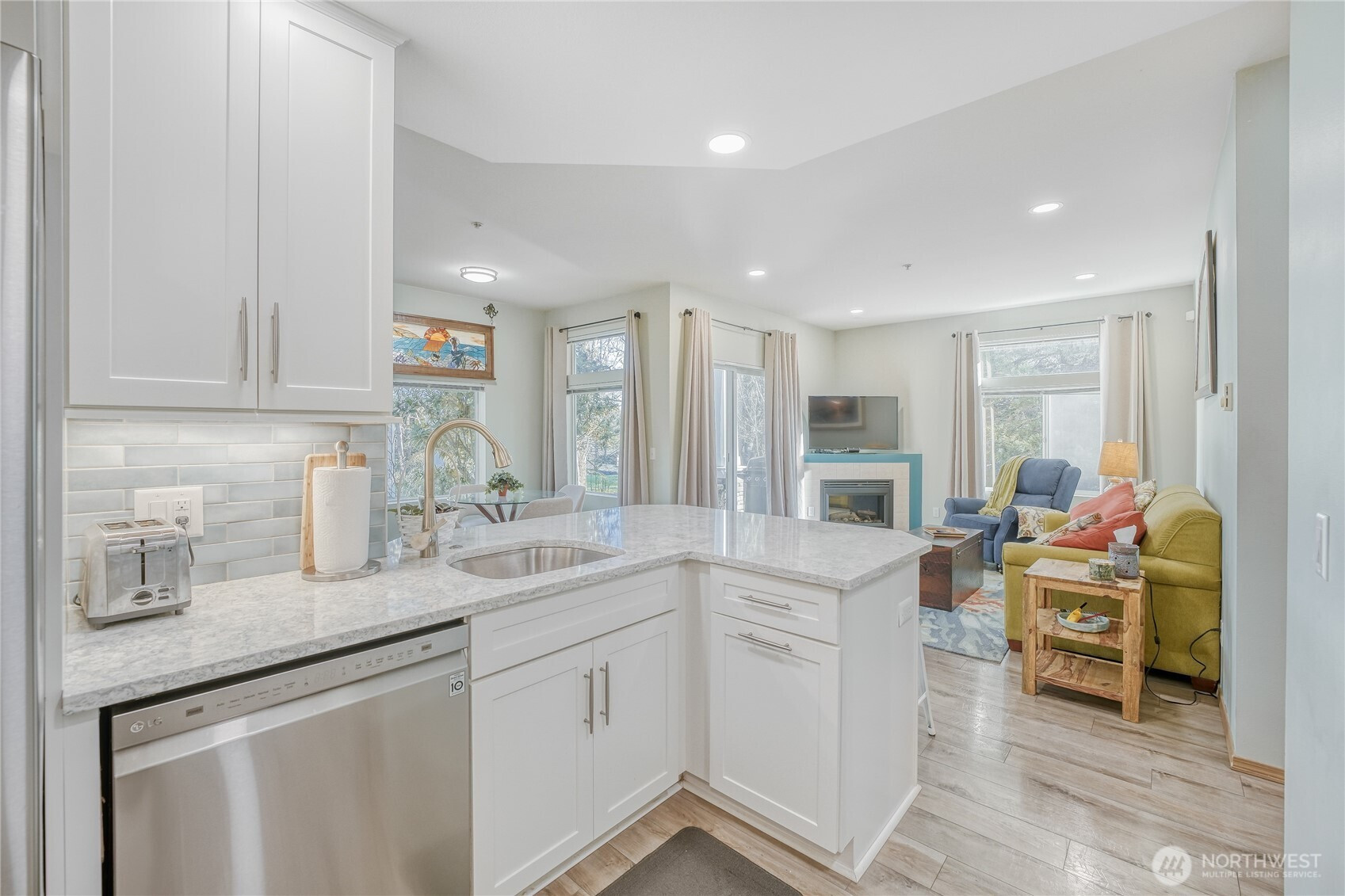 Commuter-friendly comfort meets peaceful surroundings at Terrace at Riverview. This move-in ready, ground-floor end residence backs to a tranquil, park-like setting and offers a private patio framed by greenery, an ideal spot for morning coffee or evening unwinding. Inside, thoughtful updates elevate the home throughout. Engineered hardwood floors anchor the main living areas, while durable LVP enhances both bathrooms. The remodeled kitchen blends beauty and function with Thomasville cabinetry featuring pull-out slides and soft-close drawers and doors, paired with Cambria Montgomery quartz countertops for a timeless, high-quality finish. The open-concept design connects living, dining, and kitchen spaces with ease, creating a layout that feels both spacious and inviting. Two generously sized bedrooms and two full baths provide flexibility for guests, work-from-home, or everyday comfort. The primary suite offers a walk-in closet and a soaking tub designed for restorative end-of-day relaxation. An attached garage adds exceptional value with abundant space for storage, outdoor gear, or even a small fitness setup. Ample guest parking throughout the community makes hosting simple. Residents enjoy walking trails, playgrounds, and shared green spaces within a quiet neighborhood known for its welcoming atmosphere and great neighbors. Ideally positioned near Southcenter Mall with quick access to I-5, commuting to downtown Seattle and surrounding areas is convenient and efficient.