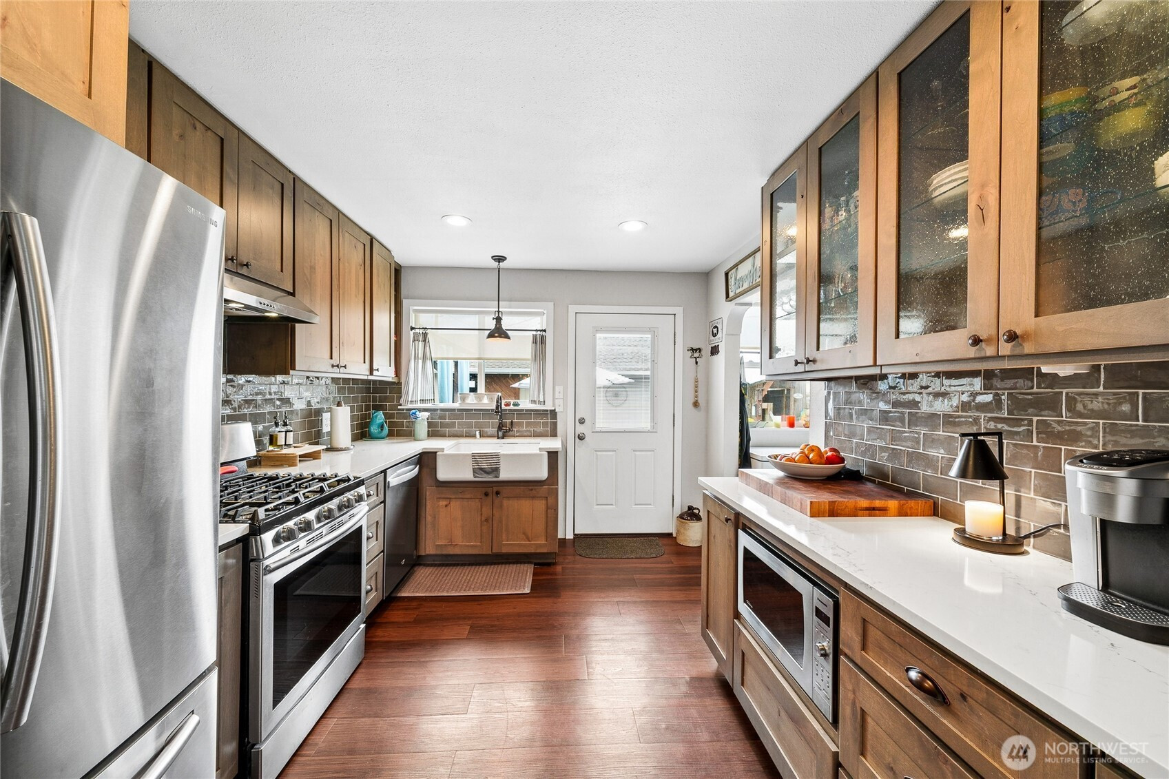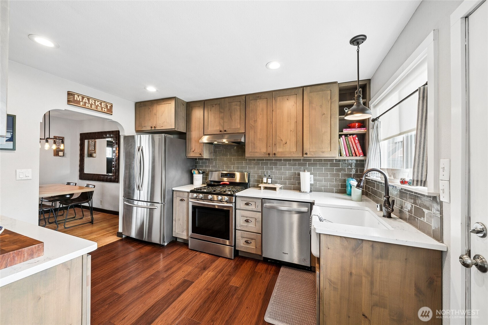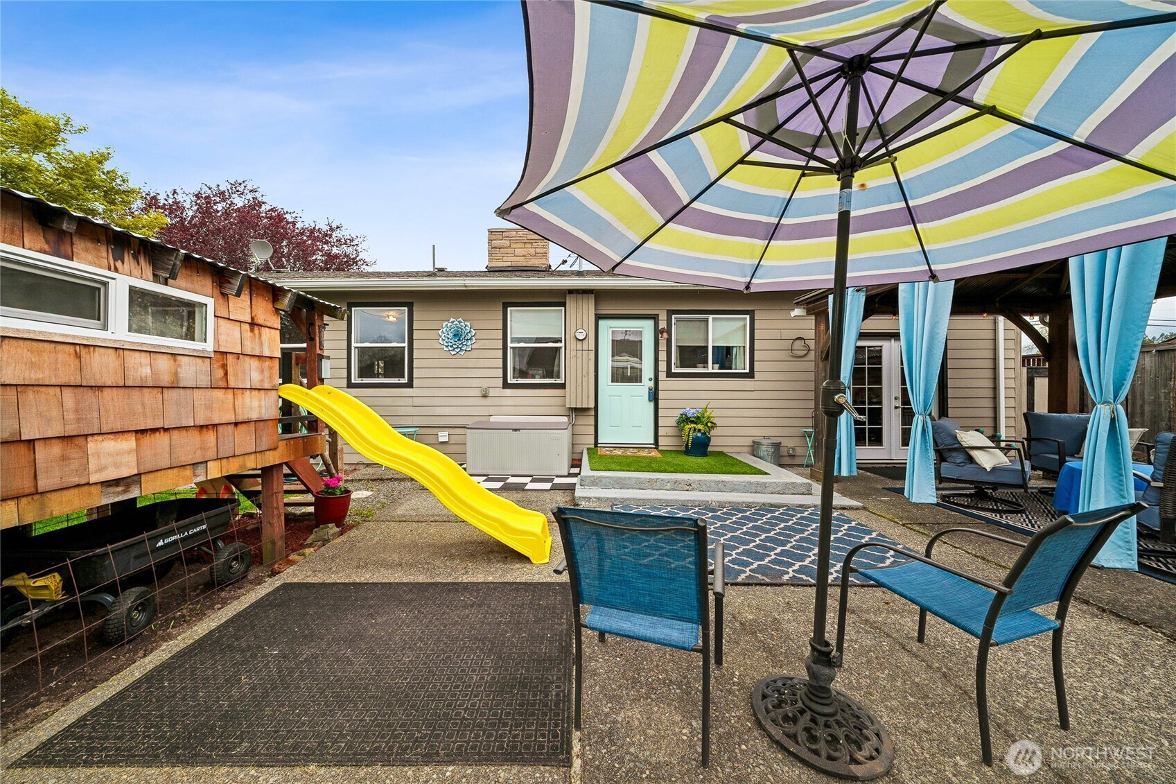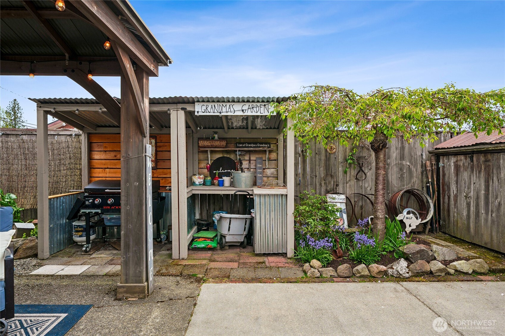Some homes just feel right the moment you walk in. This sweet 4-bedroom, 1-bath rambler wraps you in warmth from the very first step — original hardwood floors, timeless mid century arched doorways, and custom details that speak to a time when homes were built with care. And yet, nothing feels dated. The kitchen has been beautifully refreshed with quartz countertops, real wood cabinetry, custom tile backsplash, stainless appliances, and custom lighting that makes every meal prep feel a little more special. Step outside and you'll find a generous backyard made for lazy weekends, gardener's dreams, or just soaking up Summer evenings under the beautiful oversized gazebo! Covered BBQ area and potting shed! All of this, just a short stroll from the charm of downtown Enumclaw — local shops, coffee, seasonal parades, and community right at your doorstep. A/C, RV parking, Hardi plank siding, fully fenced for your puppies and privacy. Perfect shop for the craftsman, hobbiest or car enthusiast. Classic craftsmanship. Curated updates. Unbeatable location. This home leaves your maintenance worries behind, it's already been done.