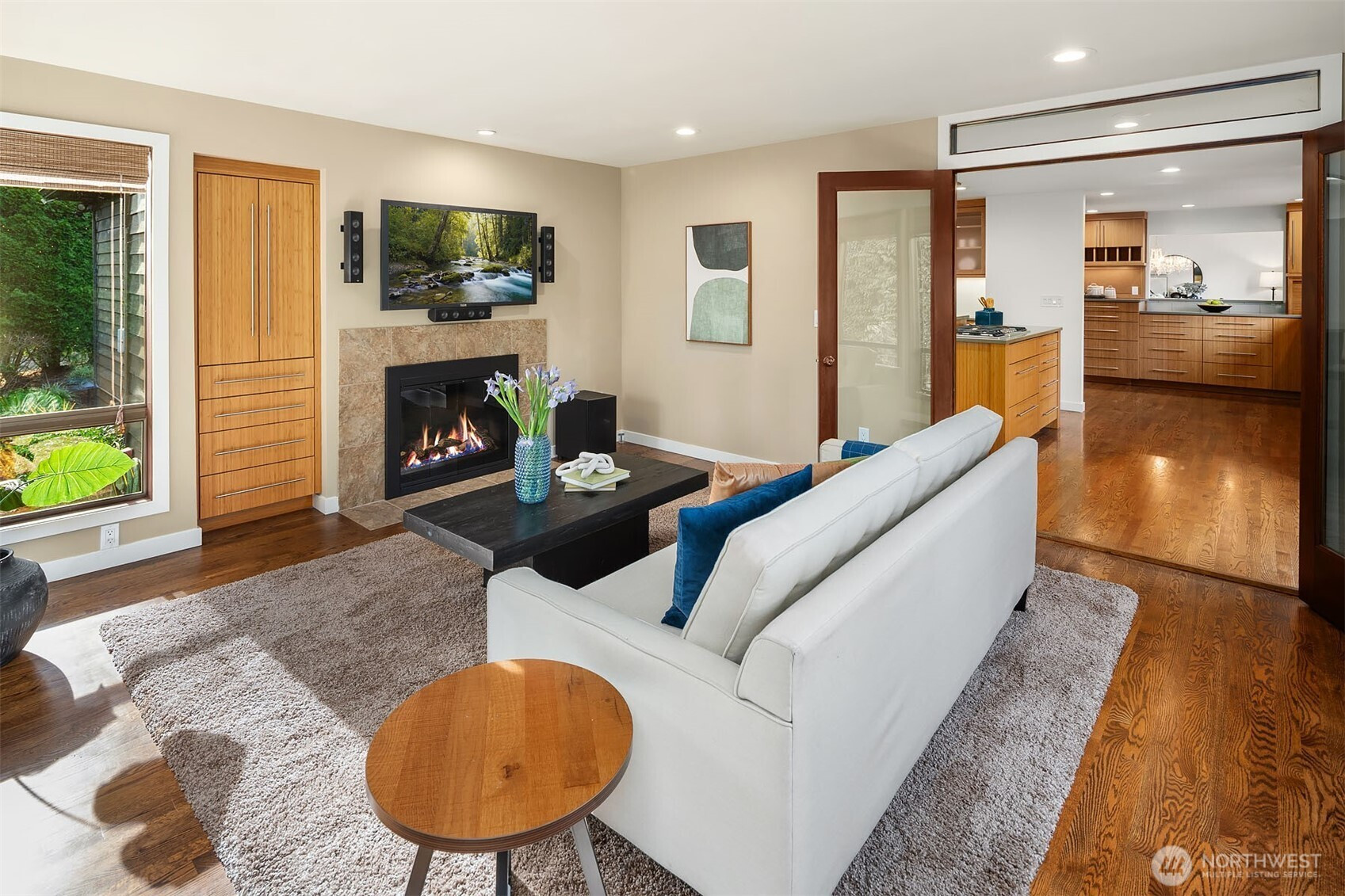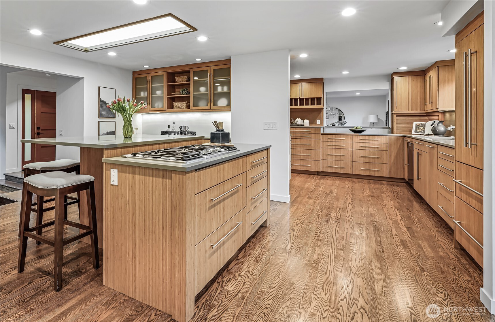(503) 893-8874Positioned in a quiet enclave of three homes, this fully renovated NW contemporary home offers privacy and proximity. Thoughtful updates throughout include nutmeg-stained hardwoods, custom grain-matched cabinetry, slab quartz counters, and windows with garden views that create an ambience of quiet sophistication. Spaces are designed for connection: a vaulted living room with a gas fireplace, media-ready family room, and an epicurean kitchen that's as beautiful as it is functional. A generous island creates a space that naturally becomes the home’s gathering hub, whether for casual dining, extra work space, or visiting with the cook. Upstairs, the primary suite features a sitting area and spa-inspired bath, which is joined by two additional bedrooms with a shared hall bath. A main-floor guest room with Murphy bed and ¾-bath adds flexibility for visitors or office use. Outdoor living shines with an ironwood deck adorned with cable railing and a gas-plumbed fire pit, accessible from the kitchen and formal dining room, making it perfect for intimate gatherings or alfresco entertaining. A level, park-like side yard has limitless possibilities for recreation and gardening. Lush landscaping, mature hedging, and the private lane setting provide exceptional quiet, yet just minutes from Downtown Bellevue’s dining, shopping, parks, and convenient freeway access. A rare opportunity for turnkey contemporary living in an award-winning school district and an unbeatable in-city location.