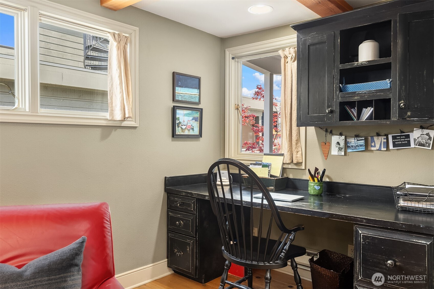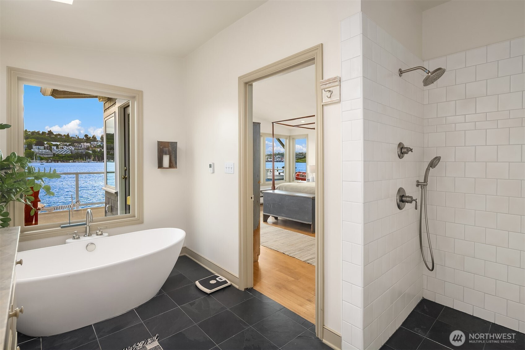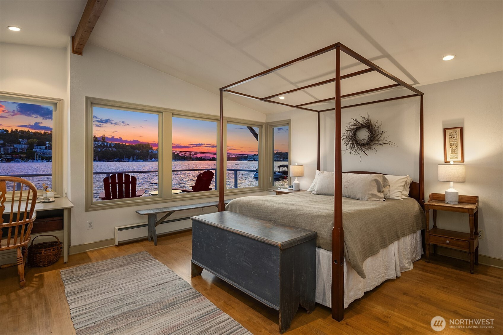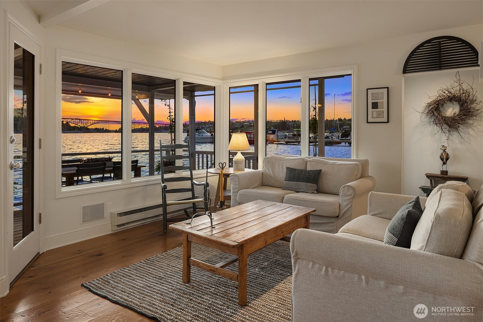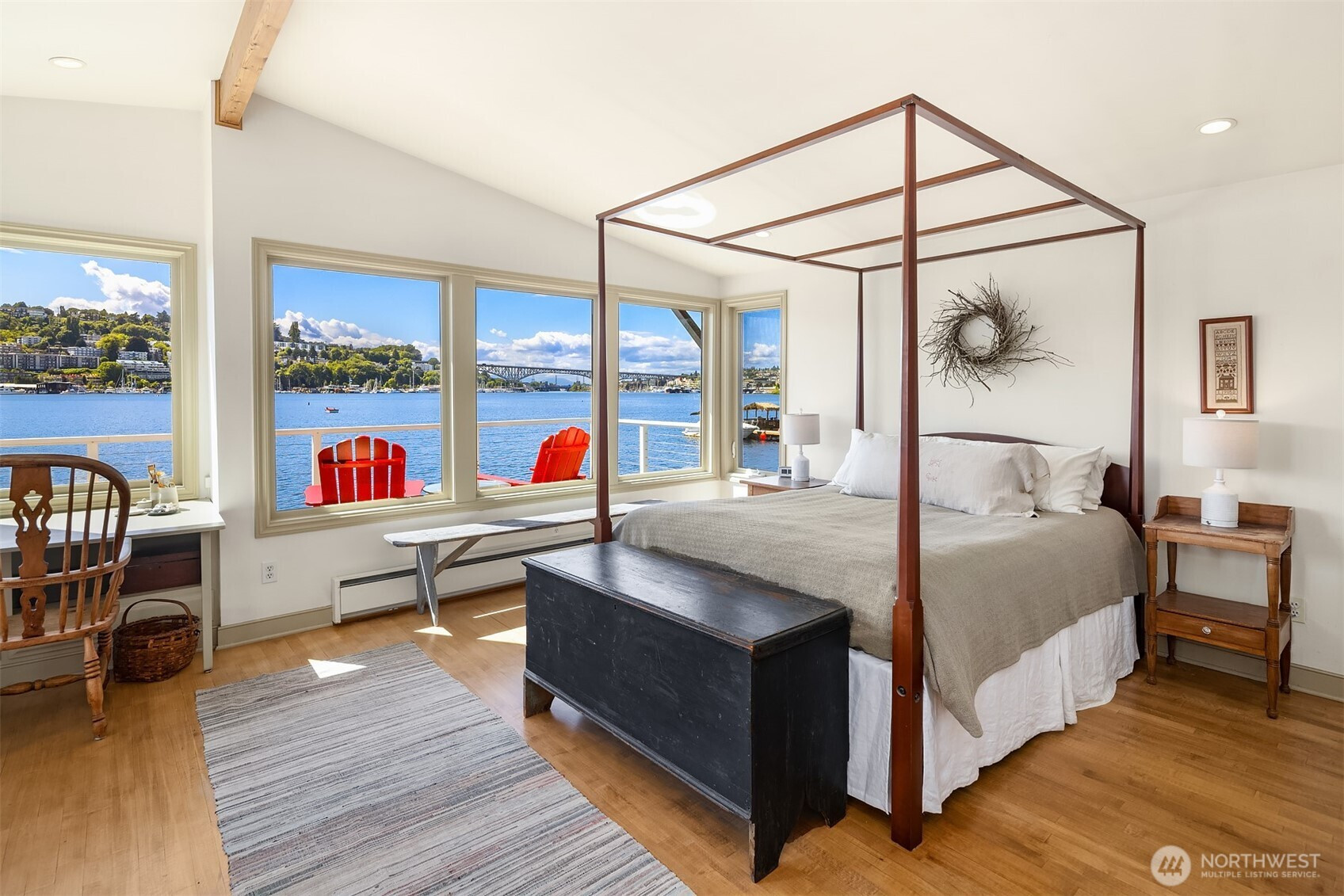 Rare, front-row classic. A floating home that captures everything we love: timeless character, thoughtful craftsmanship, a graceful blend of vintage charm and modern comfort. Wraparound windows frame postcard views of the Aurora Bridge, Queen Anne, Gas Works Park and beyond. Effortless flow on patinated pine between kitchen, dining, den and living areas where a cozy fireplace and built-ins add warmth and soul. A covered porch where sunsets and friends linger. Upstairs, three bedrooms, a vaulted primary suite with Space Needle views and private deck to bask in the sun. Boat moorage + kayak float. Shared lawn with picnic table, garden, & woodshop. Private garage. Steps from Pete’s grocery, Eastlake eateries. A once-in-a-lifetime opportunity.