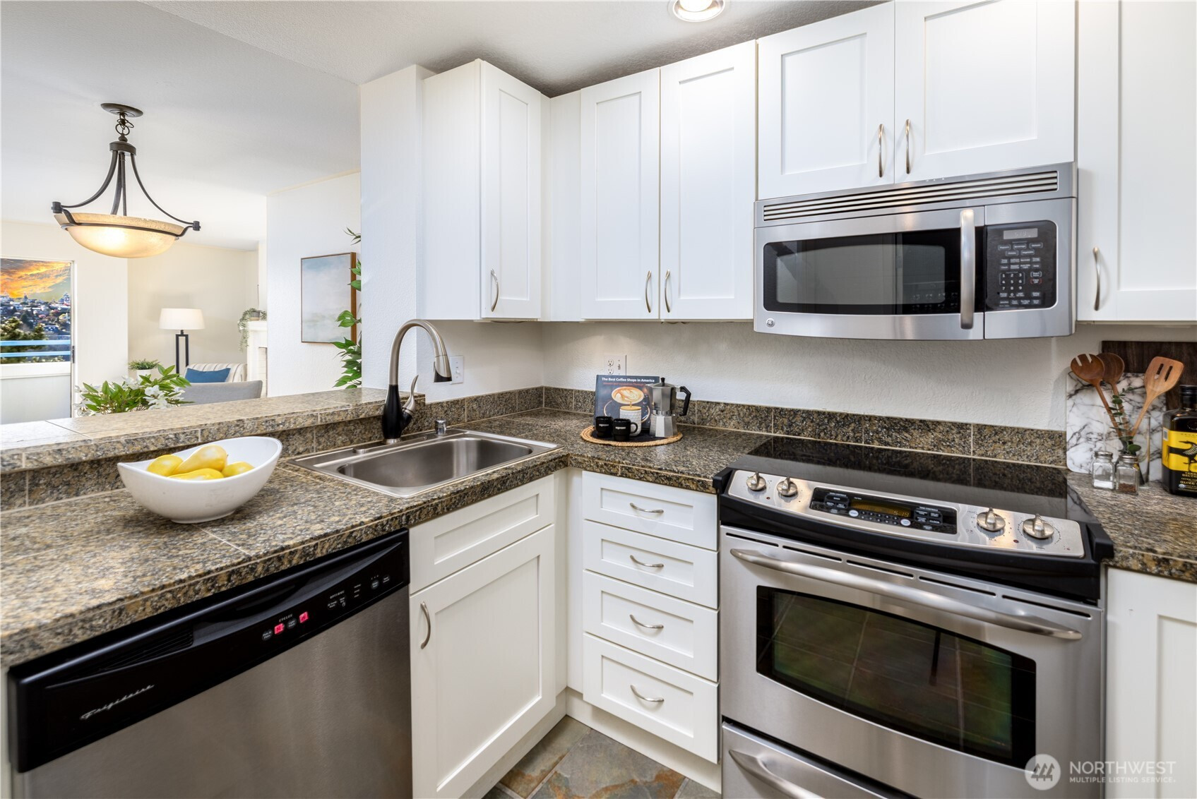 Perched high in the crow’s nest of Queen Anne’s Ocean View condominiums, take in the salt air, undulating Elliott Bay views and spectacular sunsets from your coveted top floor captain’s quarters. Complete with private lookout, access your expansive covered verandah from the living room and bedroom suite for indoor-outdoor living amidst the call of seagulls and hum of float planes as ferries glide between islands, sailboats slip into Smith Cove and ships dock at historic Pier 91. From the galley, peep views from the porthole window as you prepare fresh, local seafood—natural light and water views are enjoyed from every room. If simple city living and stress-free daily access are in your wheelhouse, you’ll appreciate the ease of arrival—from your secure garage space next to the elevator that delivers you right to your front door—the convenience of in-unit laundry, and use of the gym, sauna and lounge all without leaving home. From your doorstep, plant veggies in the community garden, perfect your swing at Interbay Golf Course, picnic at Myrtle Edwards, and ride or run along the bay to Waterfront Park and Promenade. Your central Queen Anne location is moments from Downtown, Ballard bars and restaurants, Fremont coffeeshops, farmers markets and Whole Foods. Stock up on provisions for smooth sailing ahead while keeping an eye on the horizon from your top deck.