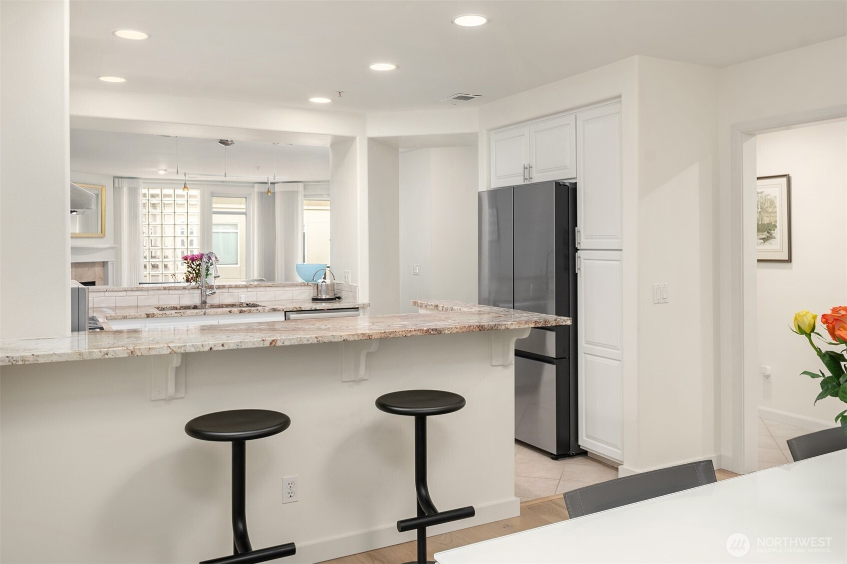 Experience luxury living at the Brezza, in the heart of Downtown Kirkland This amazing location places you within walking distance of shops, restaurants, Marina Park,+ Kirkland Urban space, provides easy access to I-405 & major tech hubs. Open floor plan two-bedroom, one level 1,440 sq feet, 2 baths, gourmet kitchen w/stainless steel appliances-including wolf range, breakfast bar, dining area, new engineered wood wide plank flooring, spa inspired primary bath, gas fireplace, central A/C , HVAC w/Air Scrubber/Purification,2 parking+2 storage & new paint in entire unit including kitchen cabinets. Amenities include 2 guest suites, on-site manager, community room w/ kitchen, conference room, courtyard, bike & kayak storage, guest parking+ gym.