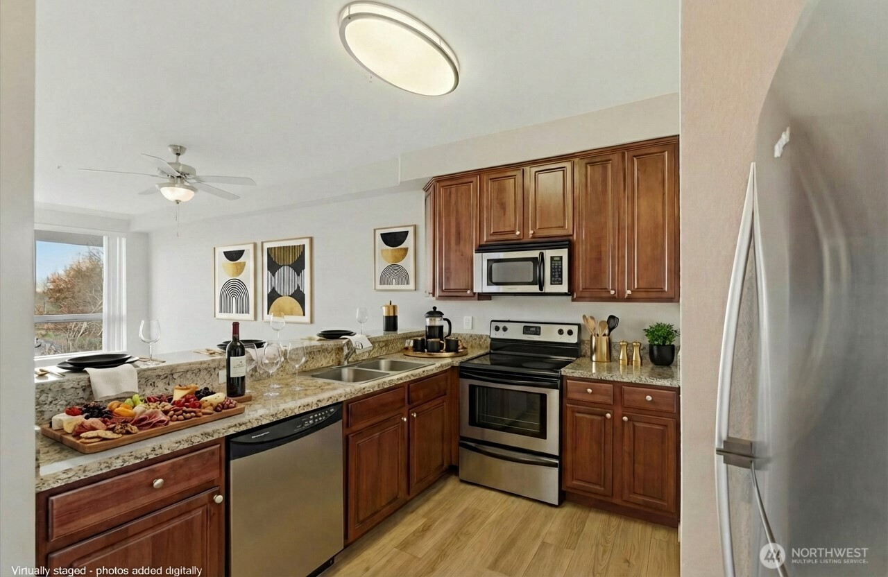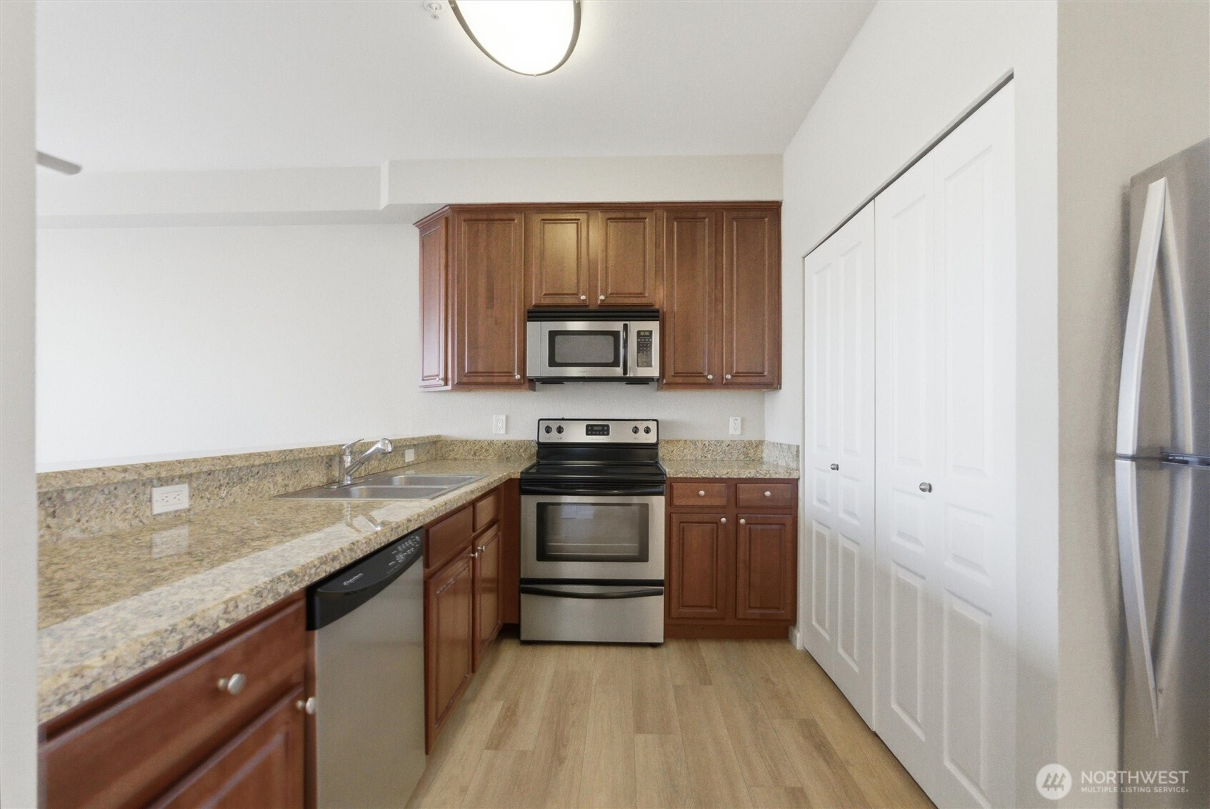 Revo 225 offers modern condominium living, a fully secured building designed for comfort, privacy, and everyday convenience. Controlled key access is provided throughout the property, secured lower parking garage/W direct building access and a key-activated elevator—for a streamlined and secure arrival experience. This unit overlooks the landscaped central common-area courtyard. Residents enjoy a well-appointed collection of on-site amenities, including a fitness center, private boardroom, resident lounge, and a centrally located outdoor courtyard with BBQ. All residential units are situated above ground level, with parking and street-level commercial spaces below, enhancing security while providing separation from street activity. The location offers convenient access to a variety of restaurants, cafés, and shopping destinations, all within walking distance or a short drive. A newly completed public park sits immediately adjacent to the building, with an outdoor market currently under construction nearby. Revo 225 minutes from Evergreen Medical Center, Valley Medical Center, Boeing Renton Field, and the retail, dining, and services at Renton Landing, with easy access to major employment centers and transportation routes. Revo 225 may appeal to buyers seeking ownership in a secure, amenity-rich community in a well-connected Renton location. No rental cap. Non-warrantable condominium. Financing options available for qualified owner-occupants. Contact listing broker for details