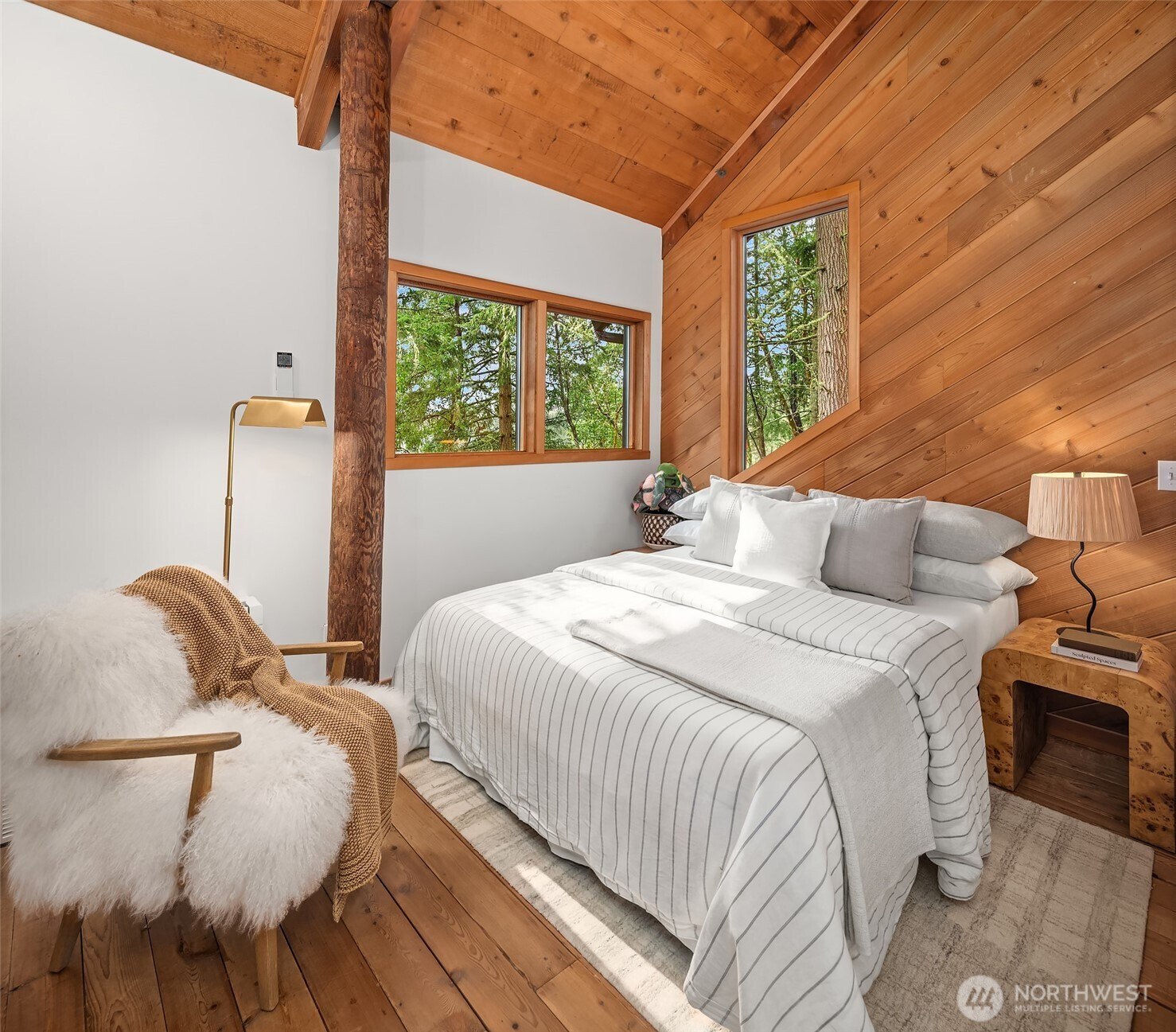 Set on 2.7 private acres in central Misty Isle, across from acres of King County parkland, this beautifully remodeled wood-sided home is a rare blend of Northwest modern design, warm natural materials, and an exceptional Vashon Island setting. Level lawns, beautiful trees, and abundant natural light create a property that feels both peaceful and expansive, with privacy, sunshine, and easy access to town, schools, and both ferries. Inside, vaulted ceilings rise above fir and spruce tongue-and-groove floors, CVG Douglas fir trim, clear-finish wood doors, and warm pine paneling, giving the home a soulful, grounded elegance. Fully remodeled by Corey McIntyre Construction, the 3-bedroom, 2-bath layout includes a custom kitchen with painted Omega shaker cabinetry, quartz counters, farmhouse sink, and beautifully updated baths with reclaimed wood vanities, stone counters, tiled showers, and a soaking tub. New heating and A/C system, private well, irrigation, detached one-car garage, and a 560-square-foot detached studio with electricity add comfort and flexibility for work, art, fitness, or guests. The neighboring 4.5-acre parcel of rolling fenced pasture is also available for sale, offering a rare opportunity to expand the estate. A private, design-forward island retreat in one of Vashon’s most coveted locations.