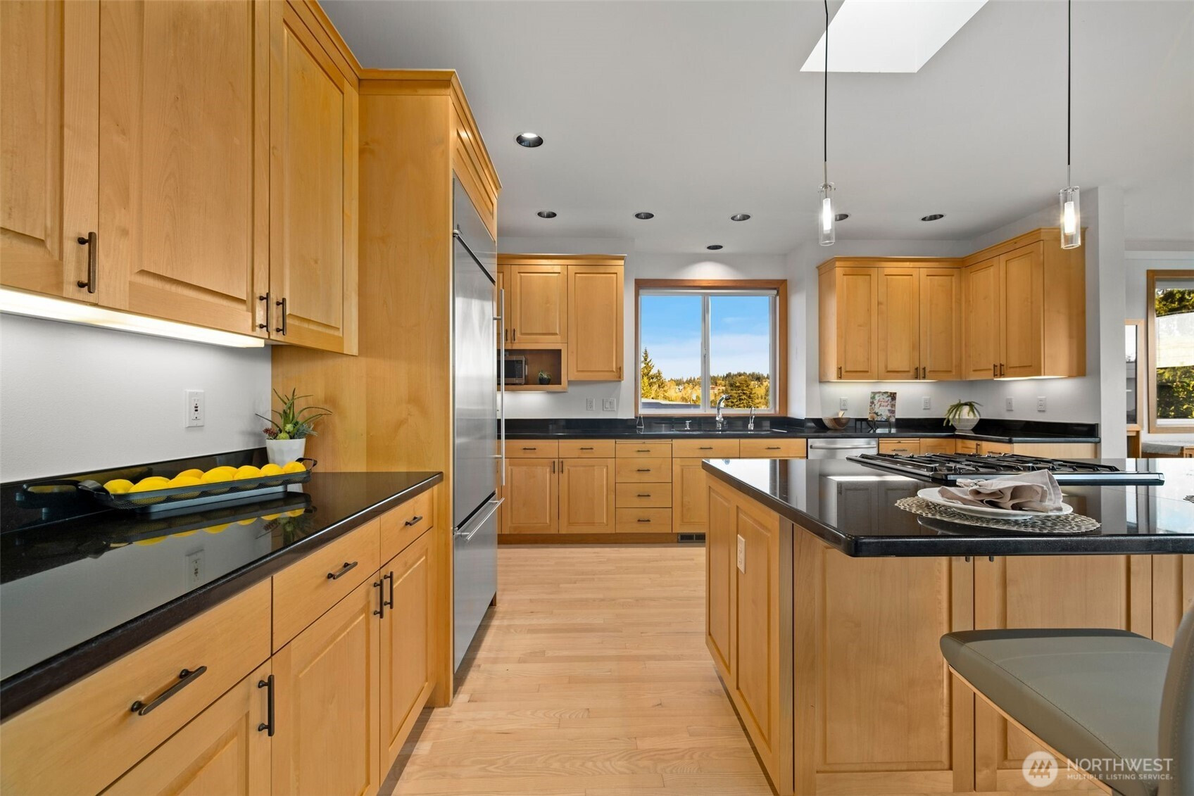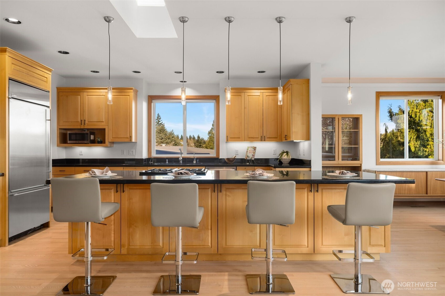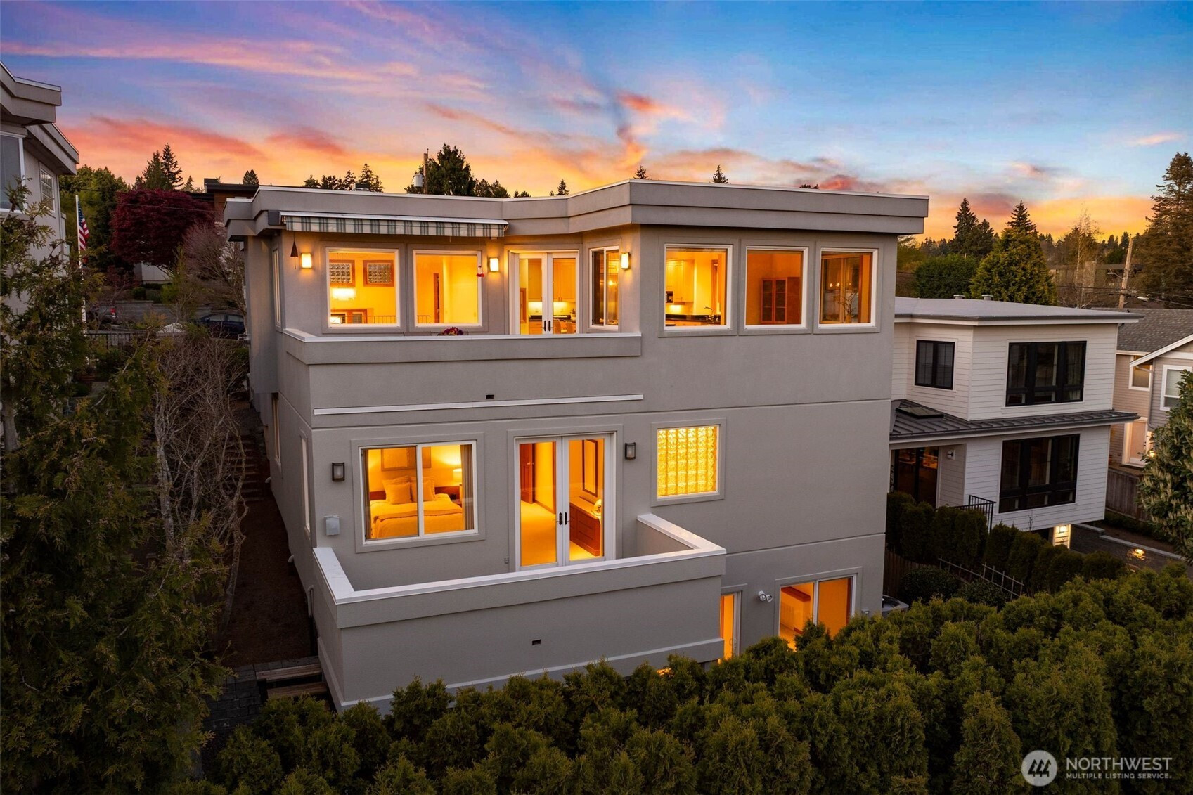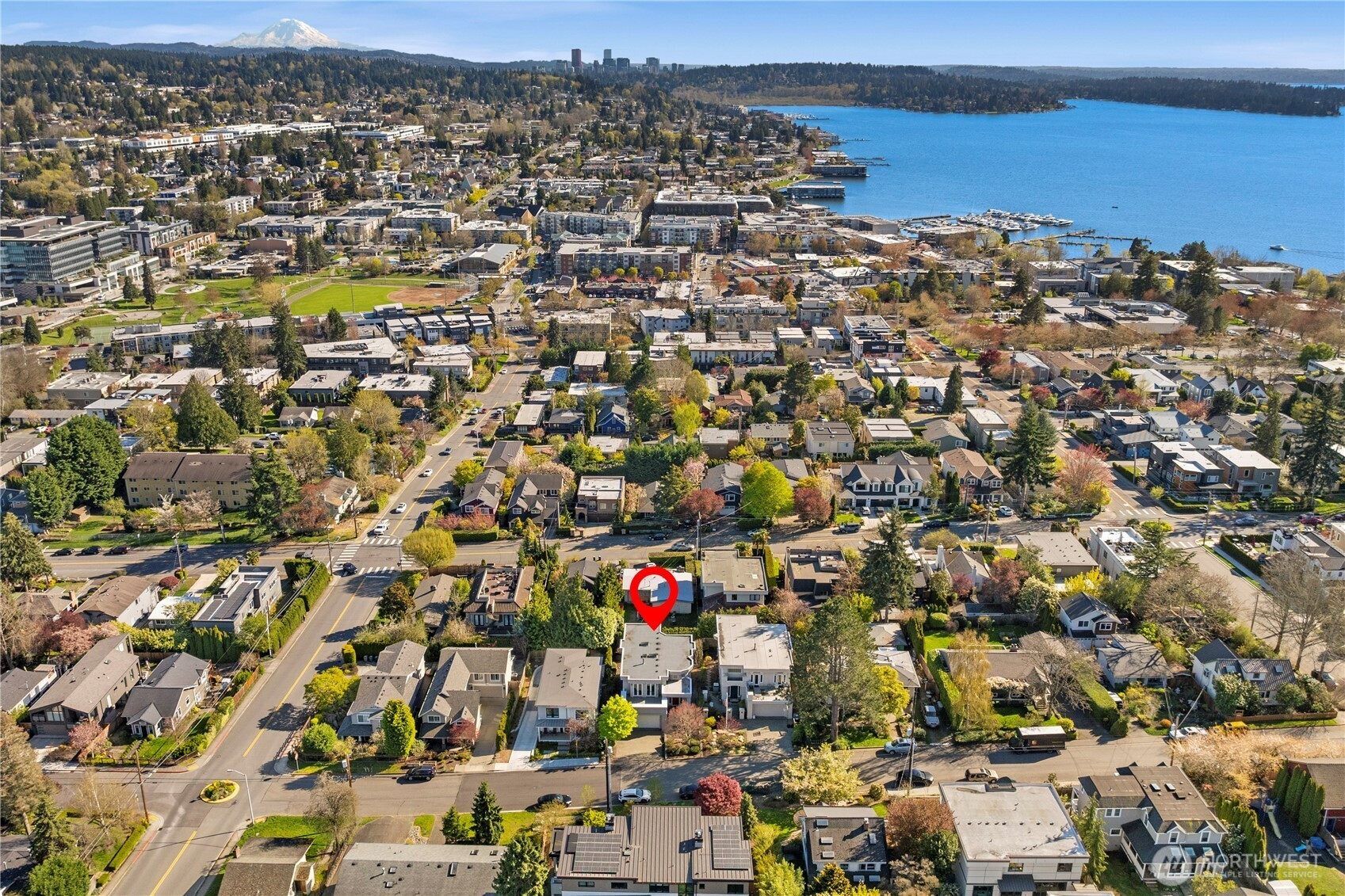 Set just above charming downtown Kirkland, this 6 bedroom Northwest Contemporary offers a sense of ease from the moment you arrive, with soft natural light, clean lines, and glimpses of Mt. Rainier, the Bellevue skyline, and surrounding greenery. Life unfolds naturally on the main level, where rich hardwood floors lead you through open yet defined spaces designed for gathering and day to day living. The kitchen becomes the natural place to linger, anchored by alder cabinetry and generous workspace, with a thoughtful connection to both dining and living areas. Whether hosting friends or enjoying a quiet evening, the flow feels intuitive, extending effortlessly to the balcony where sweeping views create a memorable backdrop. Just beyond, additional living spaces offer flexibility, making it easy to shift between work and connection throughout the day. The main level primary suite is set apart, offering a quieter place to unwind, with a spa-like bath that encourages a slower pace. Three additional bedrooms and a well-placed laundry room complete the level with everyday convenience. Downstairs, the home opens up to even more possibility, with space that can evolve into a private ADU or remain as an extension of the home for guests, longer stays, or multi-generational living. Thoughtfully designed and easy to live in, this home balances openness with privacy, all within moments of parks, beaches, and the energy of downtown Kirkland.