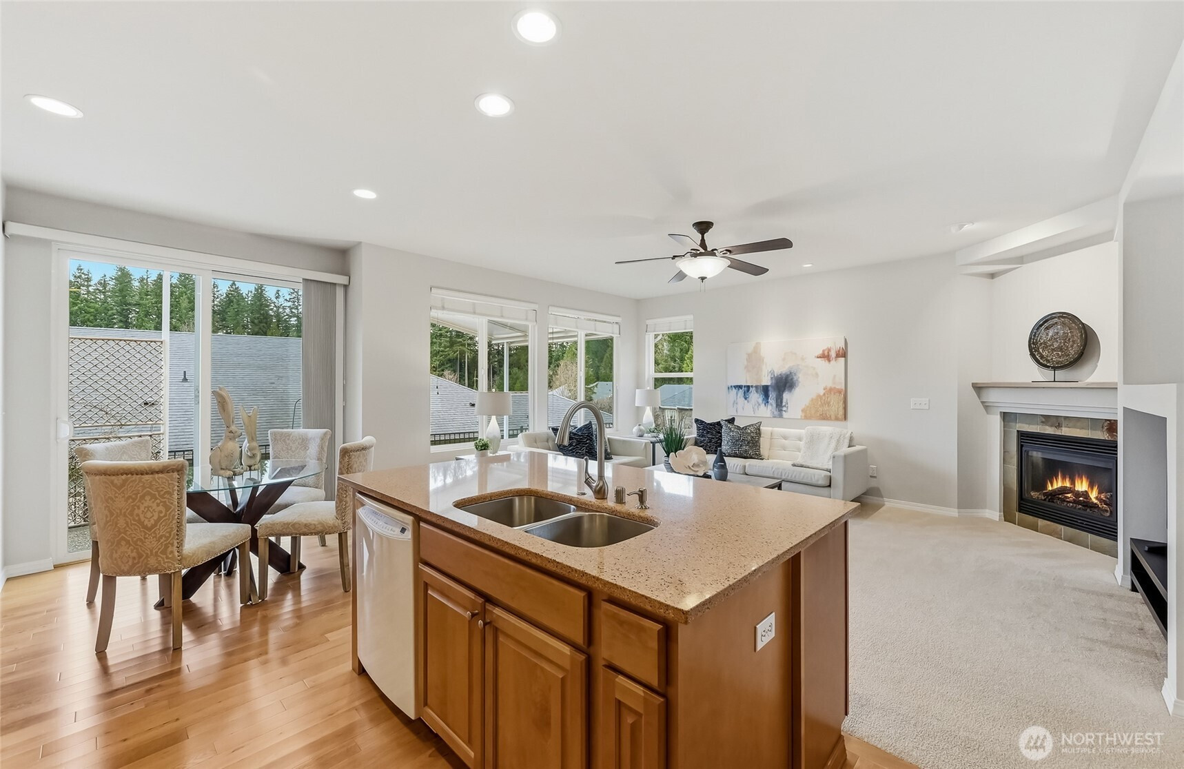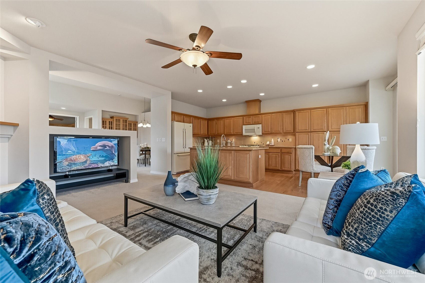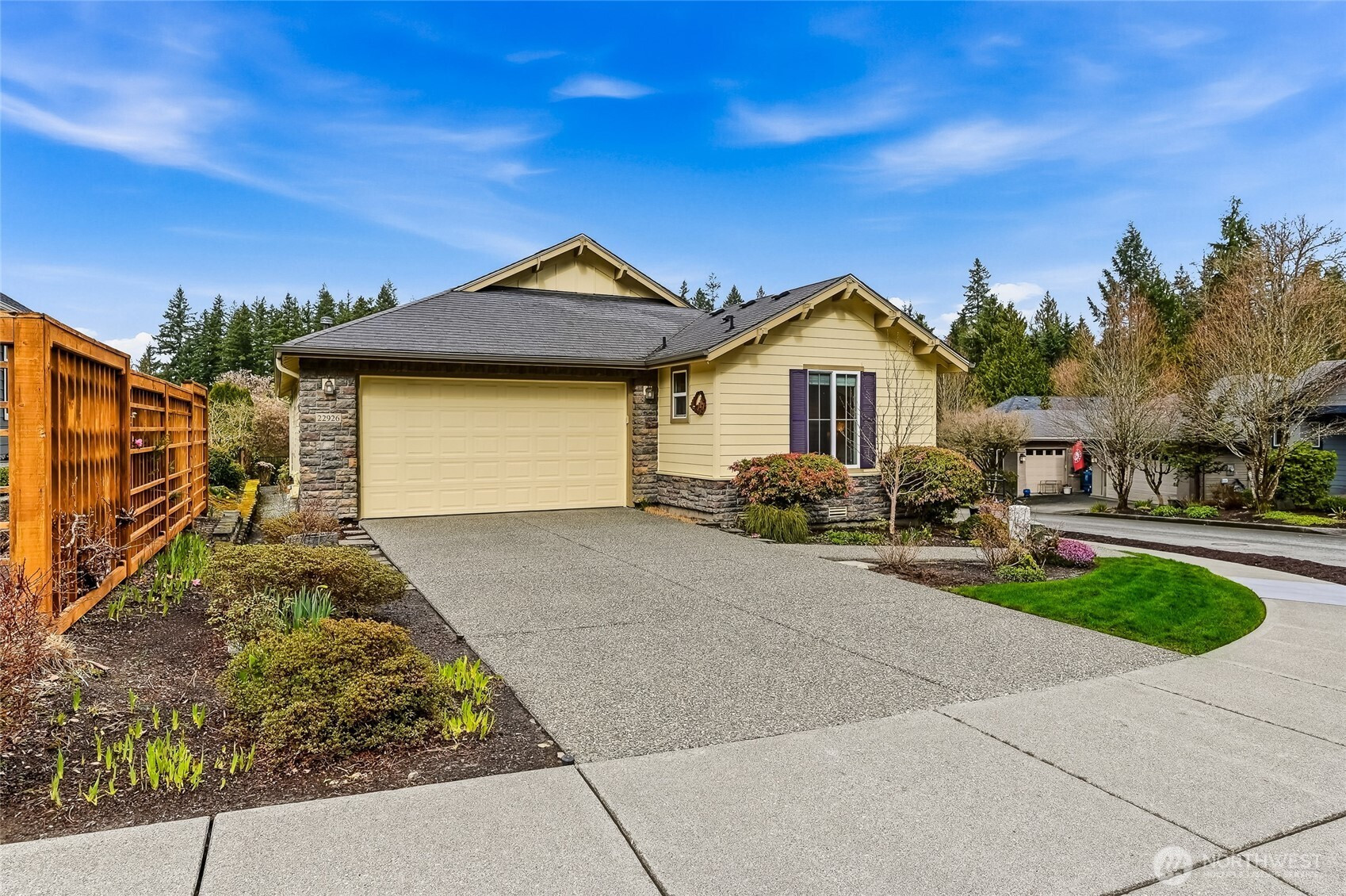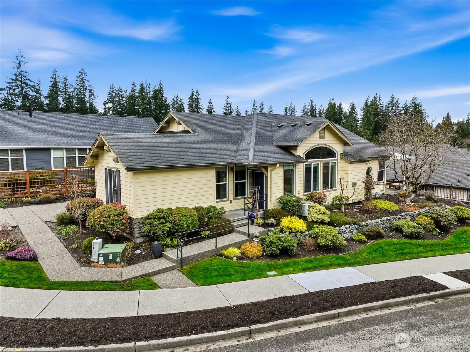 Live the 55+ Trilogy resort lifestyle in this beautiful, one level Vancouver plan home that showcases the perfect balance of privacy and space. Set on a beautiful corner lot, above the street, you’ll enjoy light filled spaces and big sky views. Built for entertaining with a large dining room w/a beautiful built-in buffet & display cabinet and living room that are open to the great room so there is plenty of room to host holiday dinners and neighborhood get-togethers. Kitchen with ample cabinetry, large island w/a 2nd row of cabinets below, pendant lighting, a double pantry and breakfast nook. Cozy gas fireplace & large TV niche in the family room. Step out to the oversized patio, w/built-in seating and a clear cover where you can relax with friends and BBQ year-round. Carefree living with front & side yard maintained by HOA. The primary bedroom easily accommodates a king-sized bed and full-sized furniture. The en-suite bath has a dual sink vanity, step-in shower, private toilet room and a walk-in closet with organizers. The office has a built-in Murphy bed/desk combo and a wall of bookcases and storage. Second bedroom is adjacent to the full bath provides your guests with their own retreat. Laundry room has a utility sink. The garage has a work bench and overhead storage. Room to park 4 cars in the level driveway! The PNW’s flagship 55+ community w/a beautiful clubhouse, fitness center, indoor pool & walking track, pickleball & tennis courts and walking trails. Pre-inspected