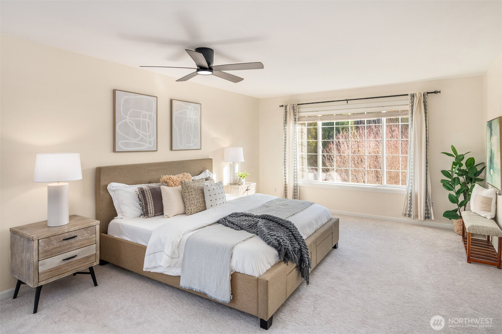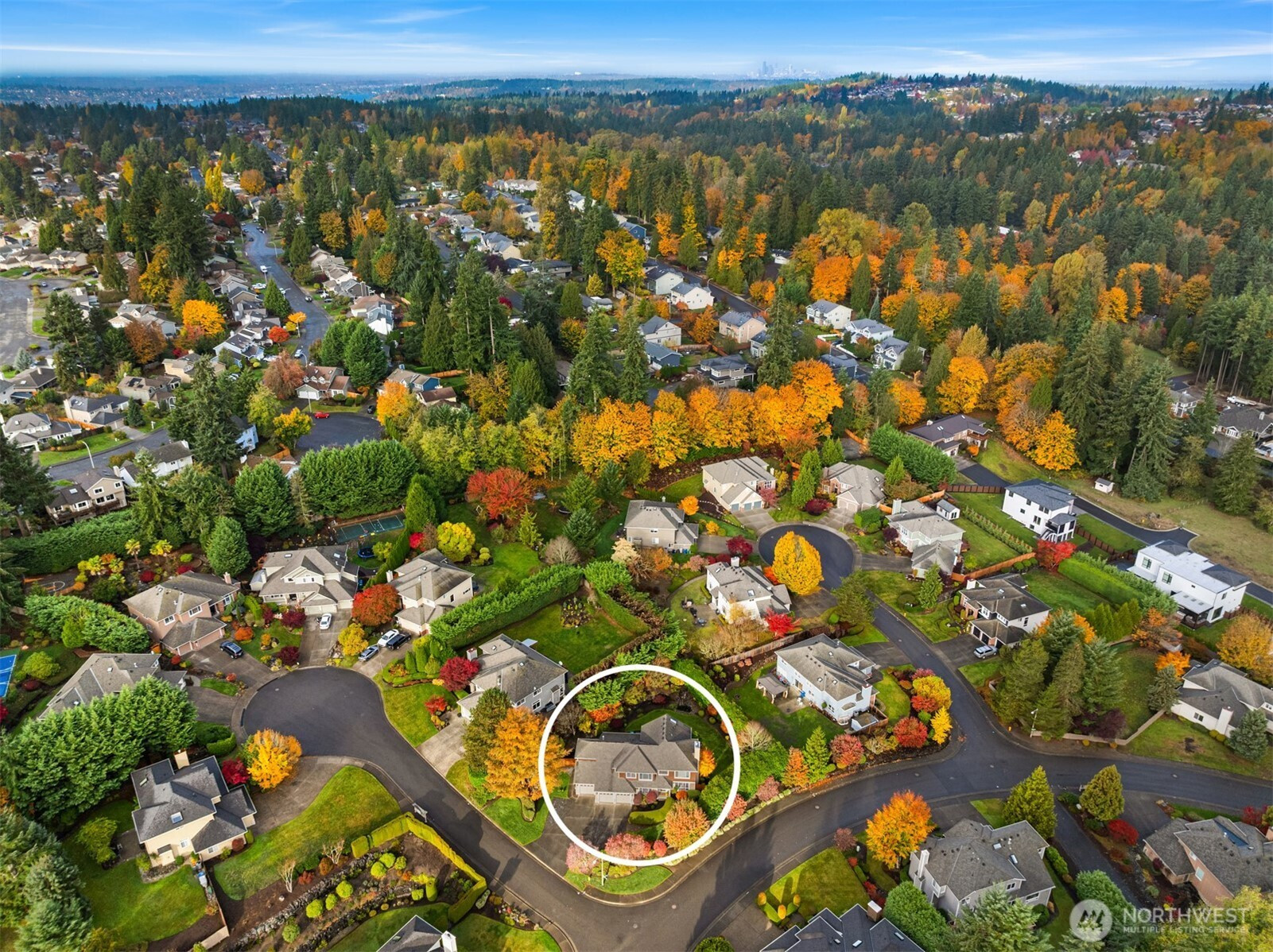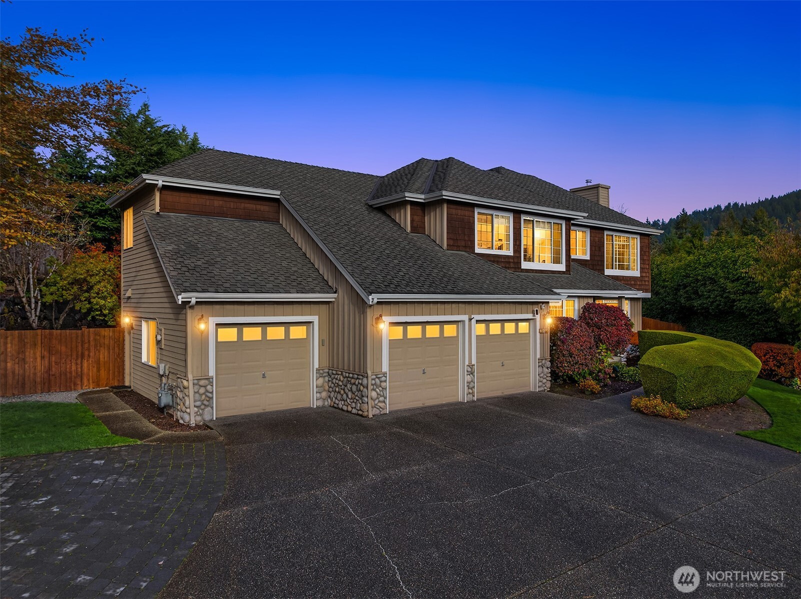 Welcome to this beautifully presented home in the sought-after Stonegate community of Renton Highlands. Situated on a generous corner lot, this residence offers exceptional privacy, space, and tranquility in a small upscale neighborhood known for manicured homes and pride of ownership. The expansive backyard is a true retreat, featuring a serene water feature, lush landscaping, and a spacious patio, perfect for summer BBQs, gatherings, or quiet evenings surrounded by nature. Enjoy peaceful views of Cougar Mtn and the feeling of privacy on all sides. Inside, the home showcases an open floor plan that flows effortlessly, designed for both everyday living and entertaining. A private dining room off the kitchen creates the ideal setting for hosting dinner parties and special occasions, while two fireplaces add warmth and a cozy, inviting atmosphere throughout the home. The primary suite is generously sized, featuring a spa-like bathroom and a thoughtfully designed custom closet system. Fourth bedroom can be a bonus room, while a dedicated main-level office provides an ideal work-from-home environment. The kitchen is both functional and welcoming, featuring stainless steel appliances, ample storage, and a dedicated pantry. The three-car garage includes an electric vehicle charging station, and the home is pre-wired for a generator, offering added peace of mind and future-ready convenience. Located in the Issaquah SD. Just minutes to trails and shopping.