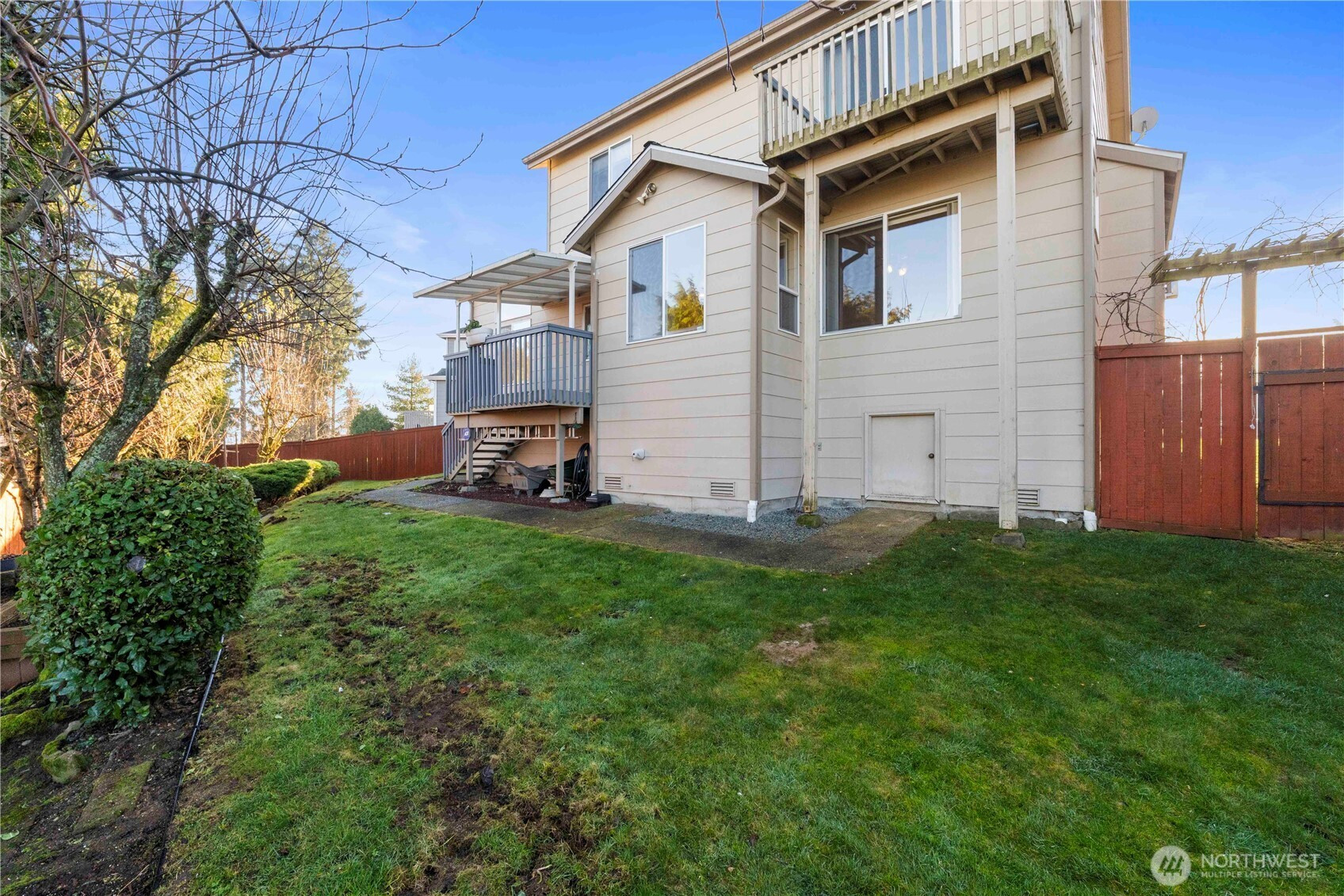Welcome to the highly desirable Heritage Woods neighborhood. Located in a cul-de-sac with views of the Puget Sound and Olympic Mts. This is the first time this home has been on the market with lots of perks starting with a new roof in 2020, a furnace in 2025 and a new dishwasher. This home offers a open concept layout, vaulted ceilings and lots of natural sunlight. Enjoy the views with your coffee on the primary's balcony or the main covered balcony off the kitchen with a natural gas BBQ hookup. The office on the main floor has plenty of room to work from home or make it a fourth bedroom. This home offers lots of the love in the terraced garden with a sprinkler system in the front & back yard. Fig & plum trees, blueberries and lots of room to plant your veggies. Take advantage of the additional square footage in storage room under the house. All appliances stay including the garage freezer. Community park just down the street and just minutes from I 5.