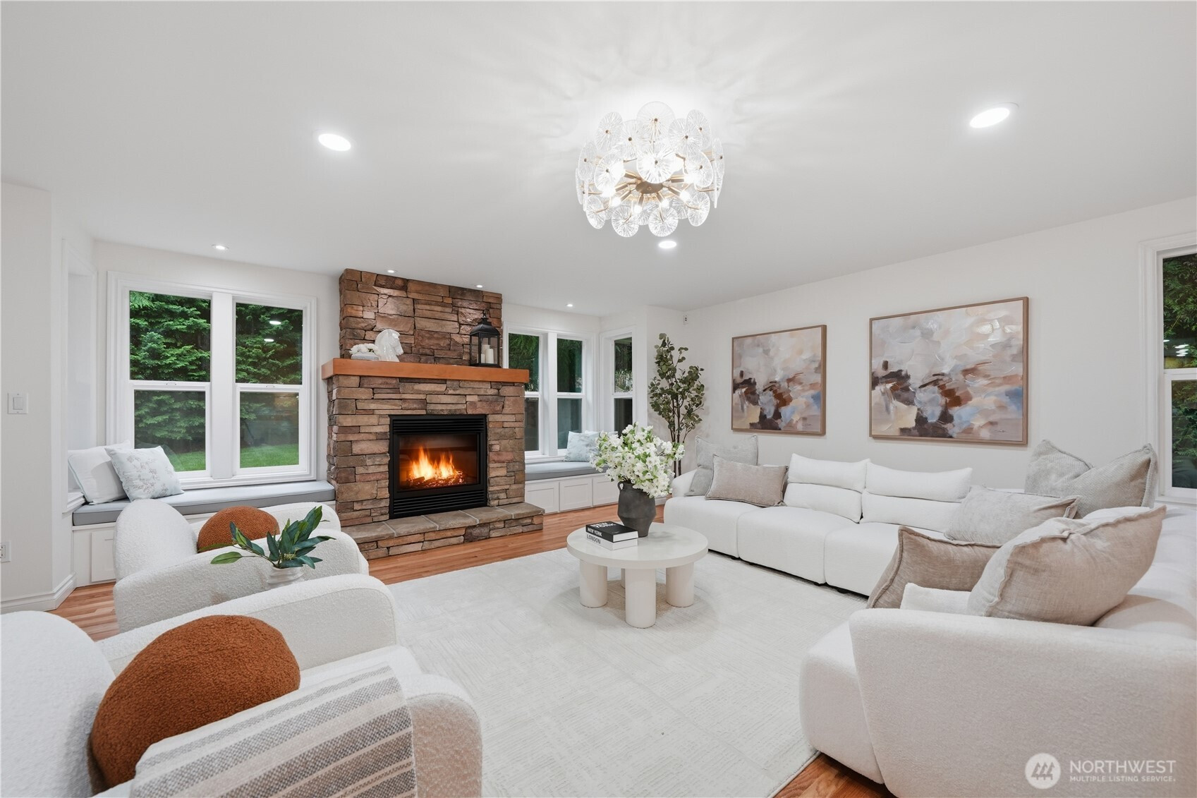 Welcome home to sought-after Summer Ridge and this extensively updated residence on one of the largest lots! This 5-bed 2.5 bath home is designed for comfortable everyday living and effortless entertaining. Vaulted ceilings at entry and formal living create a bright and airy first impression. Walls of windows and skylight bring in abundant natural light. Chef’s kitchen features new quartz counter tops, new SS appliances, an island, and a gas range, with formal dining right next to it. The spacious adjacent family room features a gas fireplace and a sliding door to an oversized Trex deck and a paver patio w/ a fire pit for outdoor living. Den w/ a wood-burning fireplace and an updated half bath complete main floor. Upstairs, primary bedroom offers a spa inspired 5-piece bath boasting quartz countertops, beautiful tile work, a freestanding soaking tub, trendy designer touches. Four other generous bedrooms and a full bath w/ double vanity rest on the upper floor. Spacious 2-car garage, plus a shop for hobbies or extra storage. AC installed 2021. Level 2 Tesla charger. New interior paint. Refinished hardwood floors, new lawns front & back, and many new lighting features. One block to community park. Top rated Lk Washington schools including McAuliffe Elementary within walking distance. Easy access to Microsoft, Amazon and Meta campuses, groceries, shops, restaurants, and transit. It delivers everyday accessibility while preserving a peaceful residential setting.