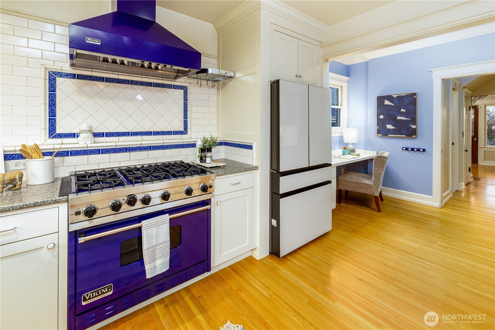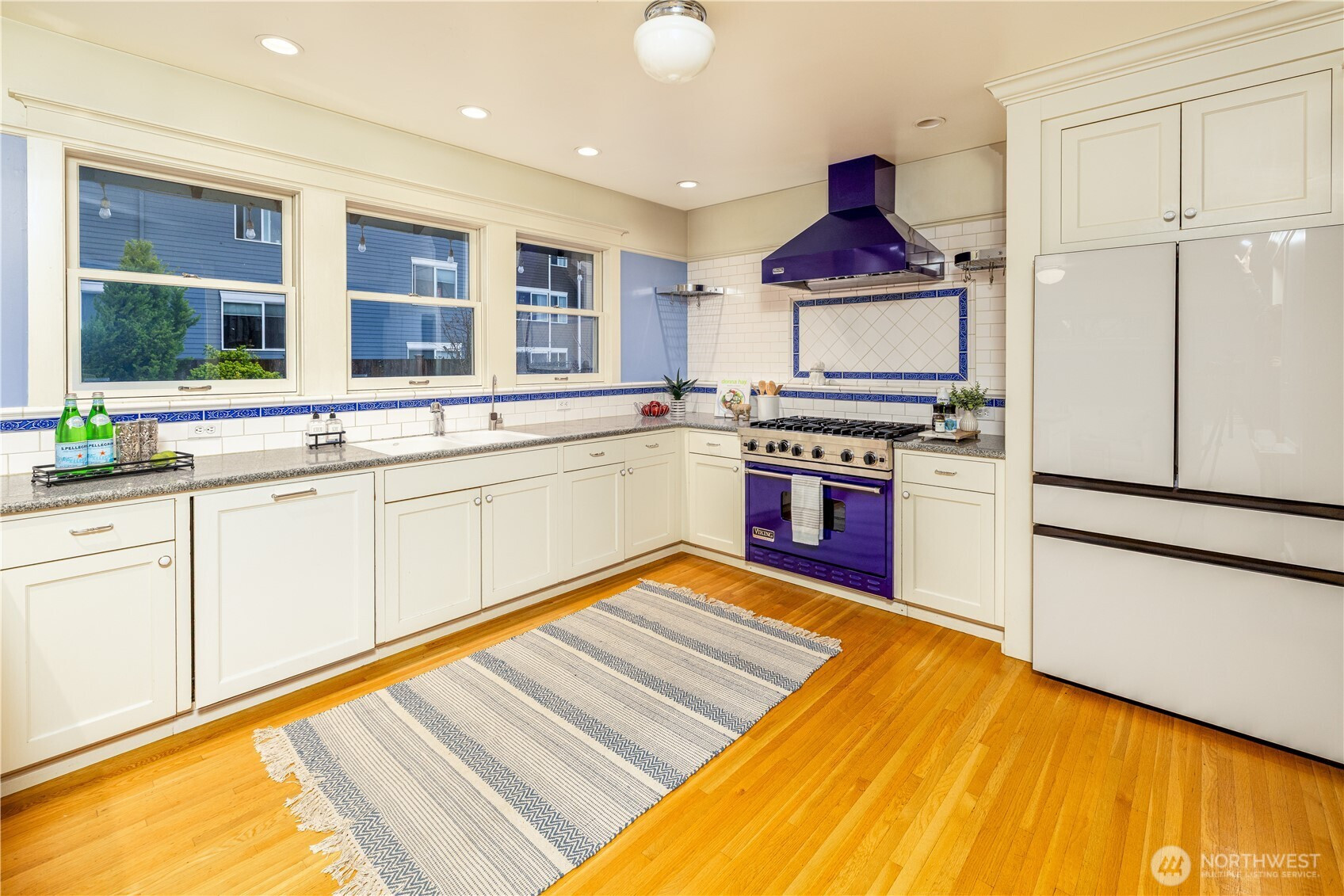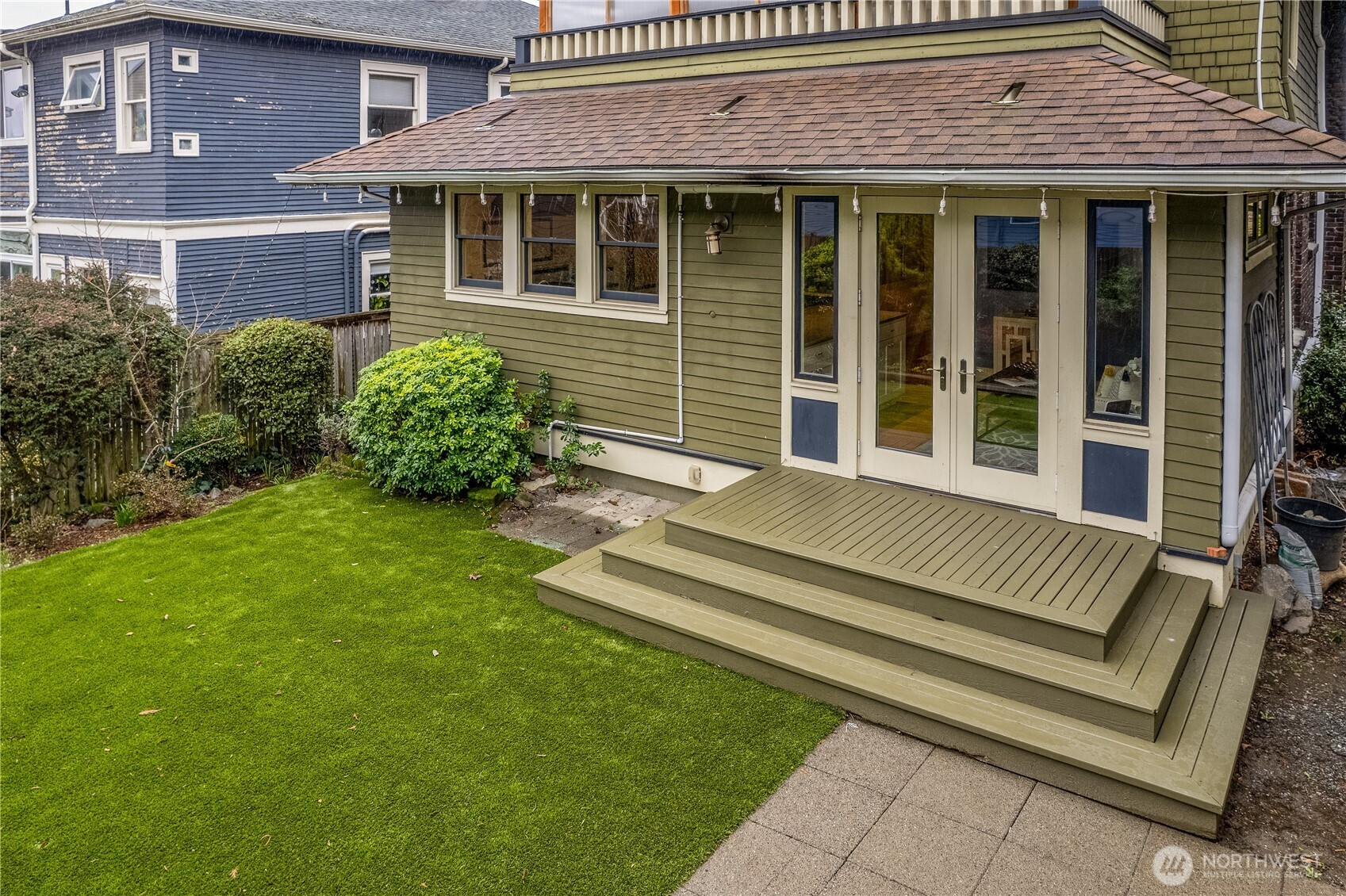 Perched high above the street, this timeless 1906 Craftsman captures sweeping views of the Cascades, Lake Washington, and Husky Stadium. A deep covered porch welcomes you into a stately foyer with rich woodwork, a grand staircase, and beautifully preserved top-nailed oak floors. The light-filled living room features coffered ceilings, leaded glass windows, and an original stone fireplace with gas insert. The dining room flows into an expansive kitchen with a 6-burner Viking gas range, built-in cabinetry, and office nook. Designed with a great-room feel, the kitchen offers space for a sitting area or generous breakfast room, with French doors opening to the deck and serene backyard. Upstairs are three spacious bedrooms and a retreat-like marble full bath. The primary accesses its own covered patio through French doors that can be enjoyed all year. The lower level offers abundant storage, a large rec room, and laundry area. A rare opportunity in coveted North Capitol Hill!