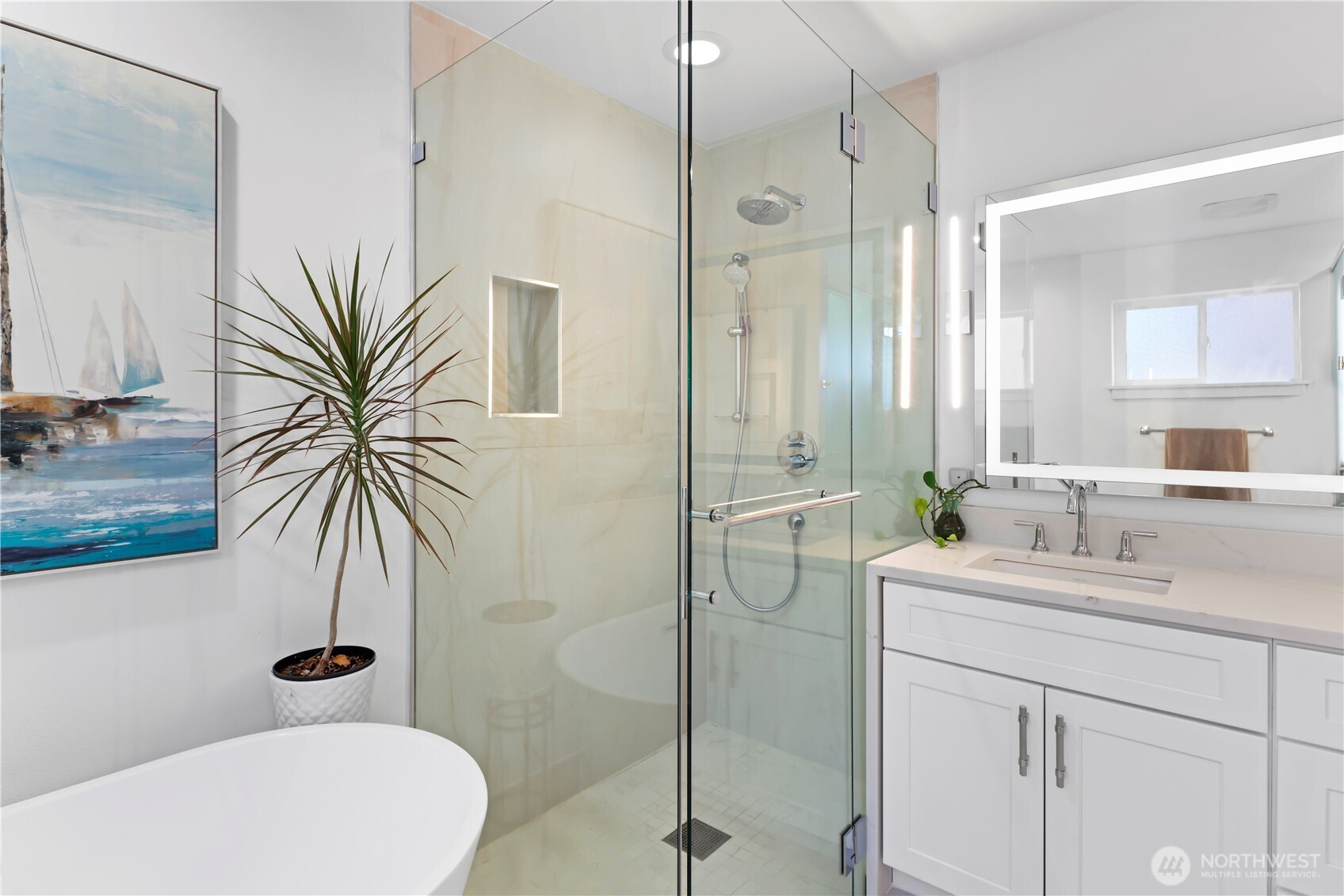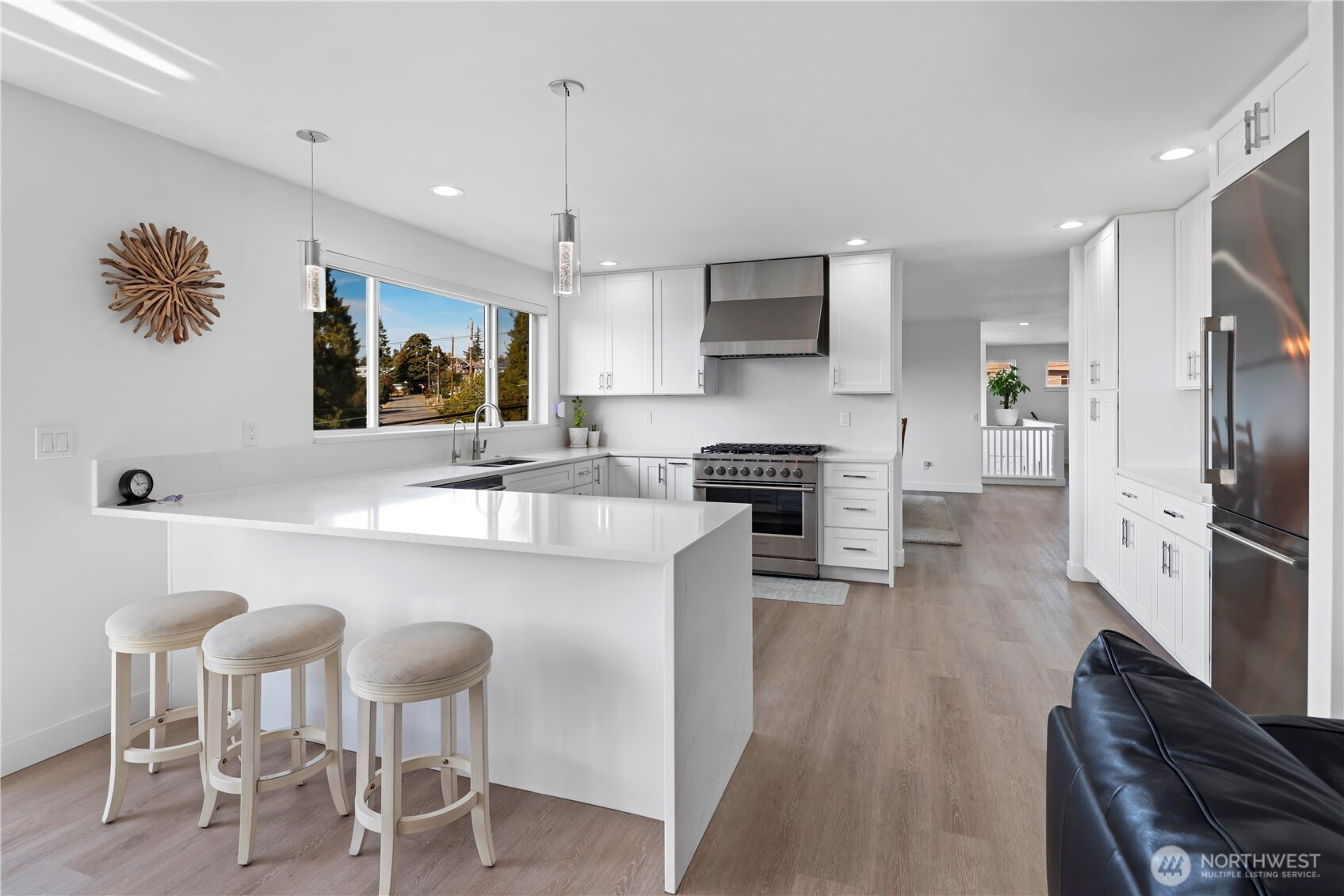 Modern Elegance Meets Timeless Views from this beautifully remodeled Richmond Beach home. Thoughtful upgrades include a dream kitchen w/ quartz waterfall counters, slab backsplash, Fisher & Paykel appliances, butler’s pantry & beverage fridge. Spa-inspired baths feature custom tile, heated mirrors, & a luxe primary en-suite w/ freestanding tub. Throughout the home: new LVP floors, paint, trim, recessed lighting, remote blinds, & expanded fireplace. Comfort upgrades: central AC, new water heater, updated electrical; all add peace of mind. With generous windows framing ferries, Orcas & mountains, & a fabulous community, parks, & top-rated Syre & Einstein schools, this home is a rare blend of style, comfort & setting! Pre-inspected.