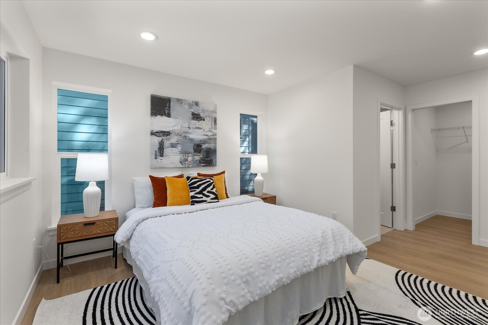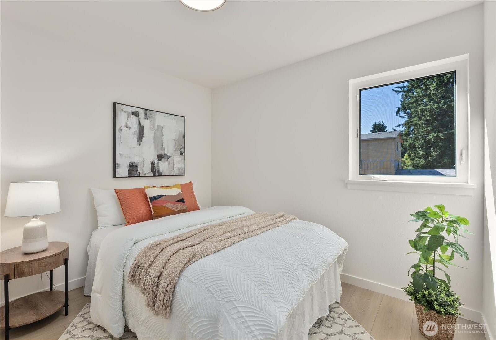 Located in a quiet friendly neighborhood, this 2025 stunning designer corner lot home makes an impression with a cozy kitchen and living room. Private fully fenced yard perfect for a entertaining friends. Bonus front yard to build small shed or garden. Upstairs three bedrooms with two baths. One car garage with ample storage. Location close to I-5, public transport and light rail. Low 4.125% rate to make this your starter home or investment property