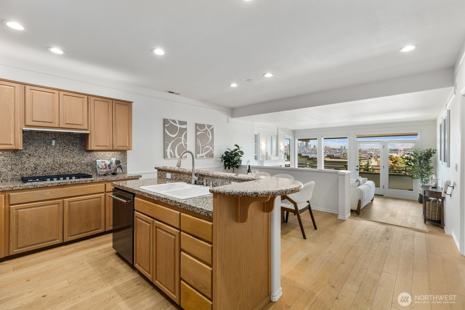 Welcome to City Lights on Harbor, where comfort meets iconic views. This bright and spacious 2-bedroom, 2-bath condo with a versatile bonus/flex room offers convenient single level living just one easy flight down from the parking area. The open concept kitchen features granite countertops, generous cabinetry, and a dining area that seamlessly connects to the inviting living room with a cozy fireplace and built-in storage and gorgeous views.The expansive primary suite includes a walk-in closet and a luxurious 5-piece ensuite bath, while the large den/flex space is perfect for a home office, media room, or guest retreat. Step onto your private covered balcony and take in breathtaking 180° views of the Seattle skyline, Elliott Bay, the Space Needle, and the Great Wheel, perfect for enjoying sunrises, sunsets, and fireworks.Additional highlights include a detached garage, an assigned uncovered parking space and ample guest parking. Ideally located in West Seattle, just minutes to Alki Beach, downtown Seattle, and a variety of local shops, dining, and amenities.