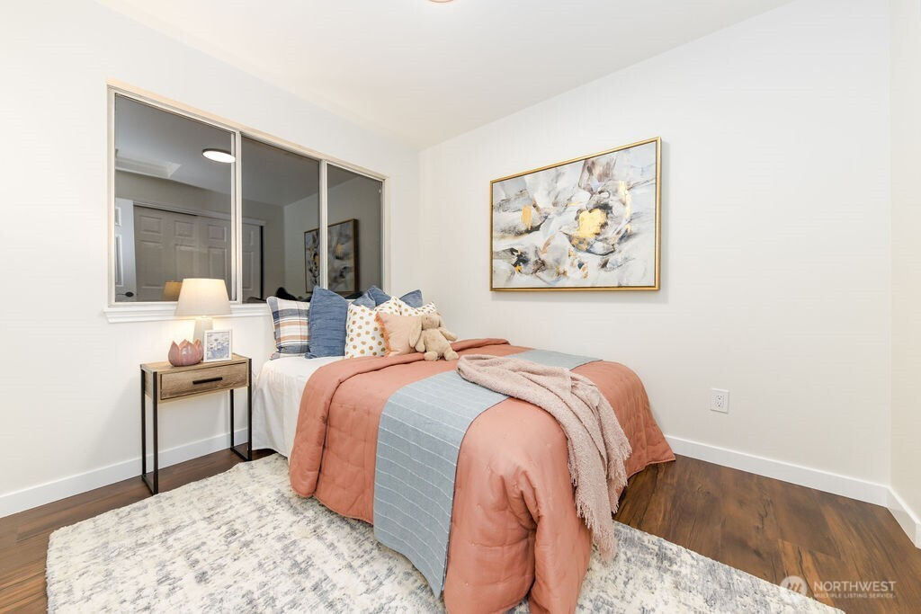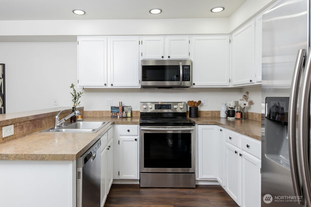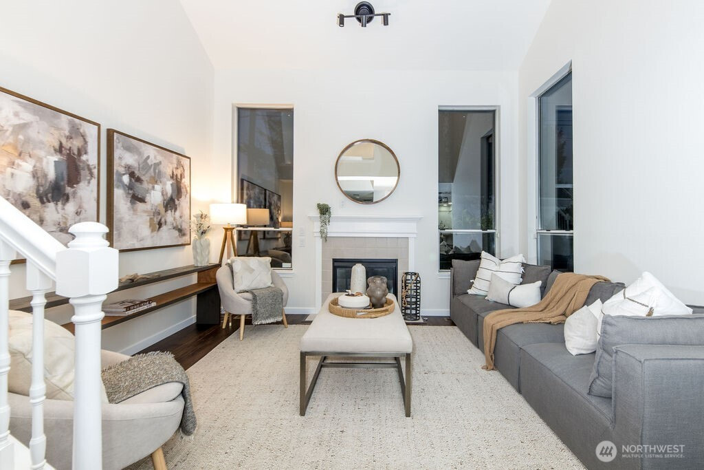 Beautifully renovated 1,416 sq ft two story townhome in the desirable Le Blanc community of Kent. Features vaulted ceilings, premium LVP flooring, recessed lighting, and a cozy gas fireplace. Open concept kitchen and living with a main floor powder room and access to a peaceful backyard area. Upstairs offers a loft, two bedrooms, and two full bathrooms. Enjoy a newer roof, an attached garage with storage, low HOA dues, and close proximity to shopping, schools, freeways, and transit.