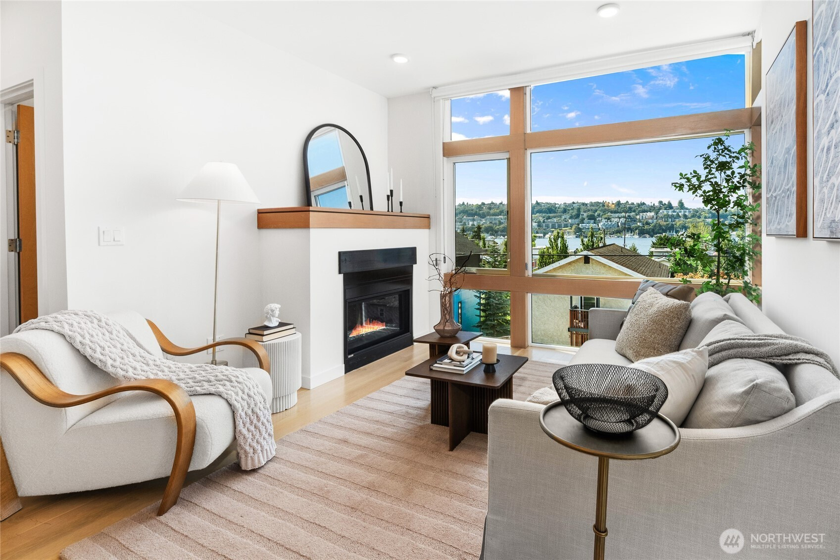 Welcome to this Eastlake showstopper! Floor-to-ceiling windows w/ sweeping 180+ degree views of the city, Space Needle, Lake Union, & Olympic Mountains! Solid oak hardwood floors complement striking floating steel & glass stairs for bright, open living.Sleek & spacious kitchen boasts quartz countertops & SS appliances. Relax or entertain on the rooftop lounge w/ outdoor kitchenette. A/C for those hot summer days. Custom-built-ins & additional storage containers amplify space utilization. Primary w/ spa-like ensuite w/ heated floors. Two blocks to Lake Union for water enthusiasts. Short stroll to cafes, dining, & grocery. Moments to downtown & I-5 access. Complete w/ off-street parking & NO HOA dues! A perfect blend of style & modern luxury.
