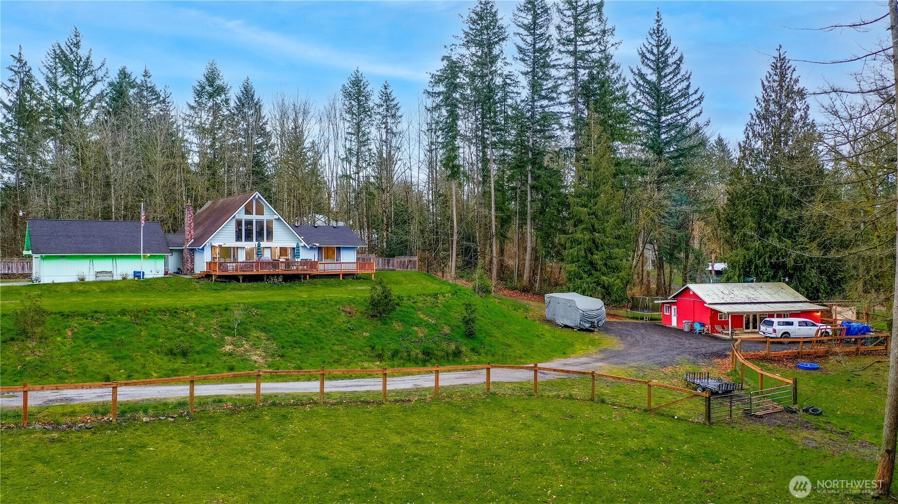 Tucked away at the end of a quiet dead-end road, this charming A-frame sits on 2.5 peaceful acres where wildlife roams and the pace of life slows down. Elk often wander through the yard, fruit trees (pear, peach, apple, and plum) dot the property, and the expansive Trex deck offers the perfect place to relax and take in the view of your land. Inside, soaring ceilings, exposed beams, and oversized windows fill the home with natural light and create a warm, inviting atmosphere. The updated kitchen features quartz countertops, stainless steel appliances, and a layout that flows easily into the main living spaces—perfect for gathering with friends and family. With 3 bedrooms, 2 bathrooms, and 2,050 sq ft plus a spacious loft, there is room for everyone. Outside is where this property truly shines. Entertain around the fire pit, unwind in the hot tub, or host unforgettable evenings in the finished barn—complete with a wet bar, fireplace, chicken coop, and flexible space for an office, studio, or hangout. Recent upgrades include new fencing, asphalt driveway, furnace, heat pump with A/C, updated electrical panel, crawlspace cleanout, and a new road leading to the barn. A massive 24x36 garage with large attic storage provides plenty of space for vehicles, tools, and toys. A rare blend of privacy, charm, and modern comfort in the award-winning Tahoma School District.